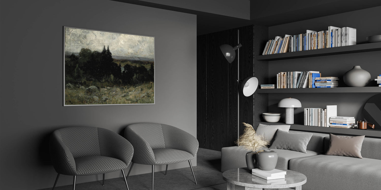 - This piece blends dark tones with nature, offering a versatile and calming visual experience for moody art decor enthusiasts.
