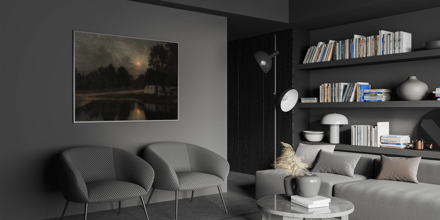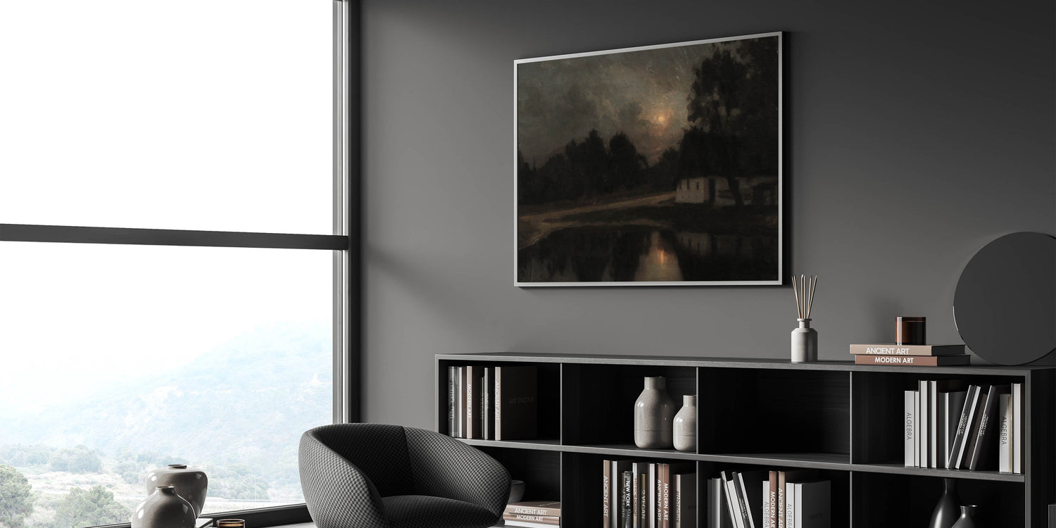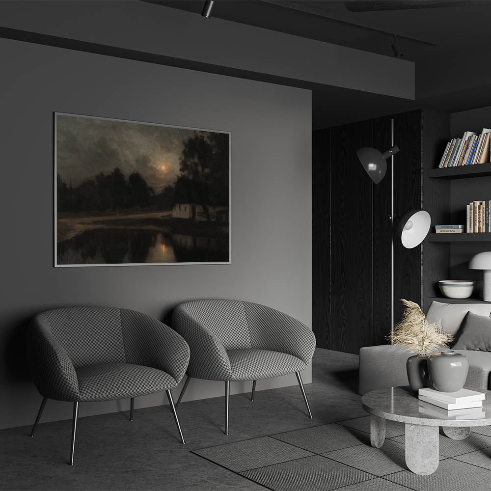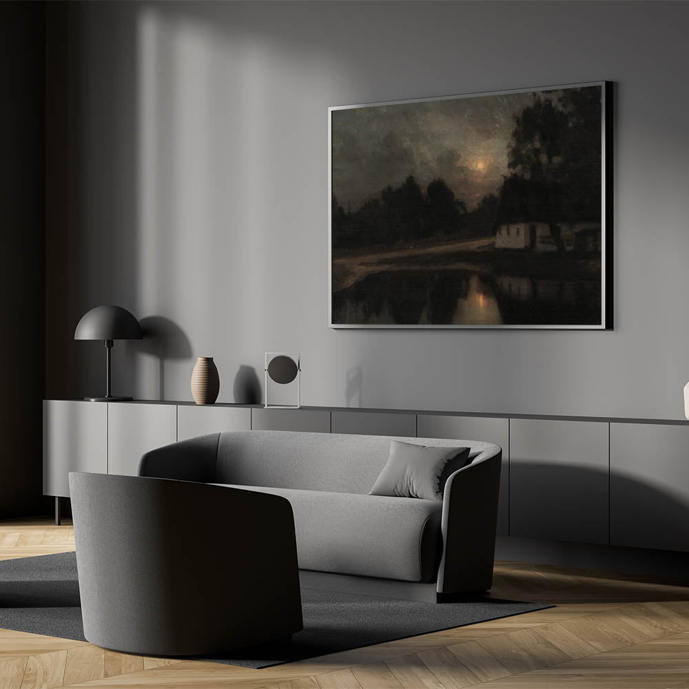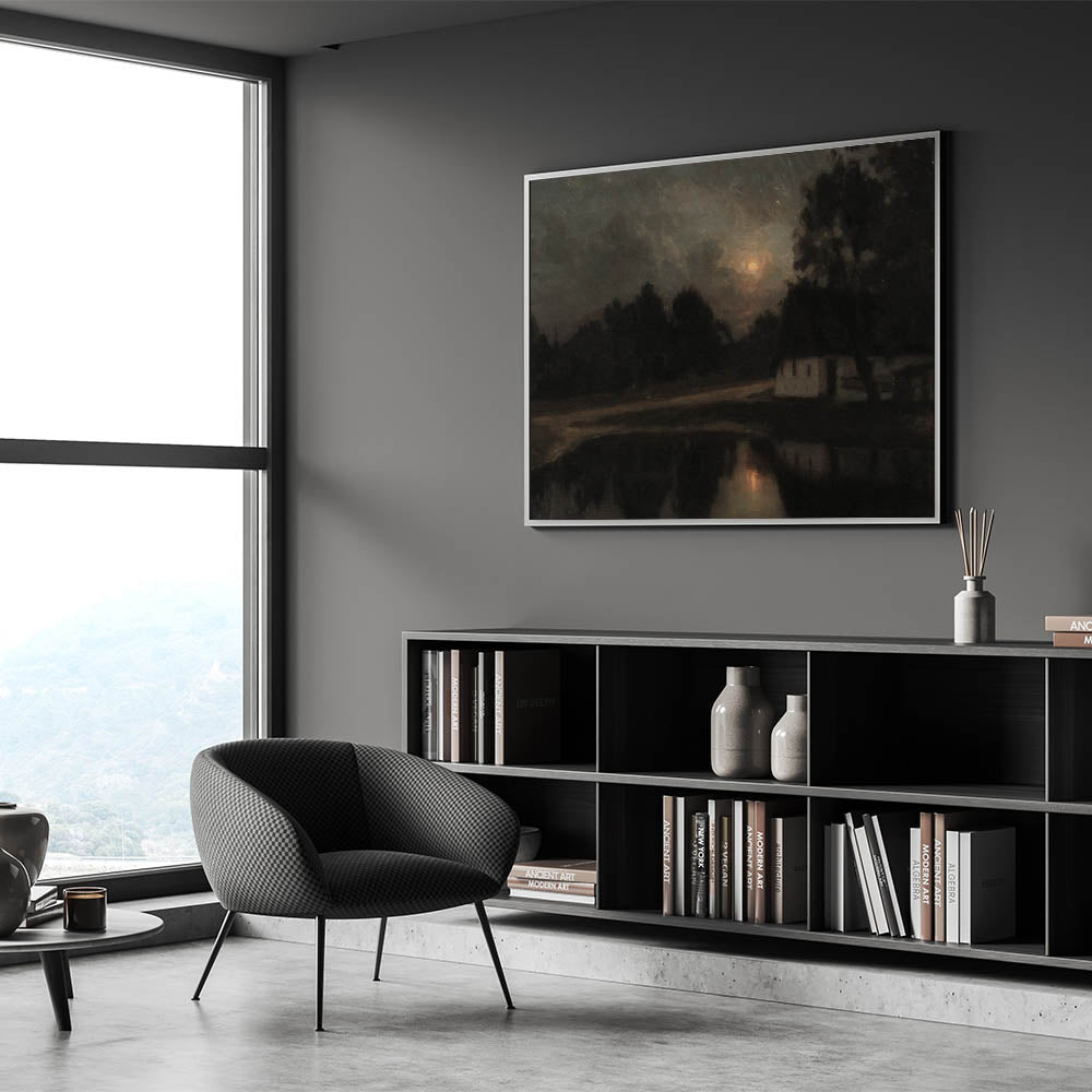 Create a tranquil and atmospheric ambiance with this Dark Moody Wall Art featuring a serene moonlit scene. This artwork showcases a quiet cottage by a still lake, enveloped in deep shadows and illuminated by the soft glow of the moon. The dark tones and muted palette give the piece a mysterious, almost ethereal quality, making it an ideal choice for those looking to enhance their living space with moody and contemplative art.