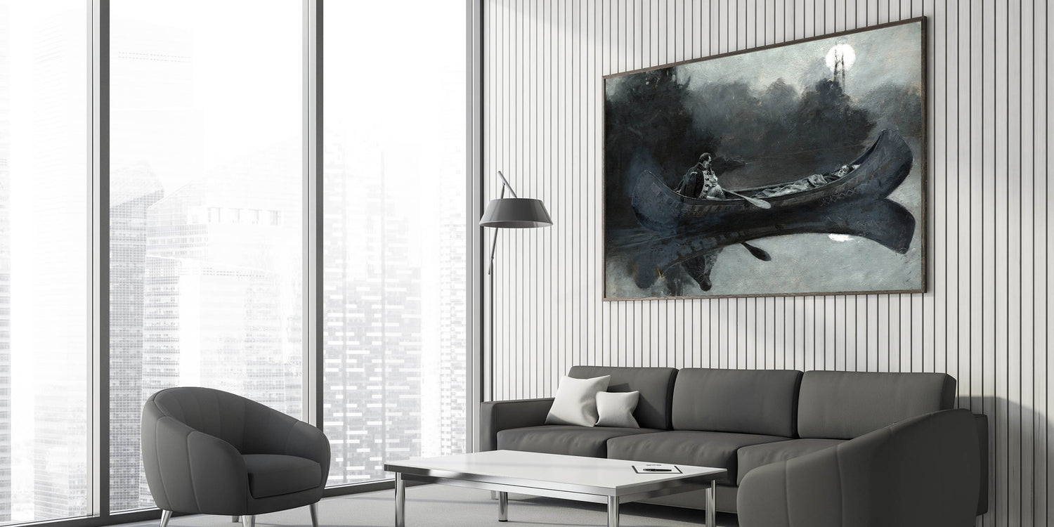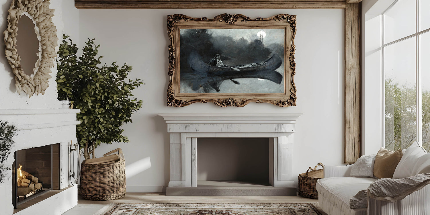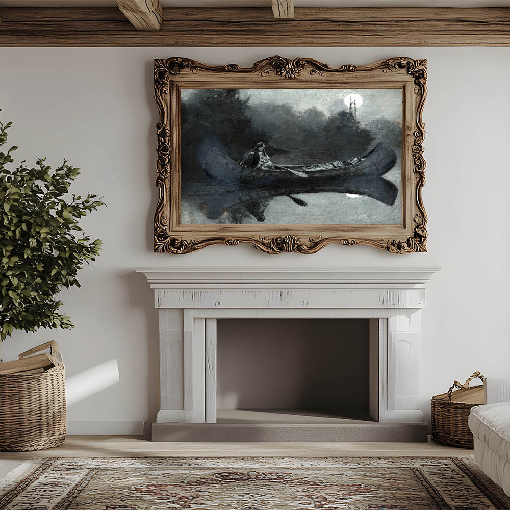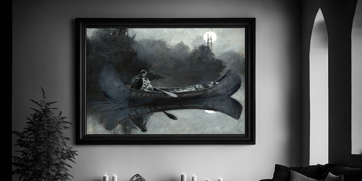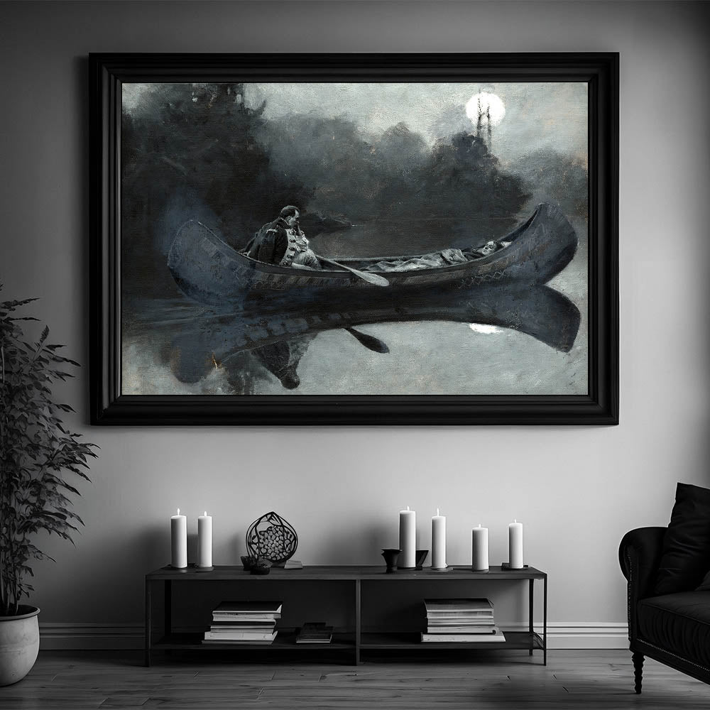 Immerse yourself in the Dark Moody Wall Art titled "Moonlit River Journey." This evocative piece portrays a solitary boatman navigating the still waters under a full moon, with a shrouded figure lying in the canoe. The dark, shadowy tones and ethereal light create a haunting atmosphere, ideal for anyone who appreciates dramatic art prints that tell a story. The reflective water and the misty forest backdrop enhance the mysterious and melancholic mood, making it perfect for adding depth and character to your space.