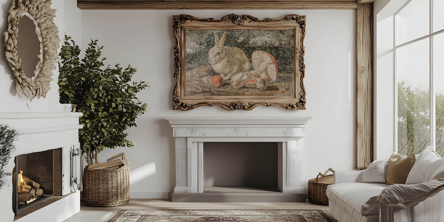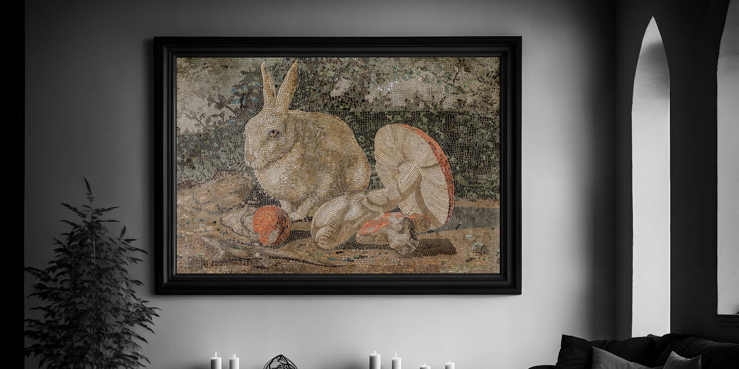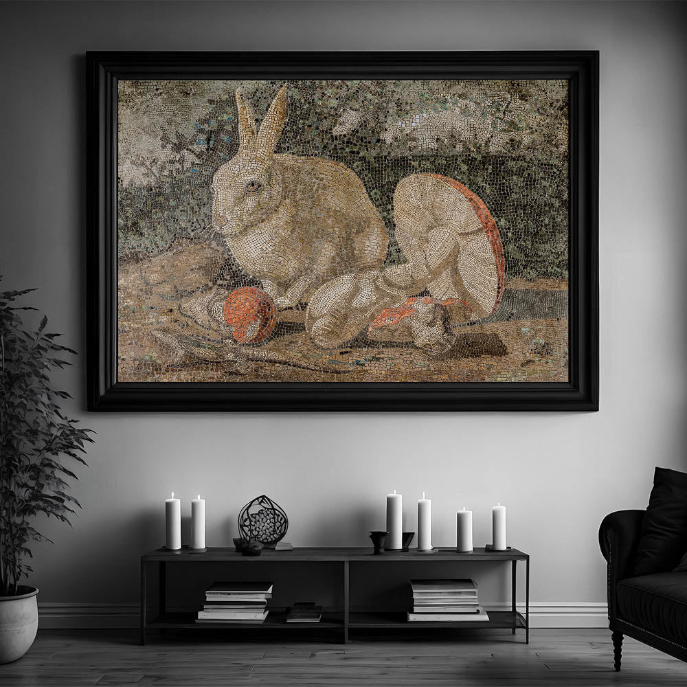 Elevate your interior with this captivating Dark Moody Wall Art, featuring an intricately detailed mosaic of a rabbit surrounded by mushrooms and natural elements. The piece combines earthy tones and dark moody shades, creating an atmospheric effect that enhances the drama of the scene. This timeless print is perfect for those looking to add a unique touch of artistic expression and elegance to their home decor, especially in living rooms, studies, or hallways.