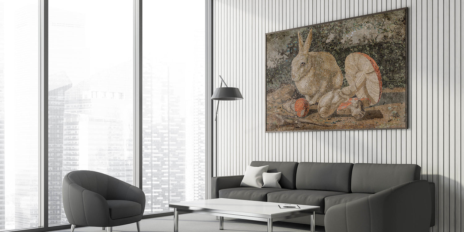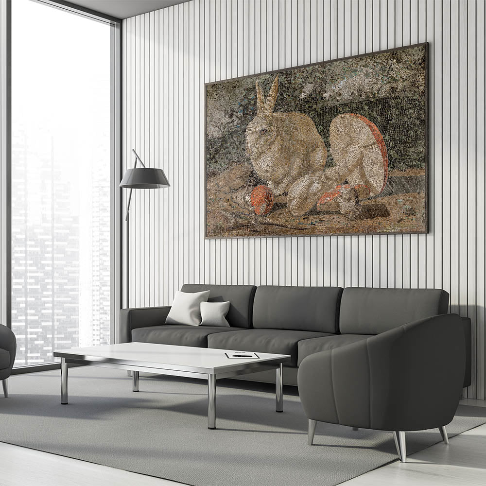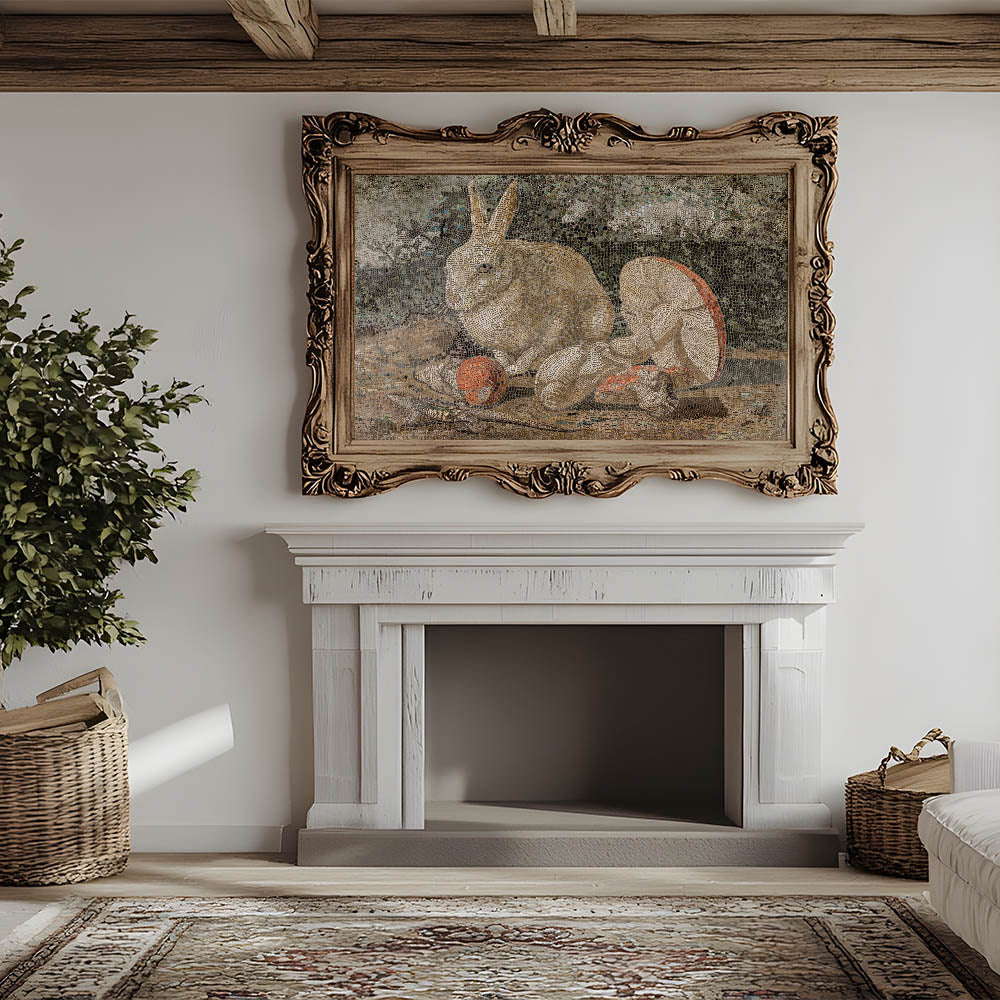 Elevate your interior with this captivating Dark Moody Wall Art, featuring an intricately detailed mosaic of a rabbit surrounded by mushrooms and natural elements. The piece combines earthy tones and dark moody shades, creating an atmospheric effect that enhances the drama of the scene. This timeless print is perfect for those looking to add a unique touch of artistic expression and elegance to their home decor, especially in living rooms, studies, or hallways.