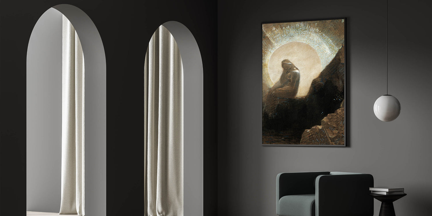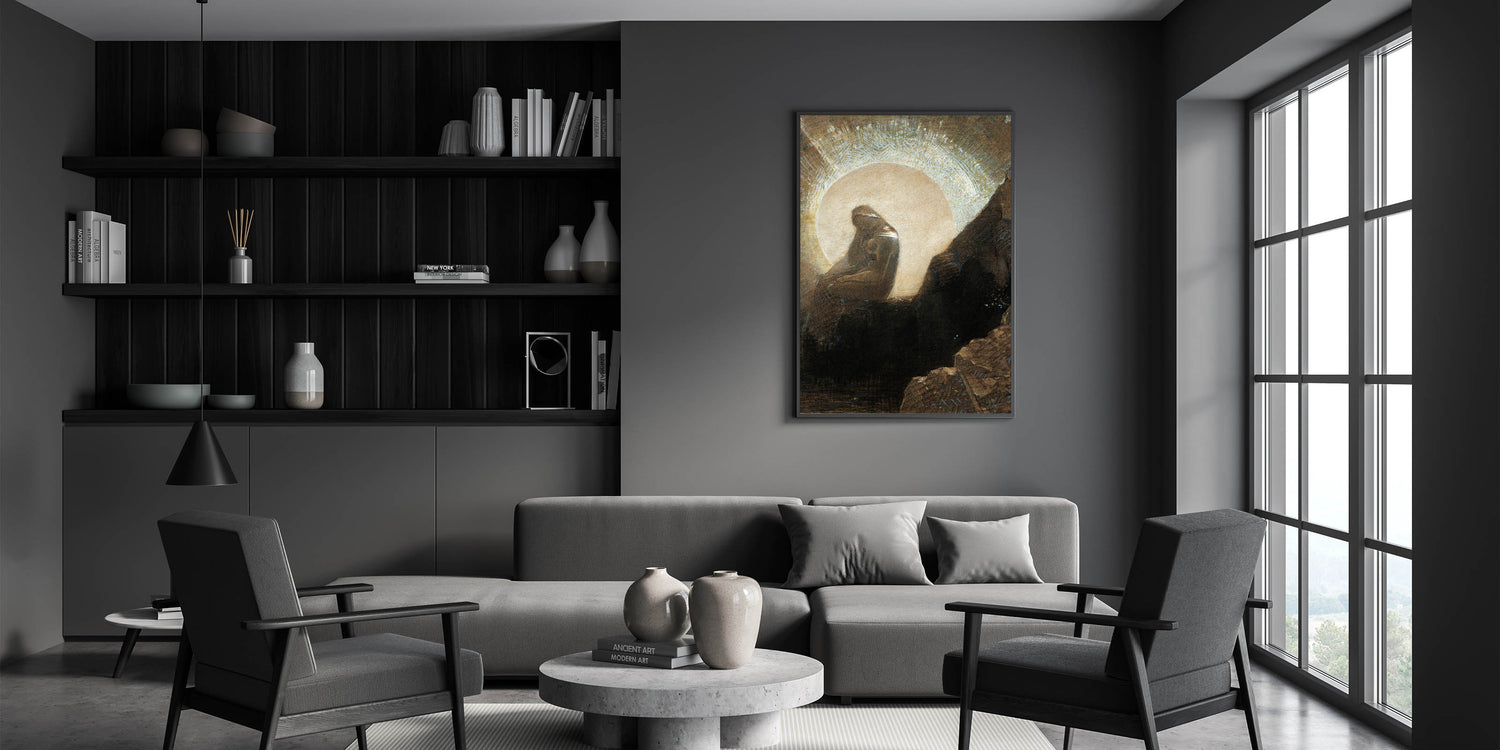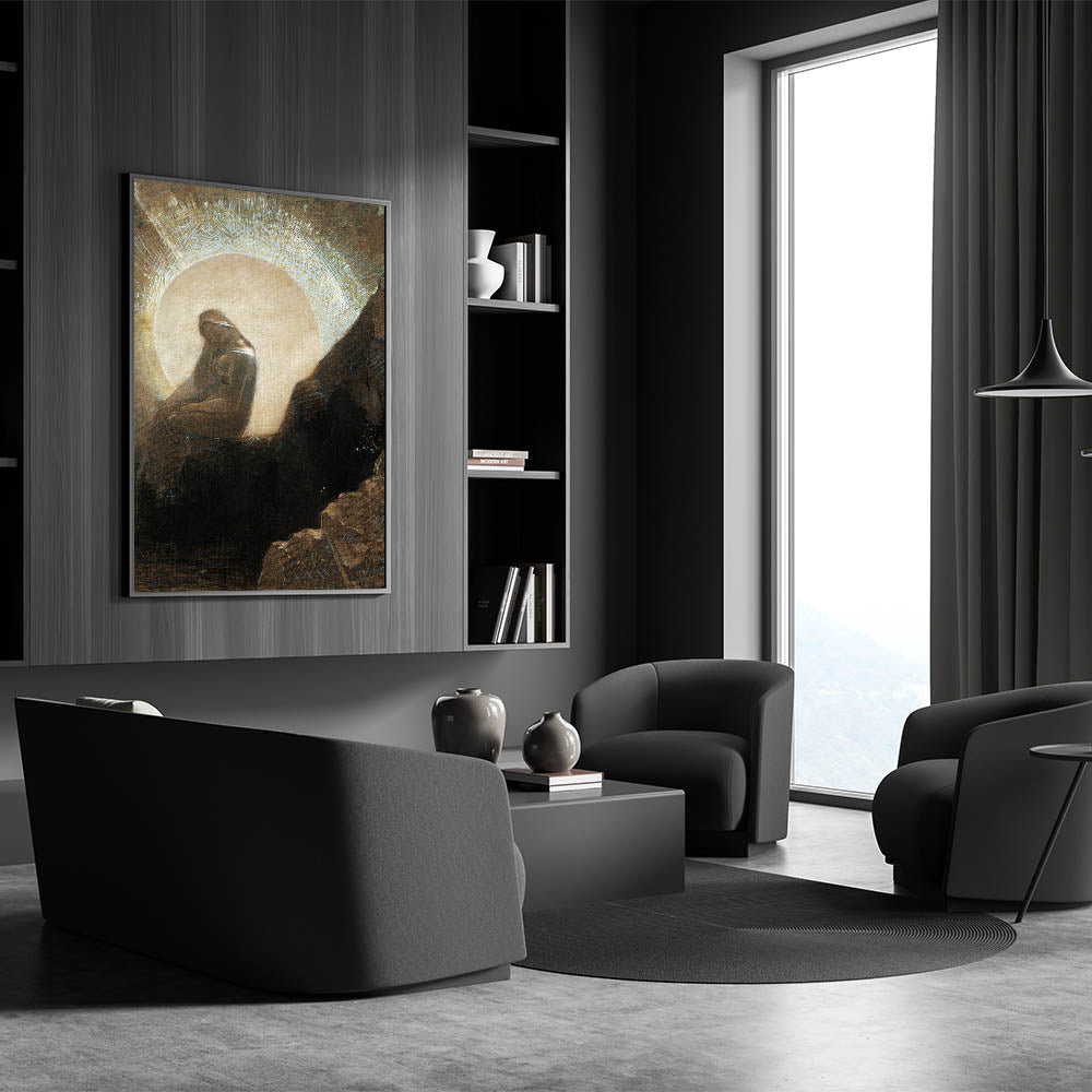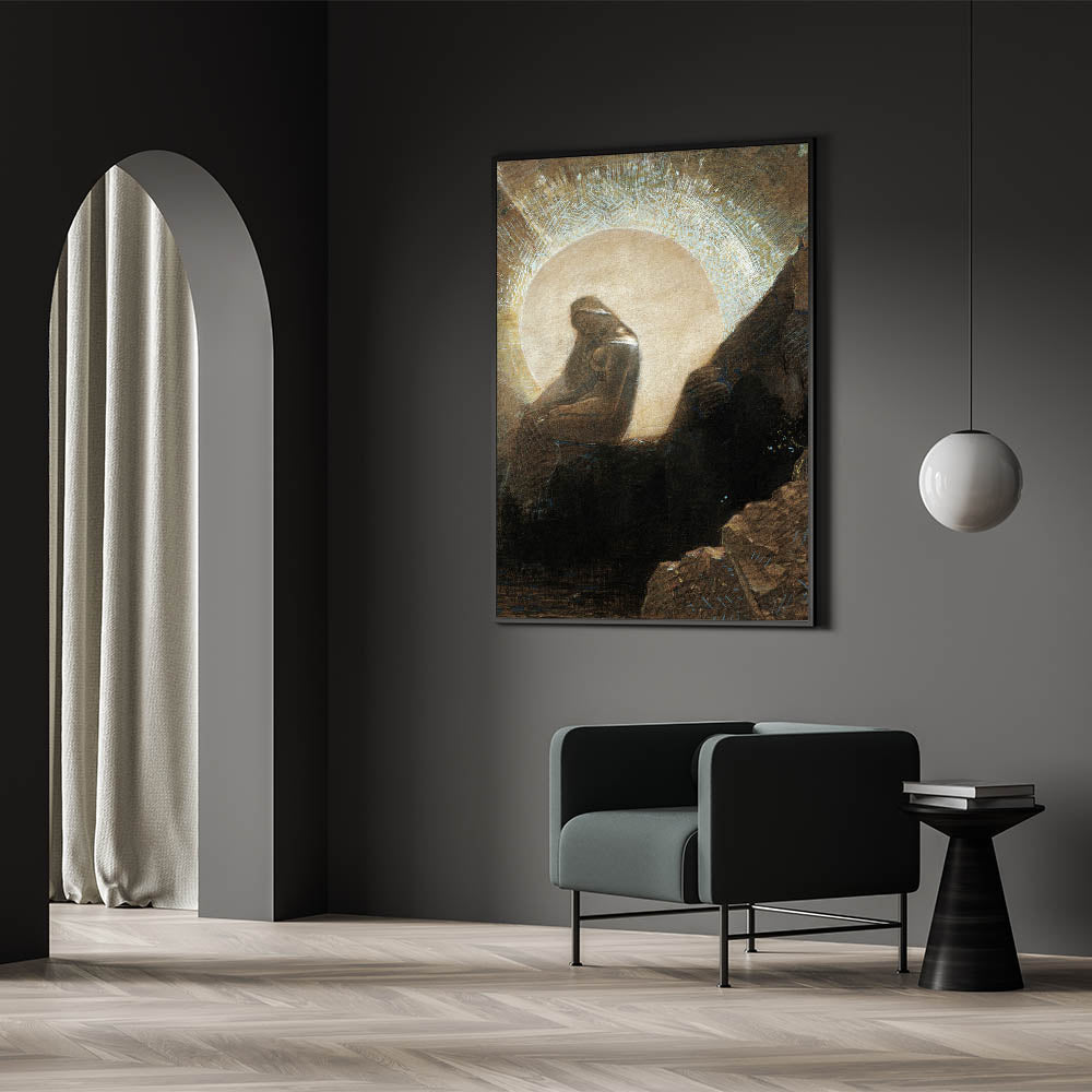 This atmospheric art piece transforms your space with its harmonious blend of light and darkness, offering a timeless and meditative quality. Its ethereal design and deep tones make it an intriguing addition to any home decor, providing a sense of serenity and mystery.
