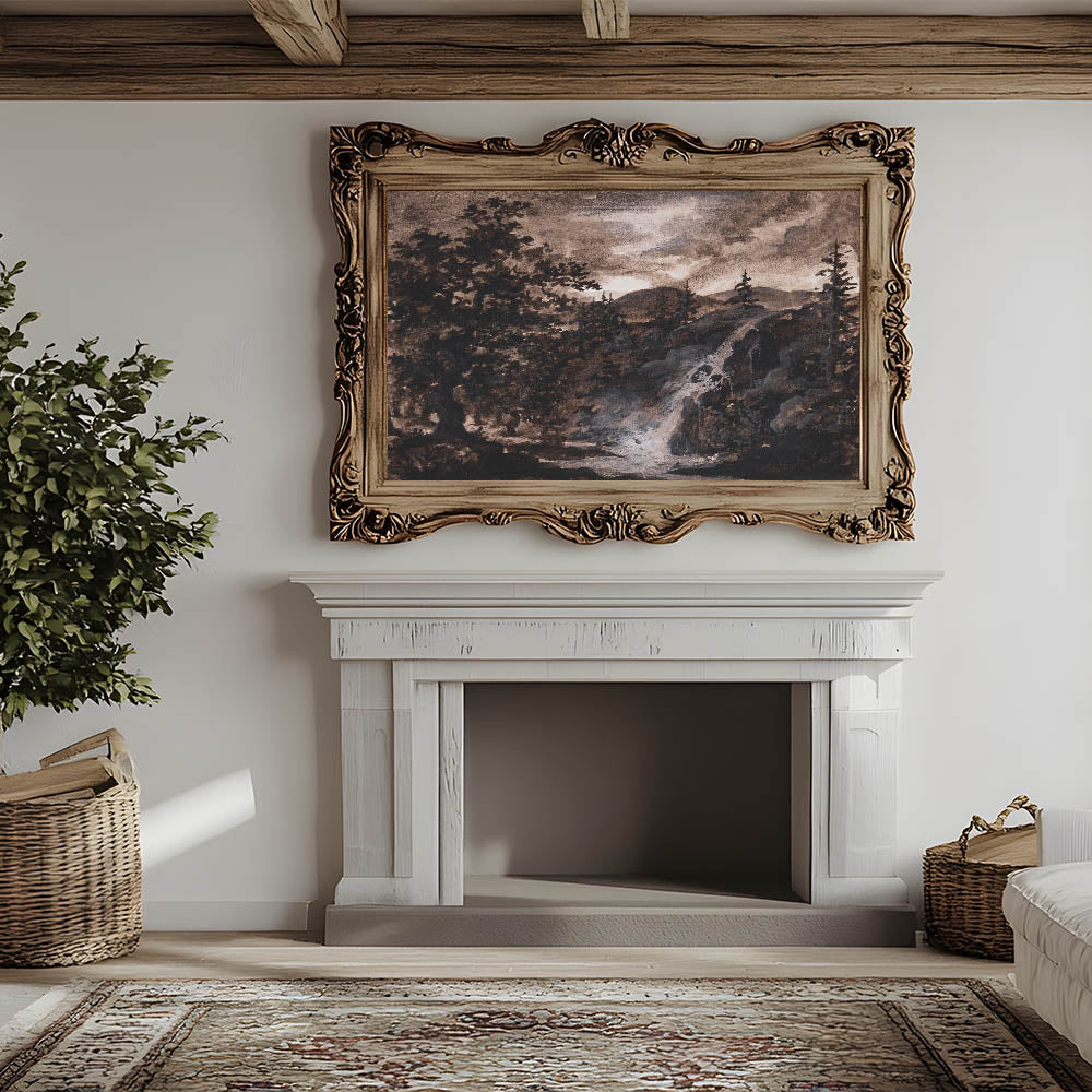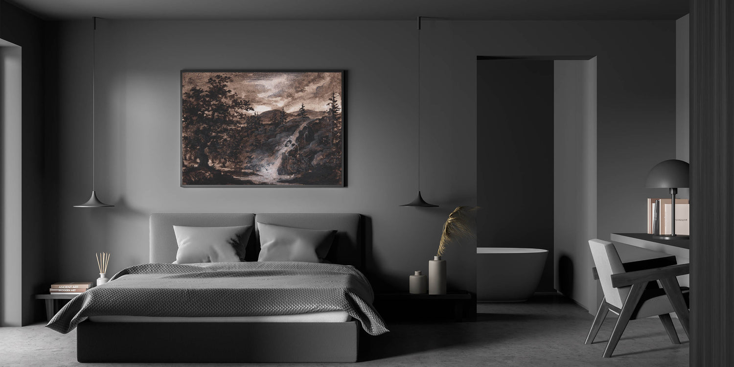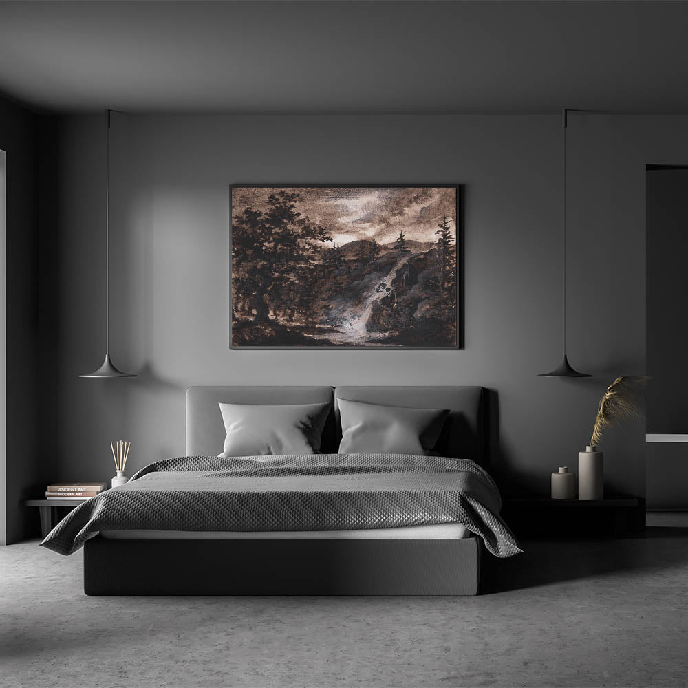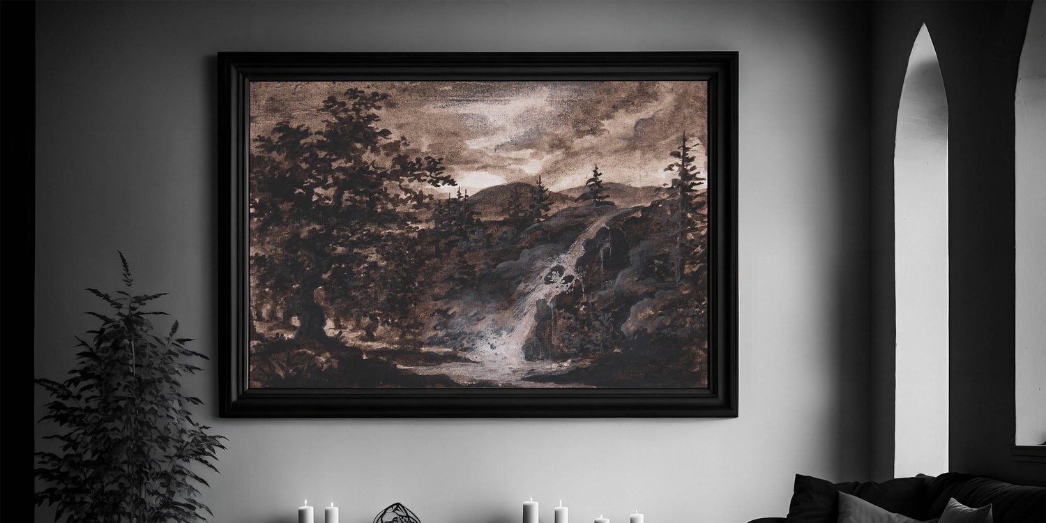 Enhance your space with this captivating Dark Moody wall art, featuring a dramatic waterfall scene set against a backdrop of shadowy trees and mountainous terrain. The artistic expression in deep, muted tones creates a mysterious and atmospheric ambiance, perfect for adding depth and character to any room. This piece is available in various formats to suit your interior decor style, ensuring a timeless aesthetic.