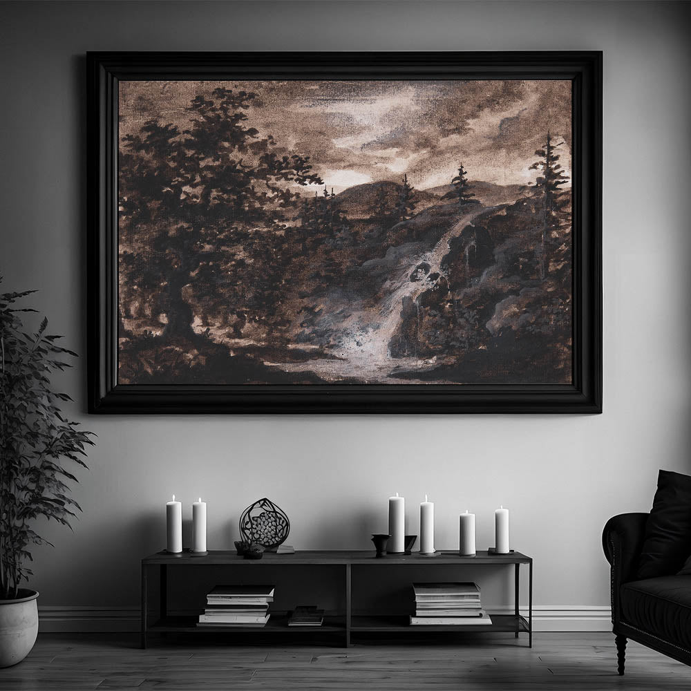 Dark Moody Wall Art - Timeless Waterfall Scene with Dramatic Shadows