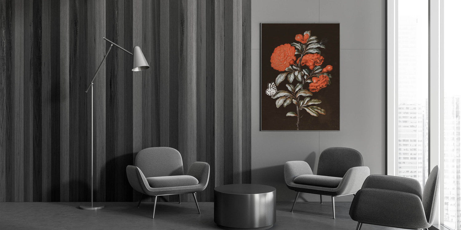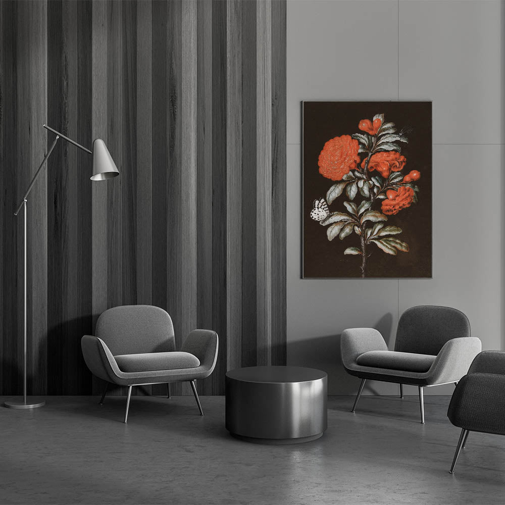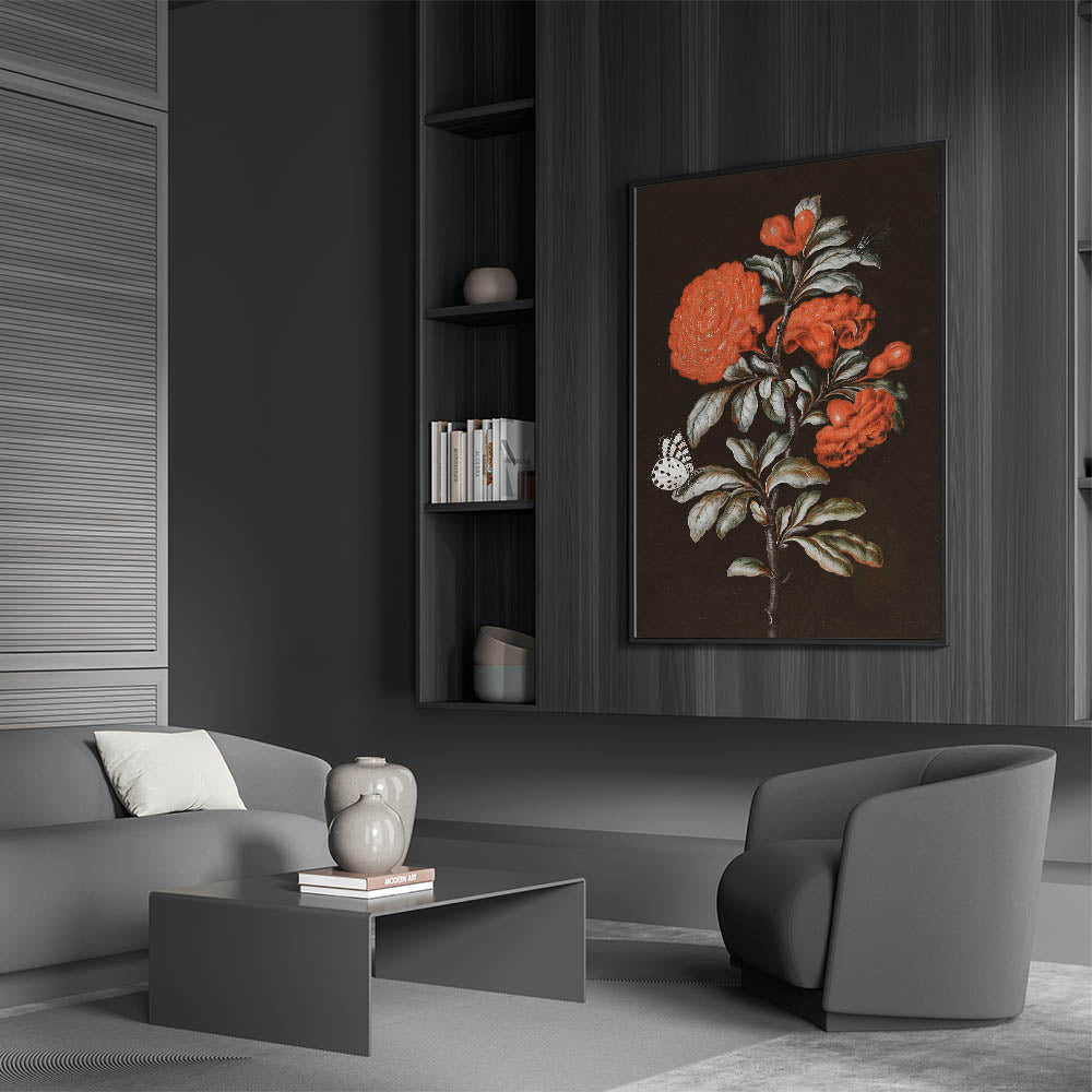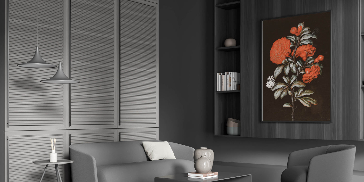 Add a burst of color and elegance to your space with this Dark Moody Wall Art featuring a stunning red floral arrangement complemented by a delicate butterfly and dragonfly. The intricate details of the flowers and insects stand out against the dark background, creating a striking visual contrast. The vibrant reds and soft greens bring this artwork to life, making it a perfect piece for those looking to add a touch of bold, nature-inspired beauty to their home.