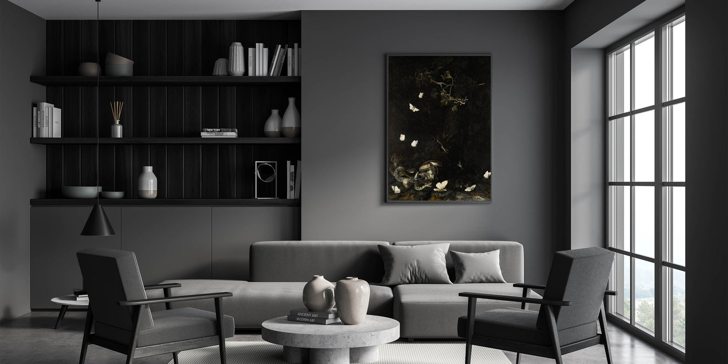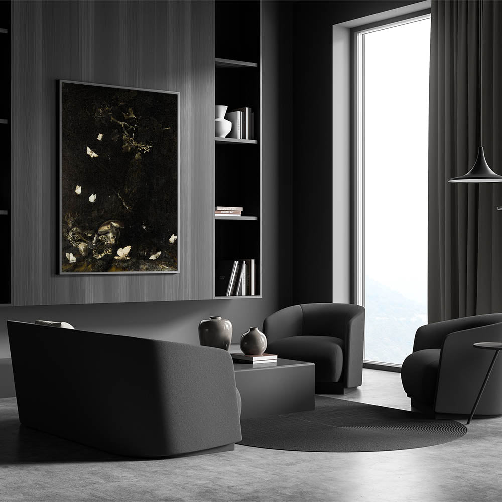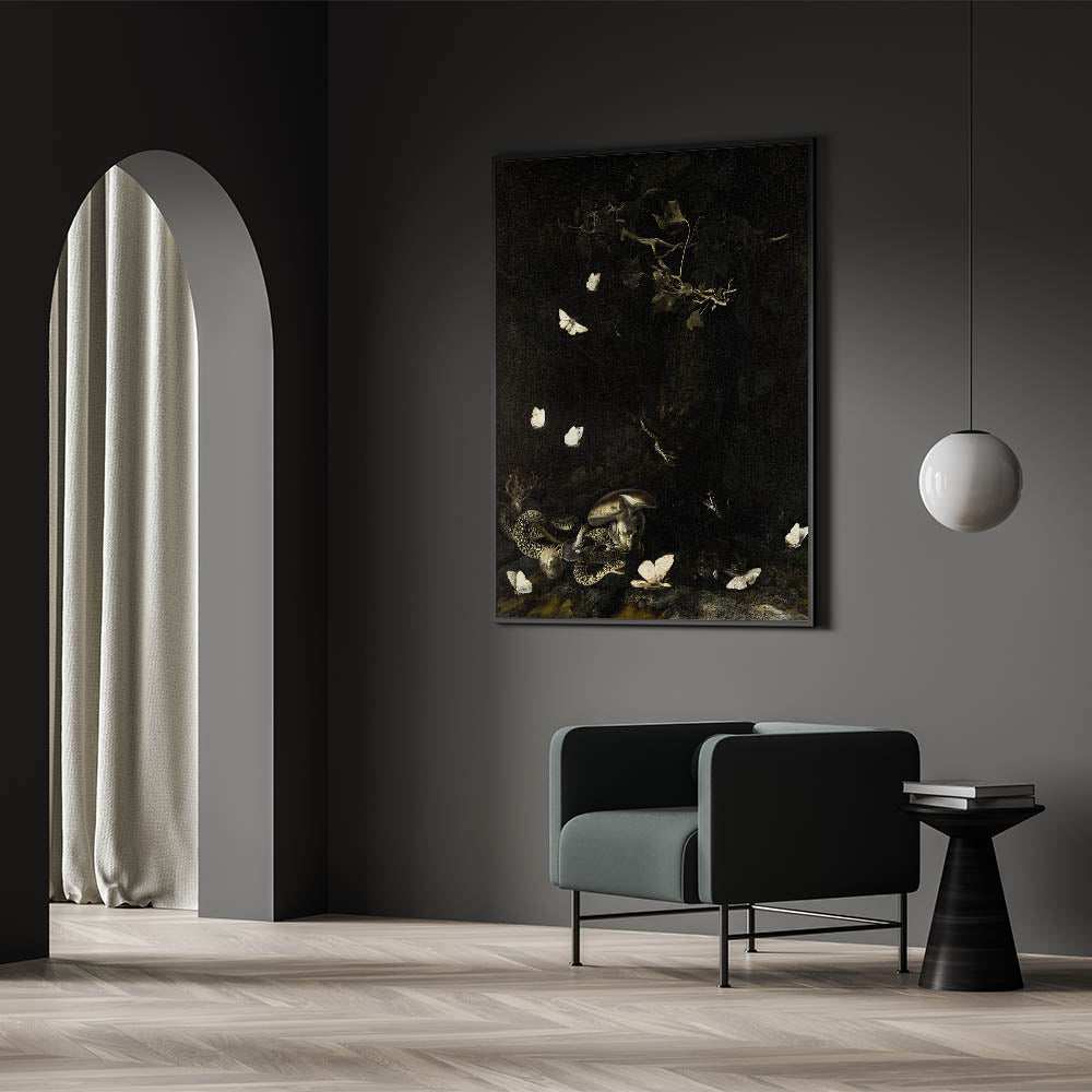 Transform your living space with this striking Dark Moody Wall Art featuring a hauntingly beautiful scene of snakes intertwined among mushrooms and delicate white moths fluttering in the dark. This piece is a perfect representation of atmospheric art that will elevate any interior with its dramatic and timeless aesthetic.