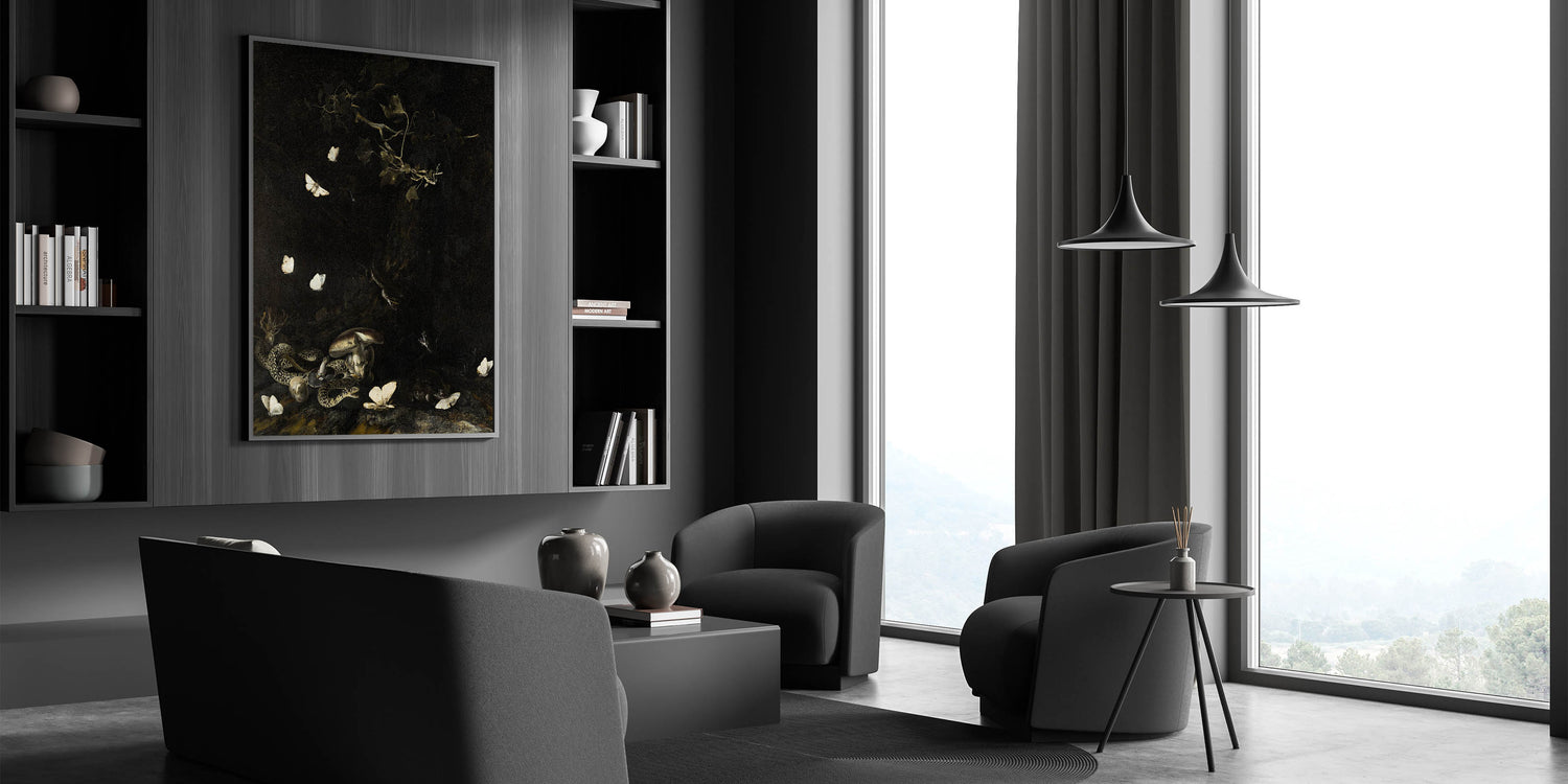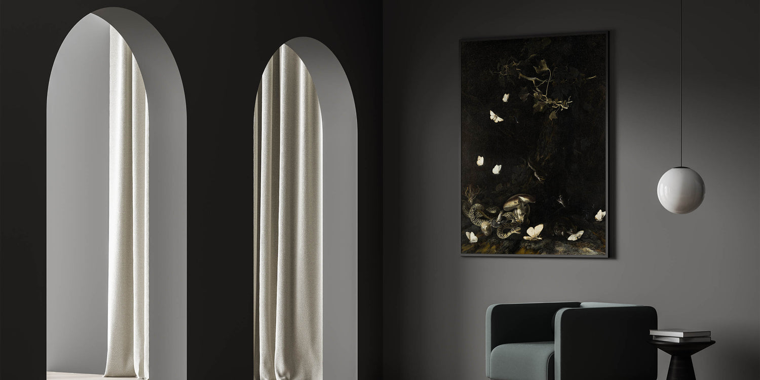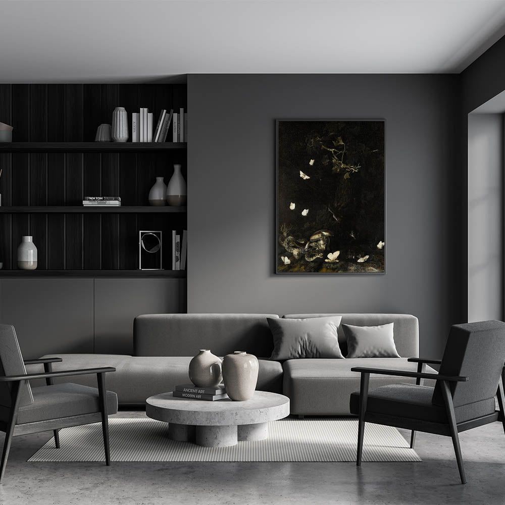 Transform your living space with this striking Dark Moody Wall Art featuring a hauntingly beautiful scene of snakes intertwined among mushrooms and delicate white moths fluttering in the dark. This piece is a perfect representation of atmospheric art that will elevate any interior with its dramatic and timeless aesthetic.