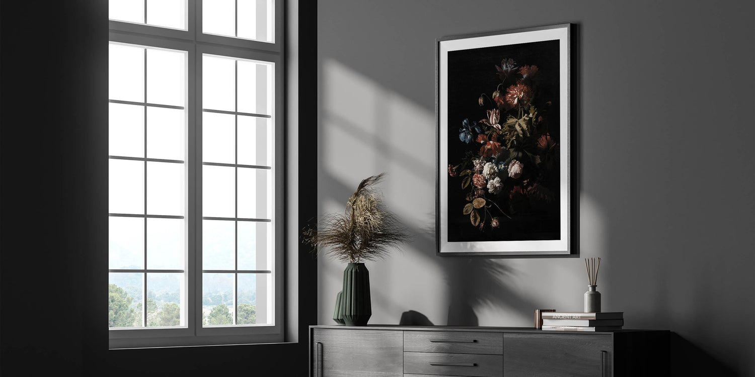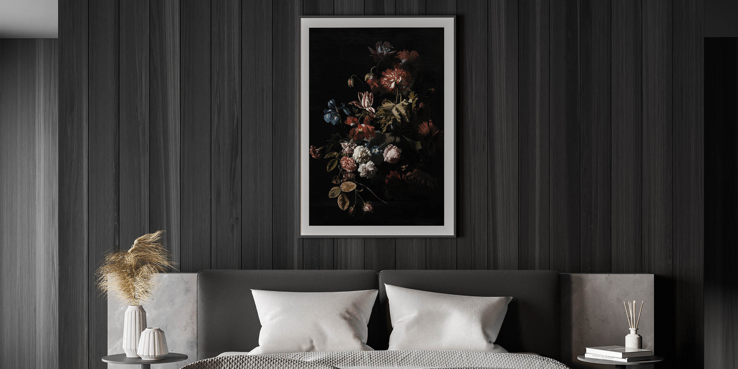 Introduce a sense of elegance and moody sophistication to your home decor with this exquisite floral art piece, perfect for creating a dramatic focal point.