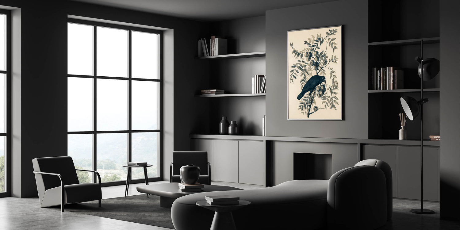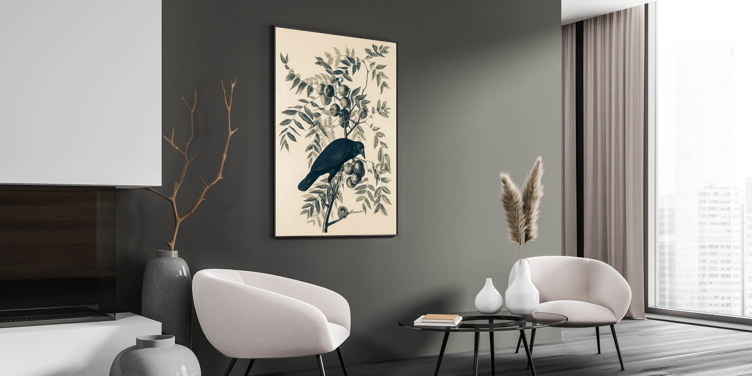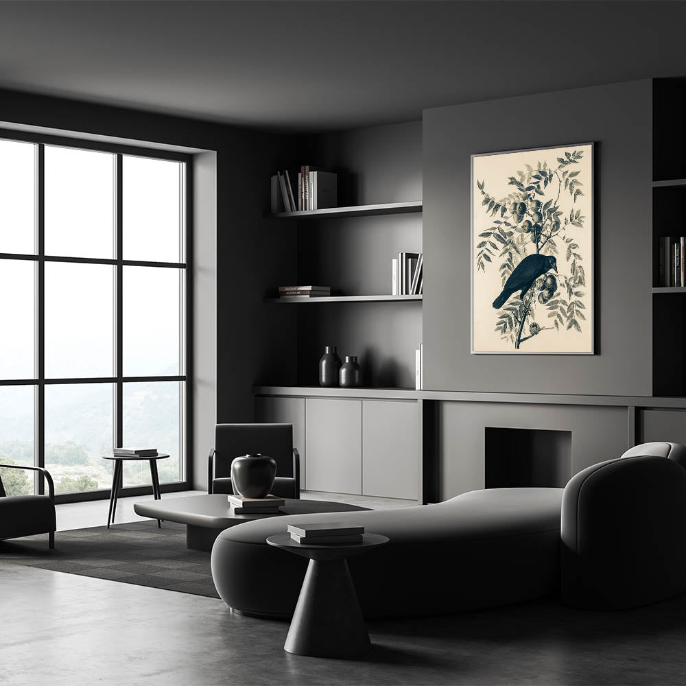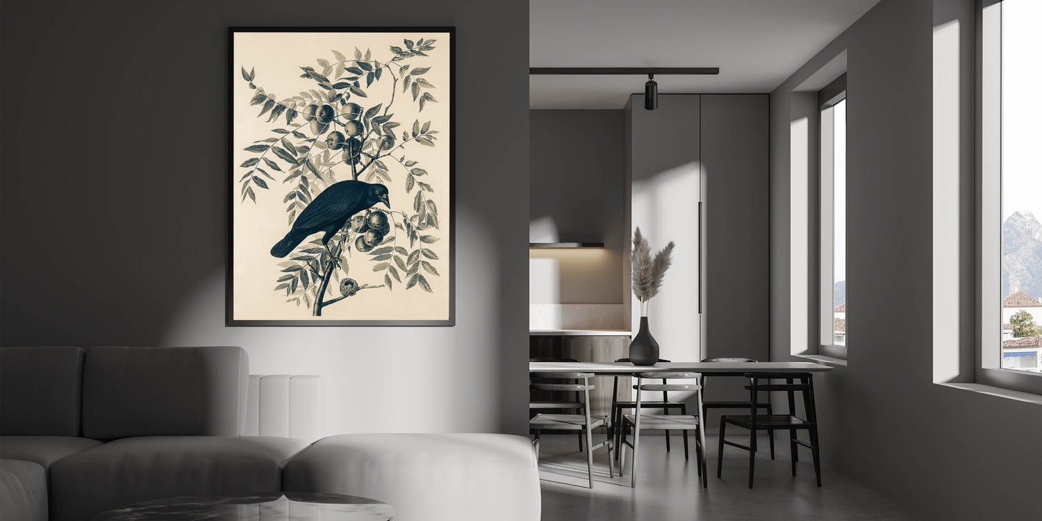 This grunge-inspired wall decor captures the essence of nature’s beauty with an urban edge, perfect for modern and vintage-inspired interiors. Add an element of mystery to your space with this expressive crow and botanical design.