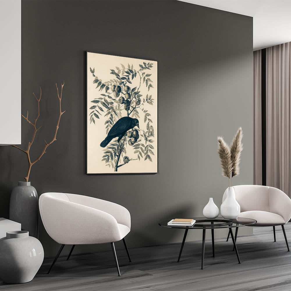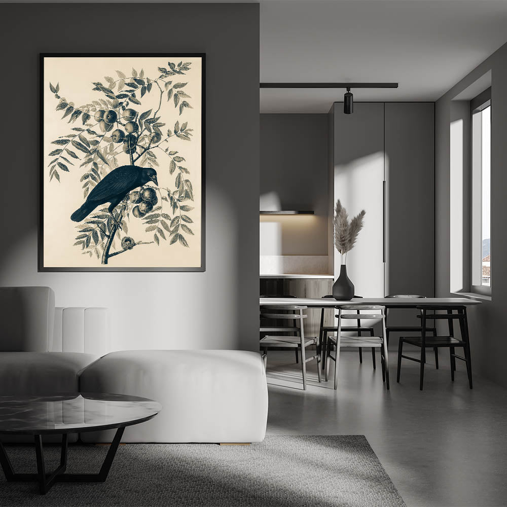 Elevate your space with the mysterious charm of our Grunge Crow and Fruit Illustration. This detailed artwork features a crow perched on a branch filled with leaves and fruit, rendered in a vintage, monochromatic style. The distressed texture and dark, moody tones make this piece perfect for those who appreciate retro and vintage grunge artwork with a naturalistic and eerie twist.