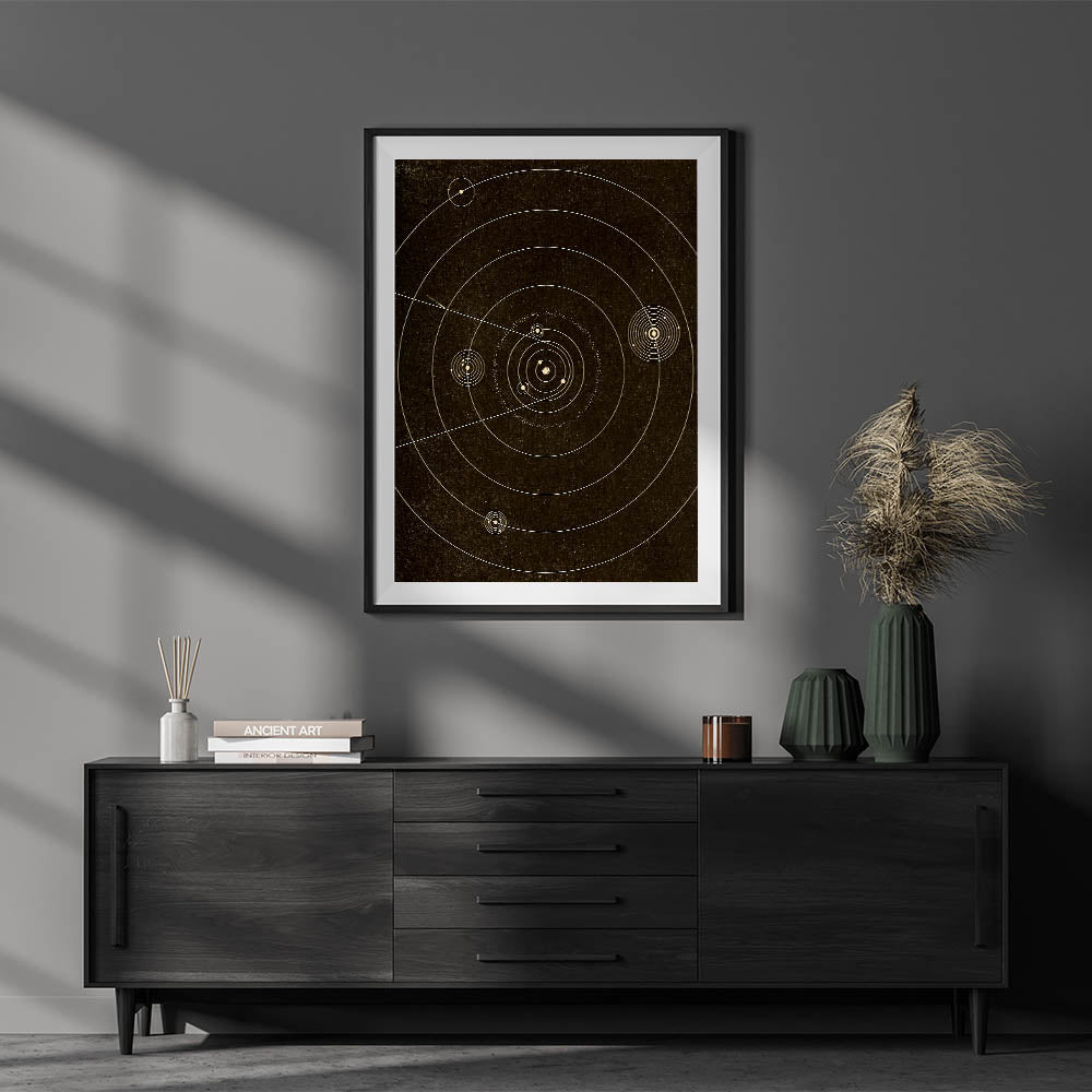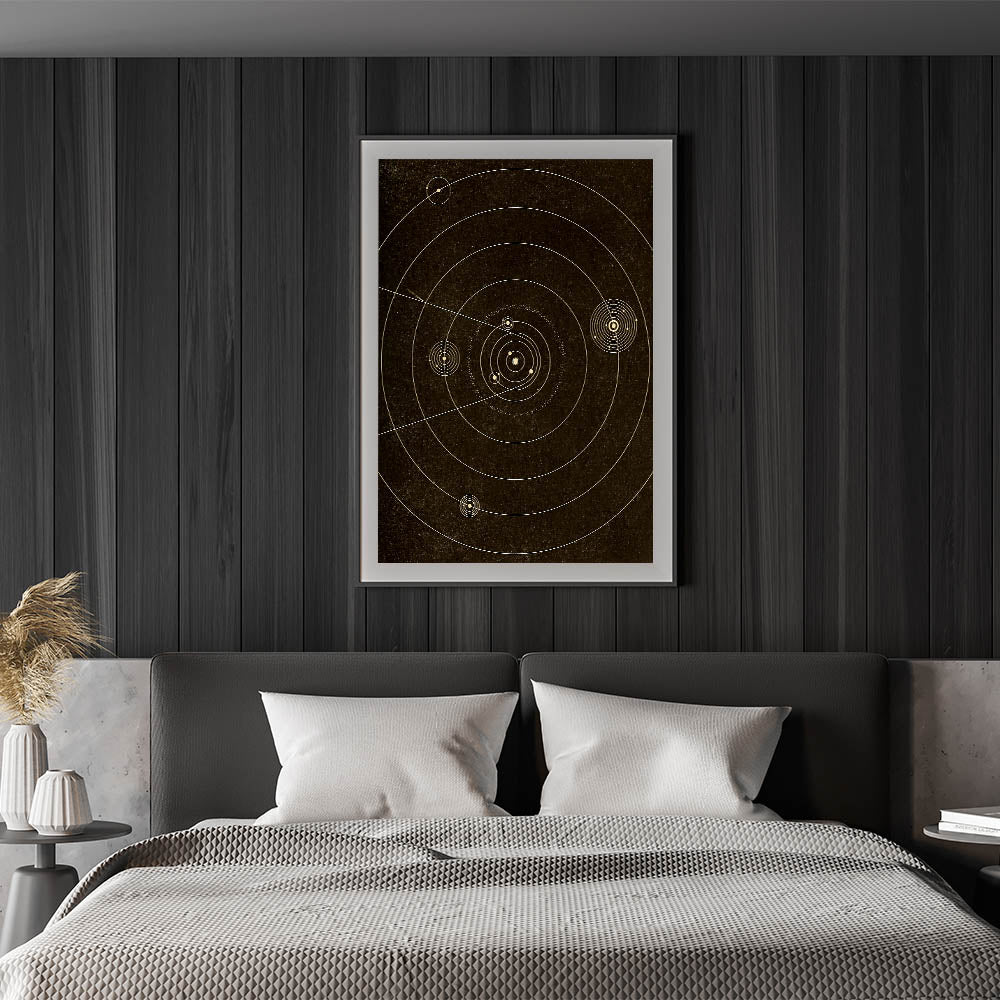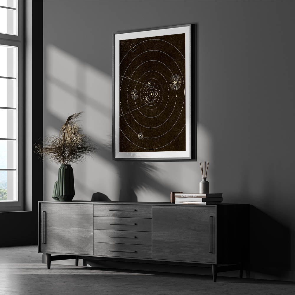 Transform your space with this striking Grunge Wall Art featuring a vintage-inspired solar system design. This abstract grunge painting showcases intricate planetary orbits set against a dark, moody background, making it a perfect addition to any space craving urban grunge art. The minimalist yet captivating design makes this piece a versatile addition to both modern and industrial-style interiors.
