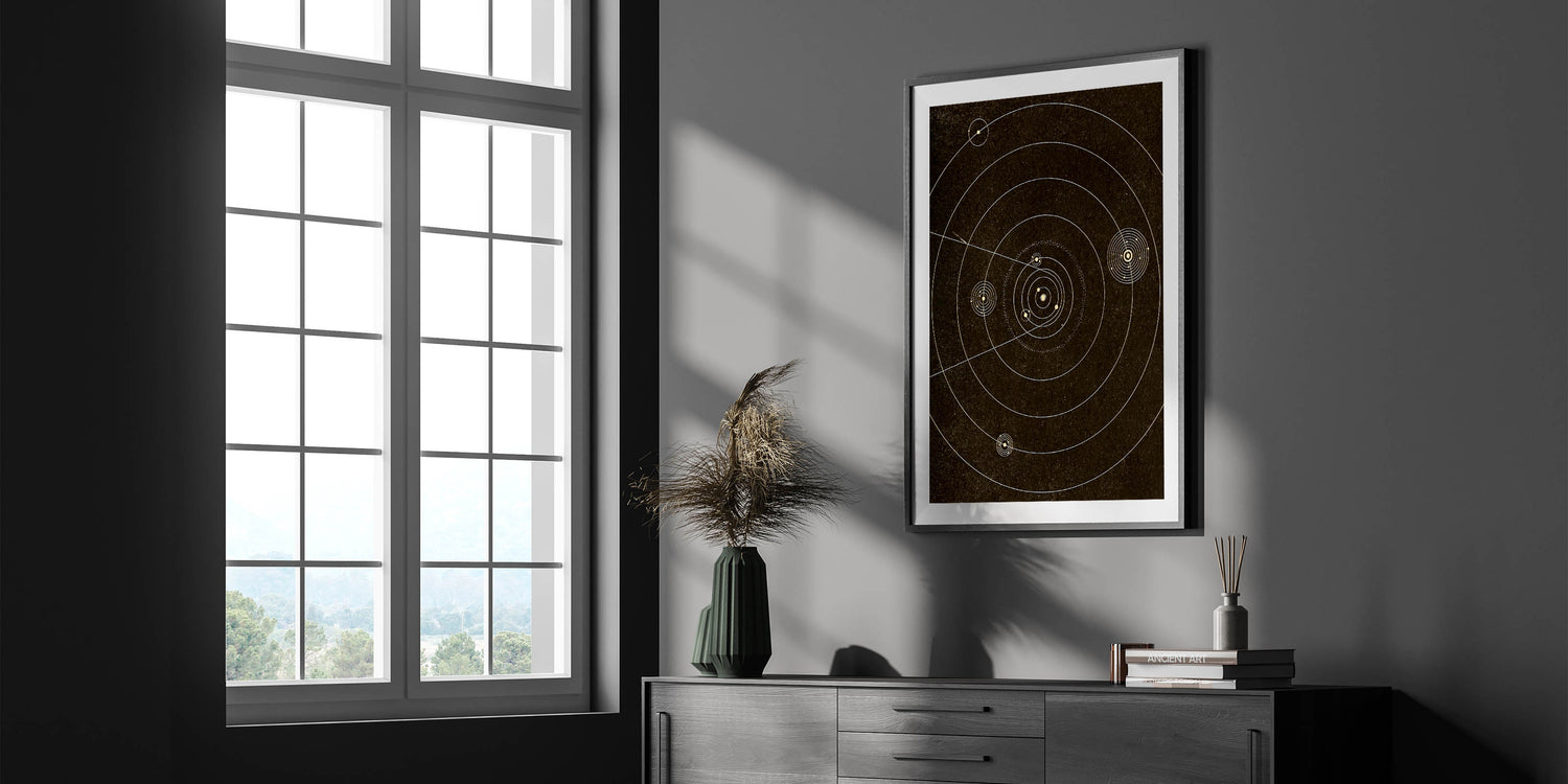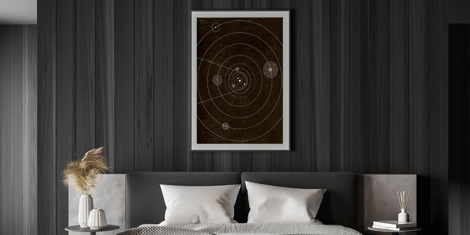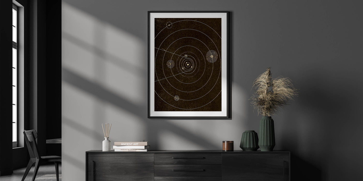 Transform your space with this striking Grunge Wall Art featuring a vintage-inspired solar system design. This abstract grunge painting showcases intricate planetary orbits set against a dark, moody background, making it a perfect addition to any space craving urban grunge art. The minimalist yet captivating design makes this piece a versatile addition to both modern and industrial-style interiors.