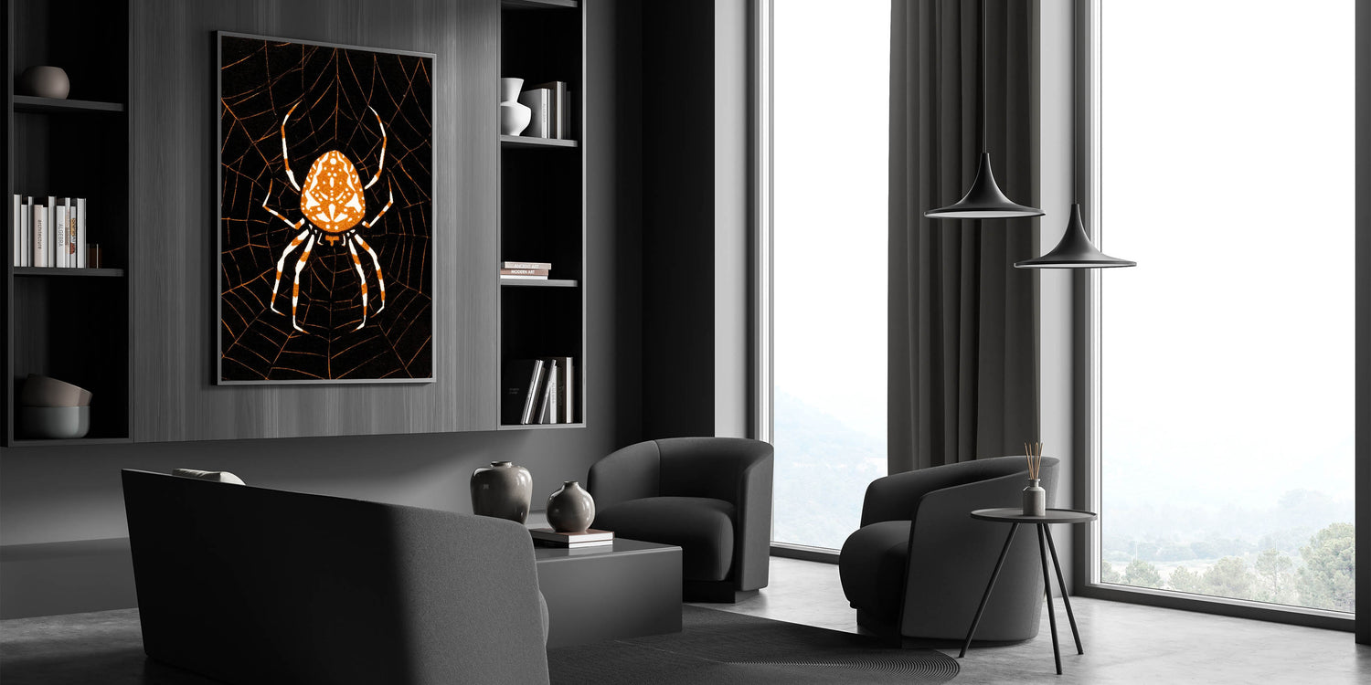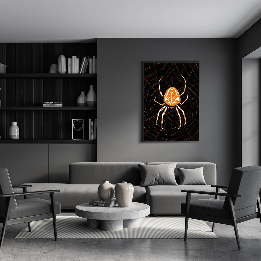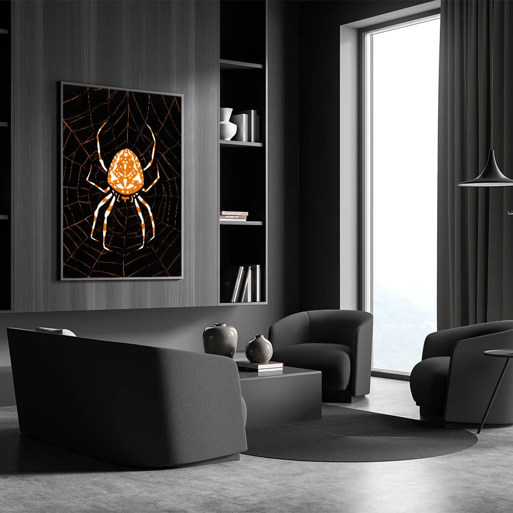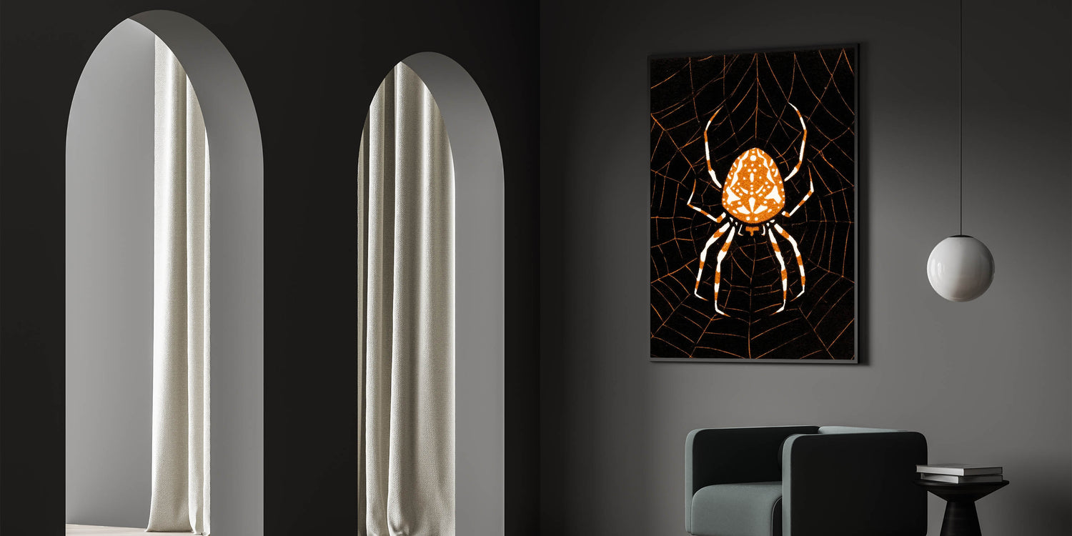 Ideal for modern and vintage-inspired interiors, this artistic grunge print brings an element of natural mystery to your decor. Transform your space into a dramatic and engaging environment with this spider and web illustration.