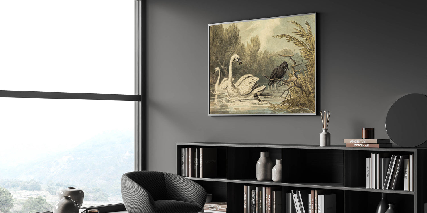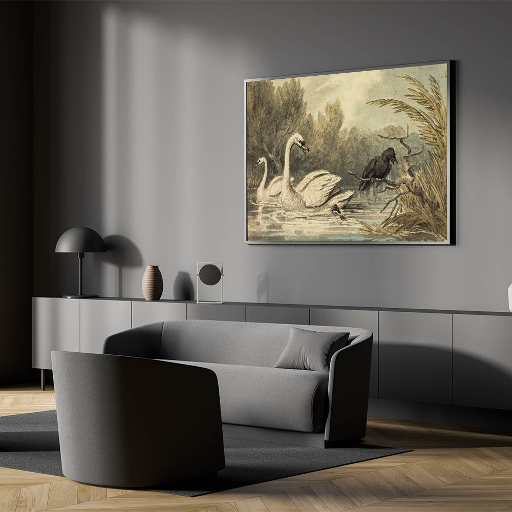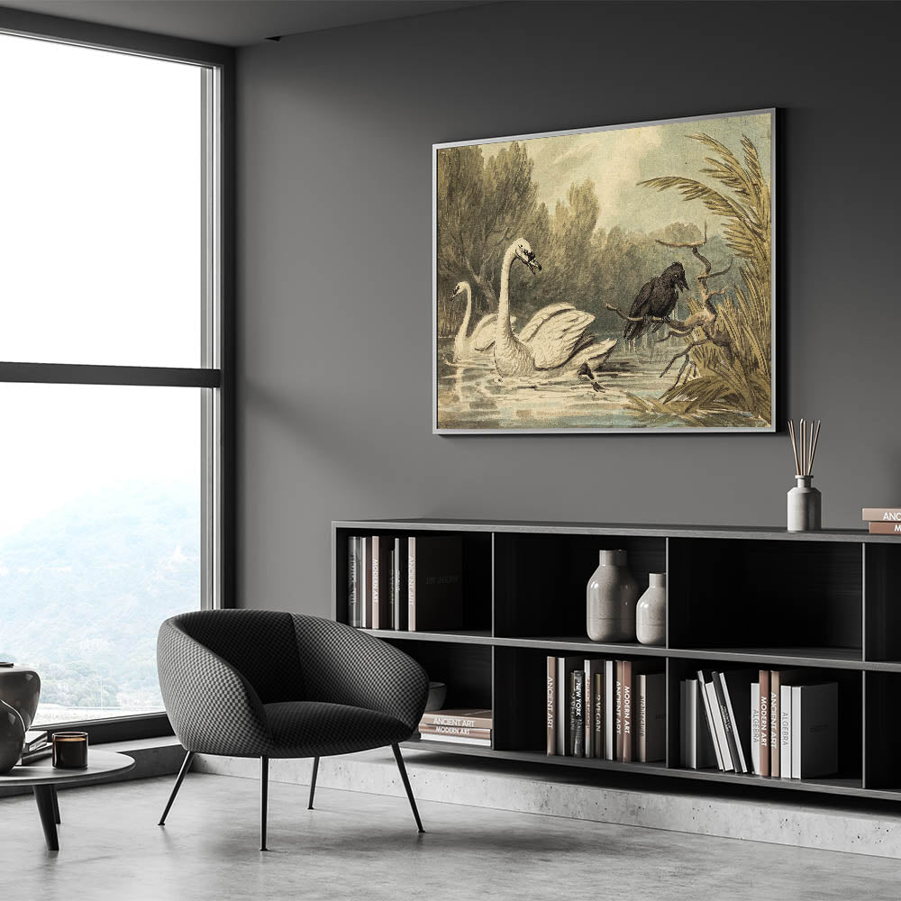 Add a touch of the unexpected to your space with this striking Grunge Wall Art, featuring a captivating scene of swans serenely floating while a crow watches from a branch. The contrast between the graceful swans and the dark, brooding presence of the crow creates a visually dynamic composition, perfect for those who enjoy art that defies convention. The soft, natural tones juxtaposed with the crow’s inky black figure make this piece a standout addition to any modern or eclectic space.