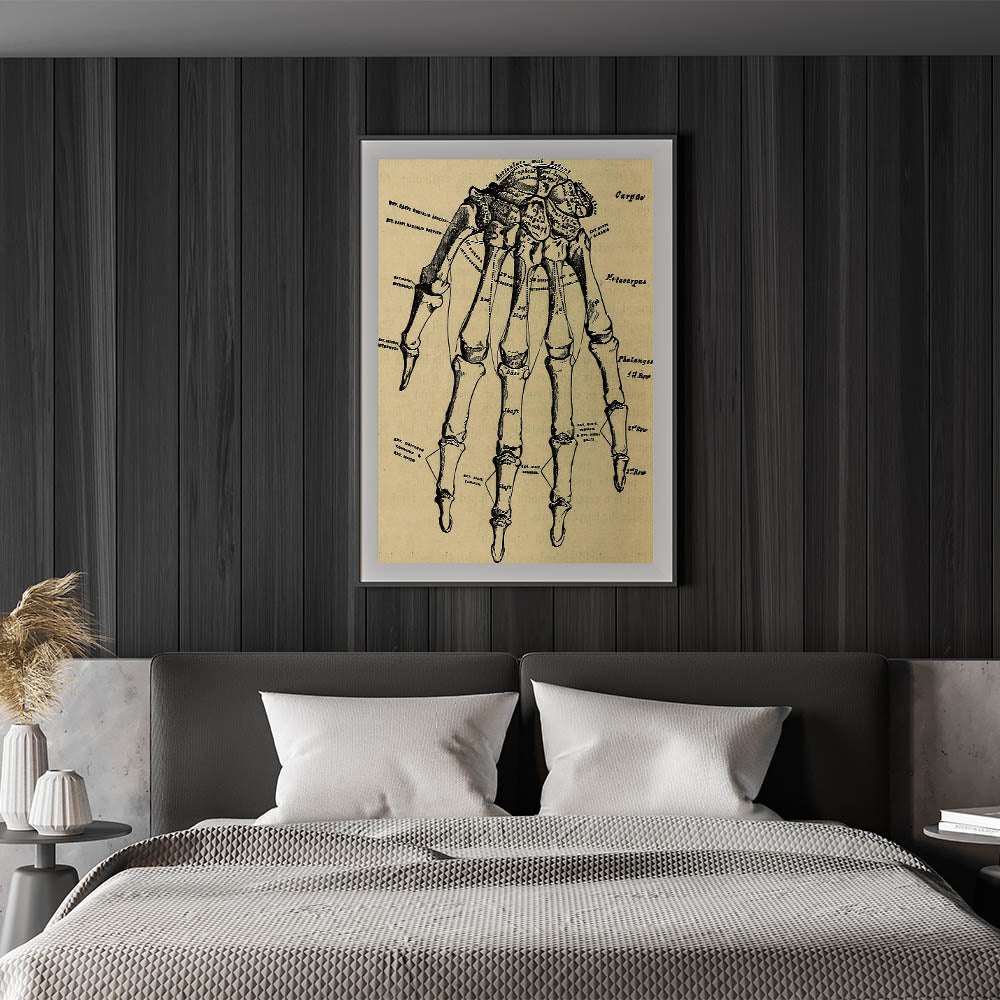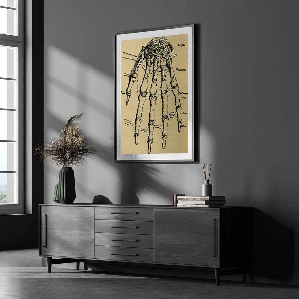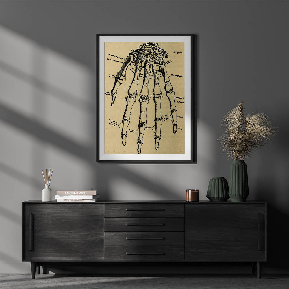 Explore the intricacies of human anatomy with this vintage grunge art piece featuring a detailed anatomical hand illustration. Perfect for fans of scientific artwork, this grunge canvas print merges the timeless appeal of anatomical drawings with a bold, distressed art aesthetic. The finely sketched bones of the hand, paired with a subtle, worn background, create a unique and captivating focal point for any room.