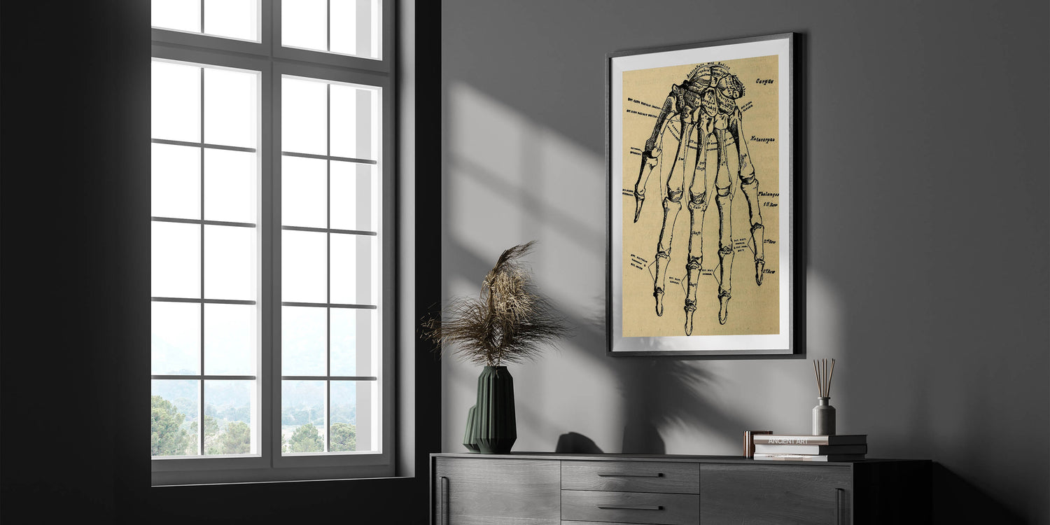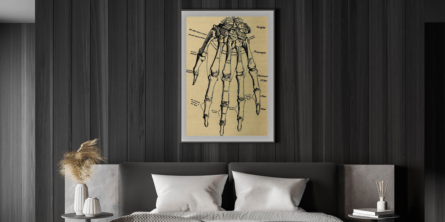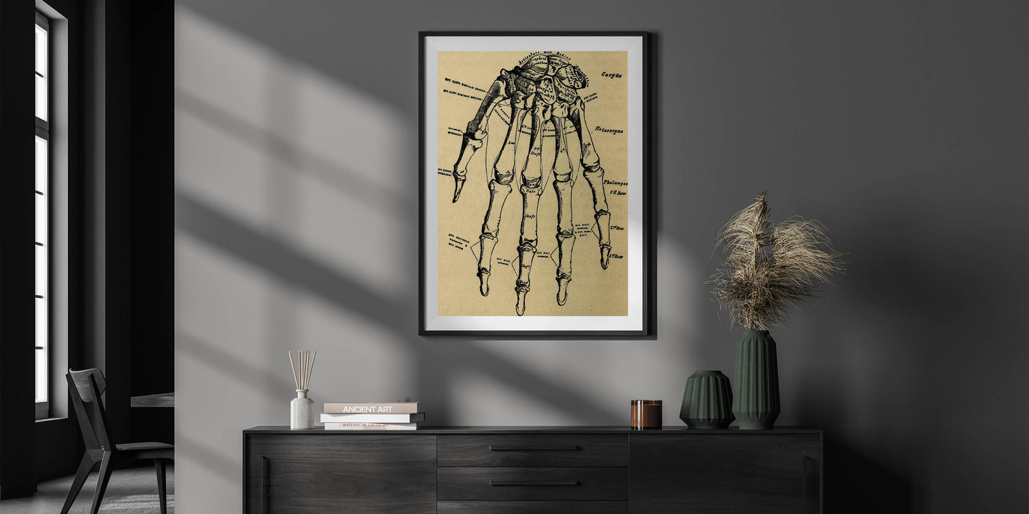 Explore the intricacies of human anatomy with this vintage grunge art piece featuring a detailed anatomical hand illustration. Perfect for fans of scientific artwork, this grunge canvas print merges the timeless appeal of anatomical drawings with a bold, distressed art aesthetic. The finely sketched bones of the hand, paired with a subtle, worn background, create a unique and captivating focal point for any room.