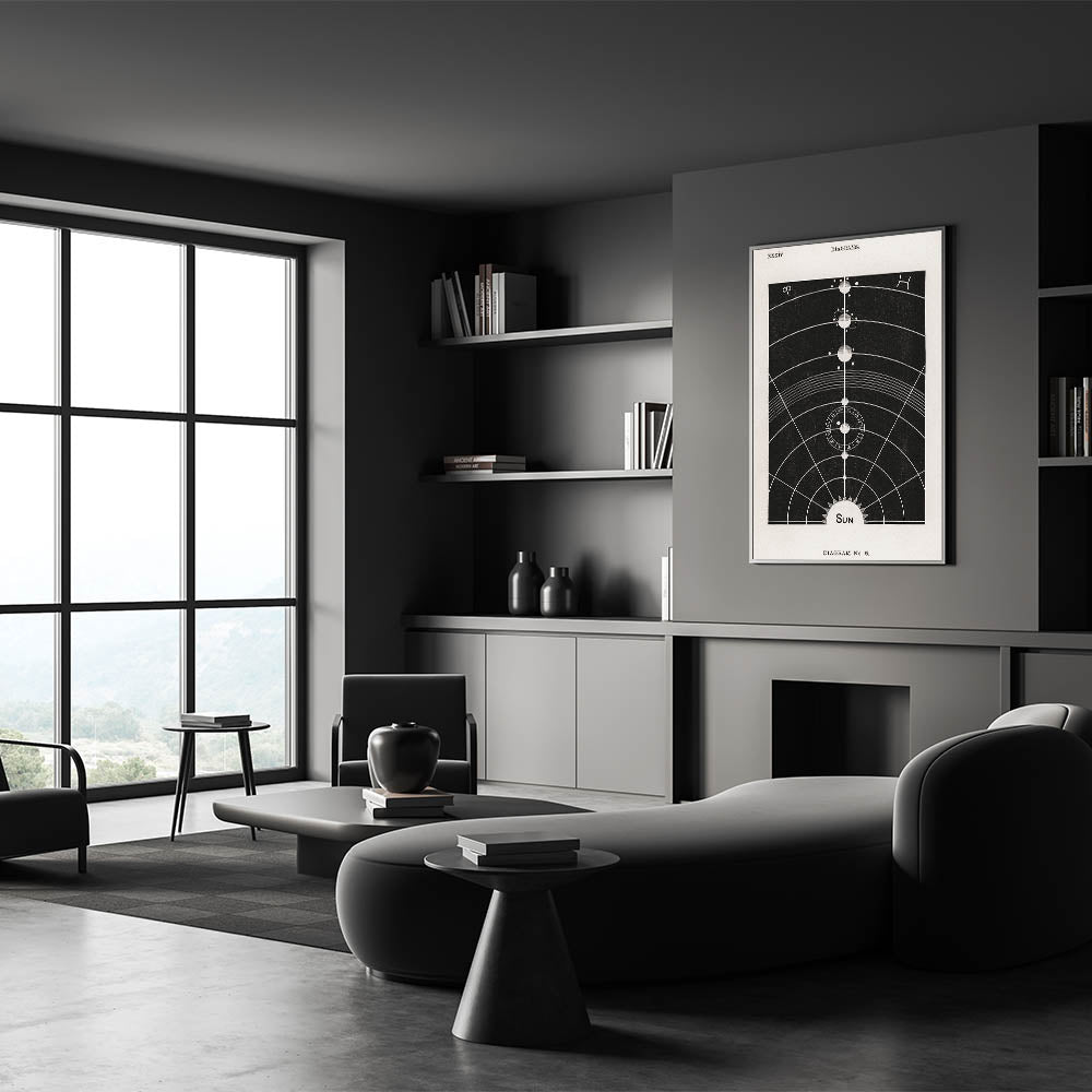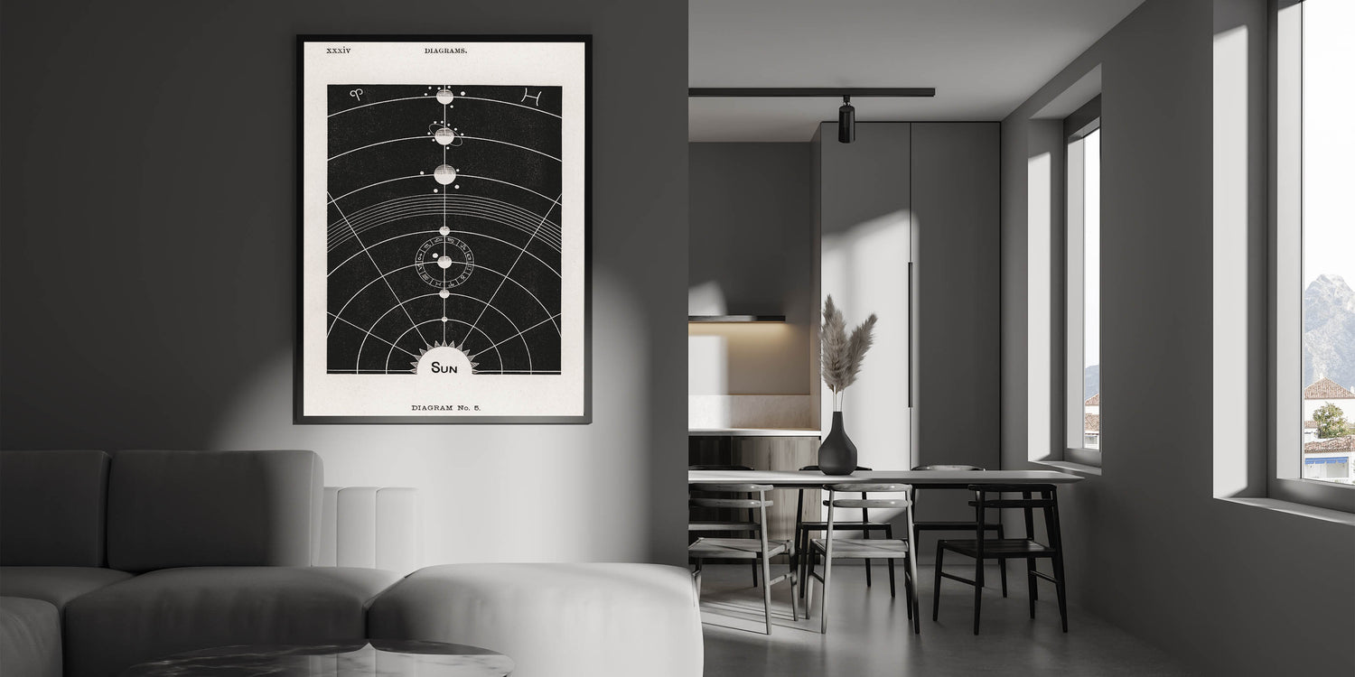 Bring the cosmos into your home with this unique grunge canvas print featuring a vintage solar system diagram. This abstract grunge painting combines scientific intrigue with a modern, distressed art aesthetic, making it the perfect piece for space enthusiasts and those who love urban grunge art. The detailed planetary alignments, zodiac symbols, and cosmic lines against a dark, moody background create an eye-catching statement that will transform any space.