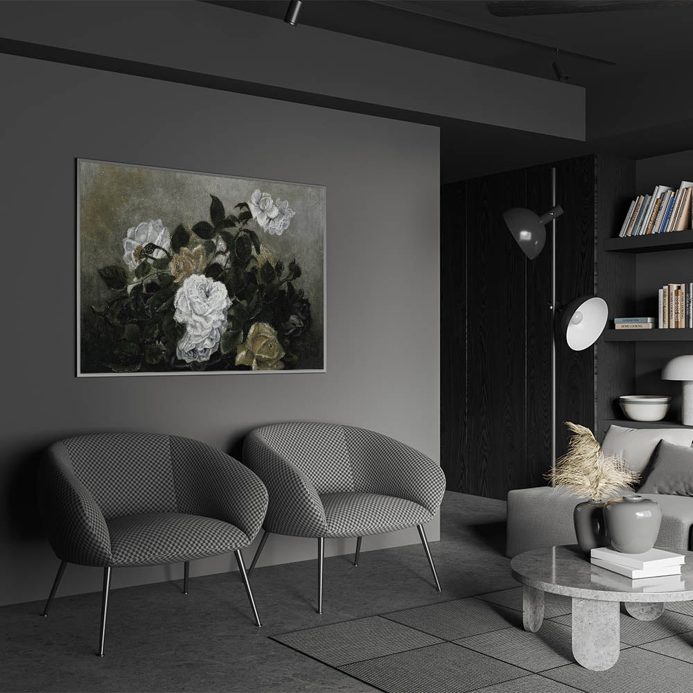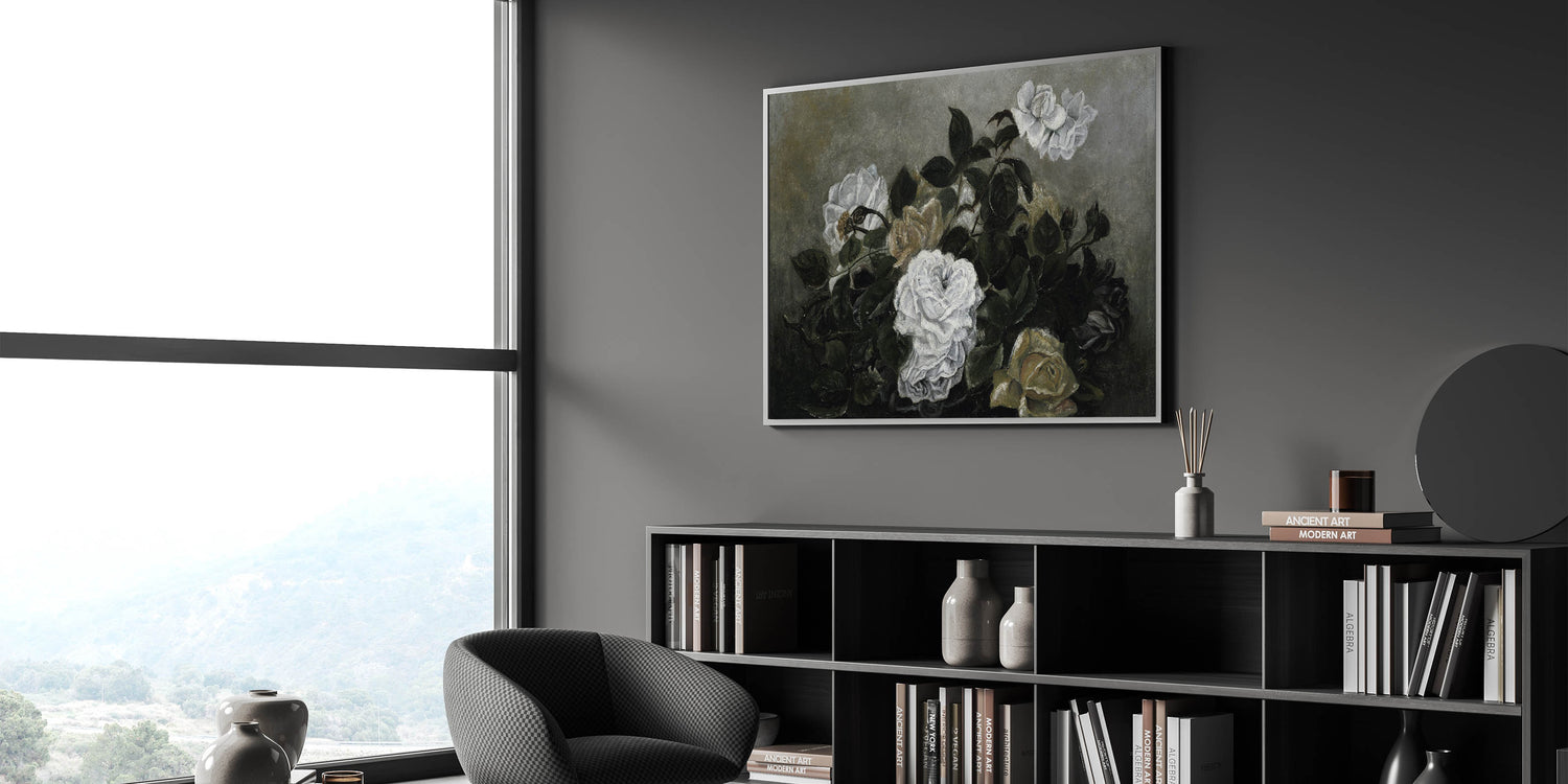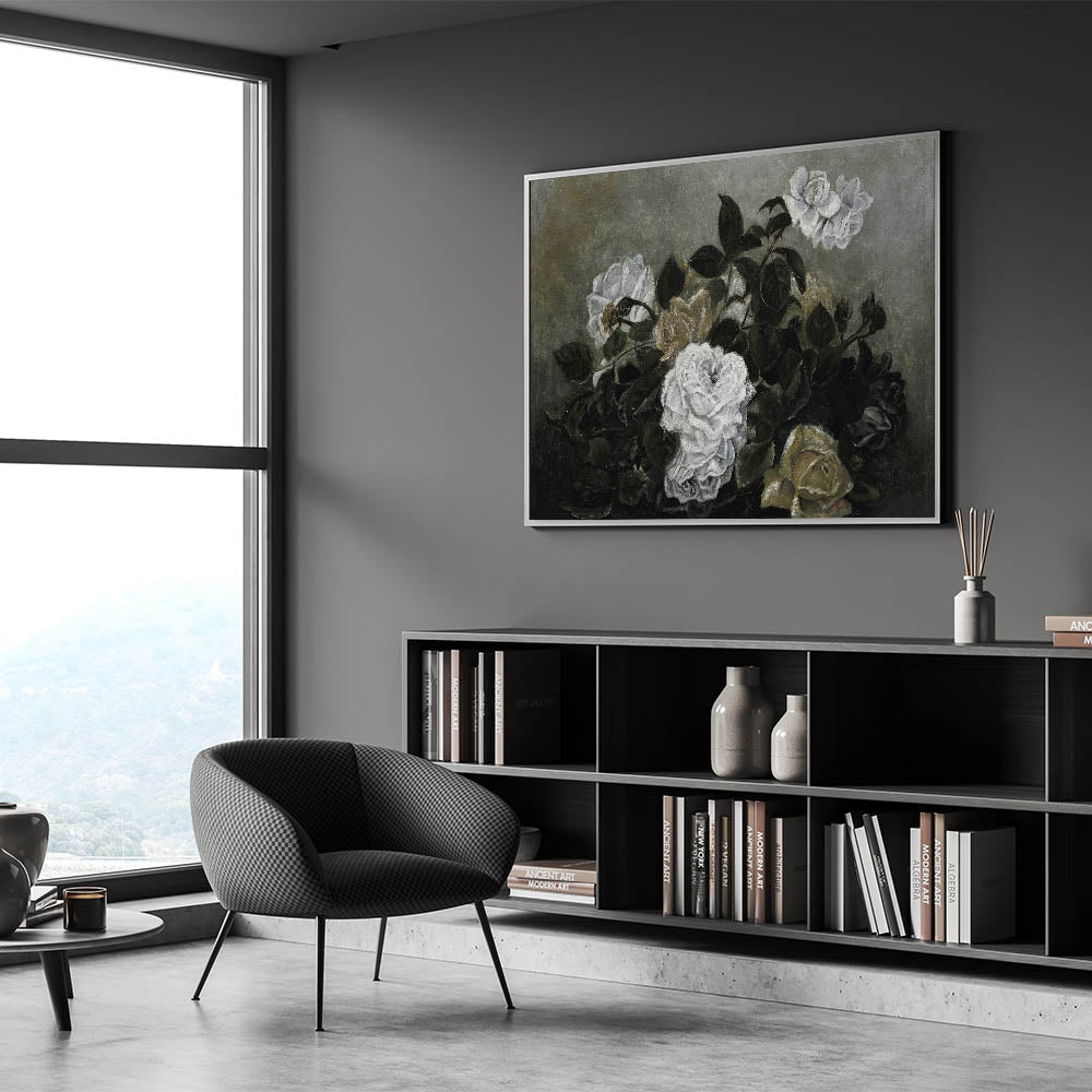 Elevate your interior with this exquisite piece of Dark Moody wall art, featuring a dramatic arrangement of white roses set against a background of lush, dark green foliage. The subtle play of light and shadow brings a timeless elegance to this print, making it an ideal addition for those seeking moody art for their home decor. Whether placed in a living room, bedroom, or study, this piece adds a refined, atmospheric touch.