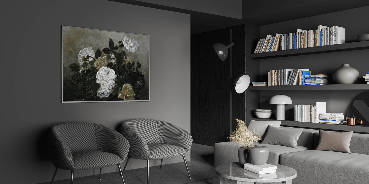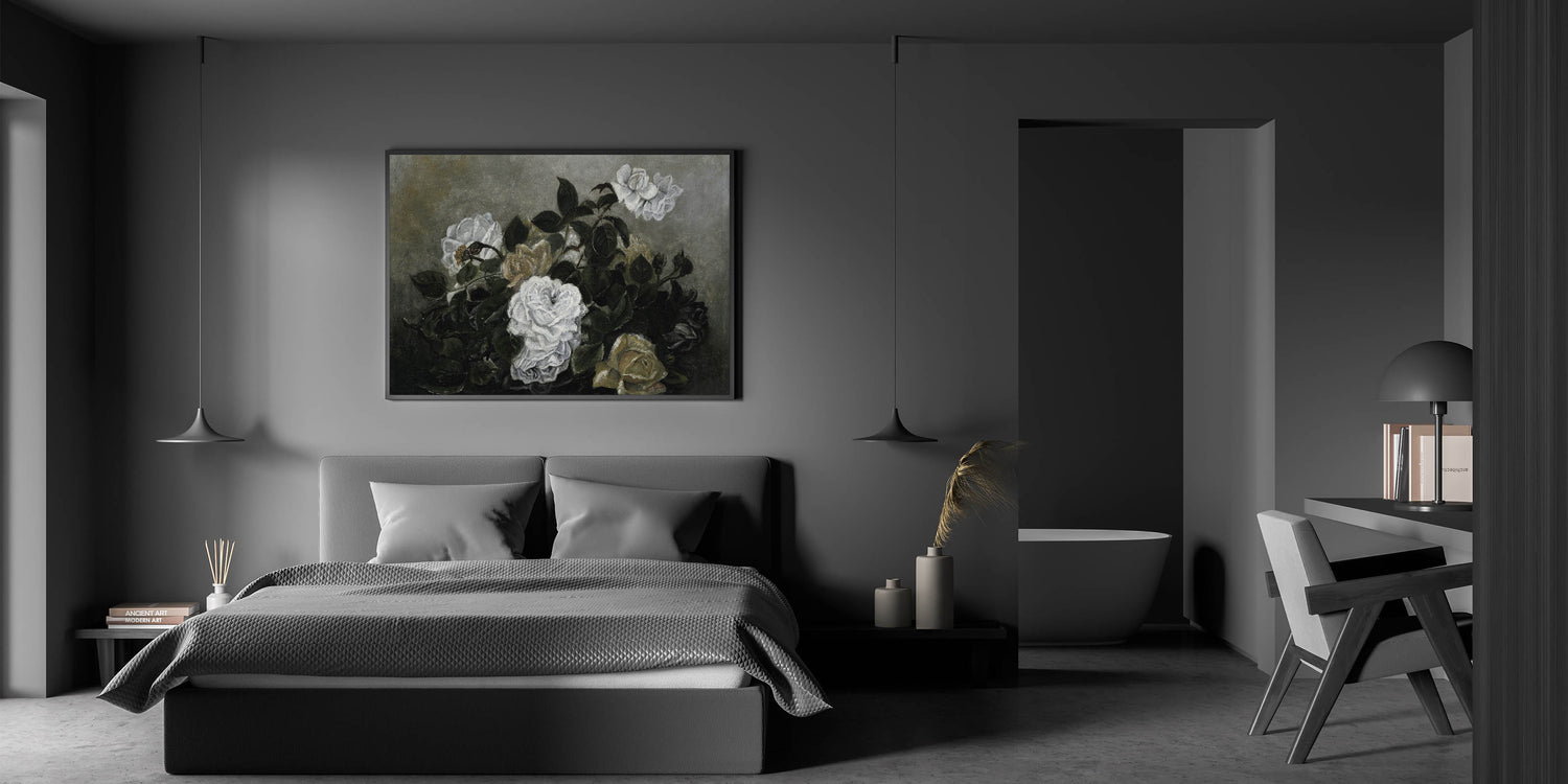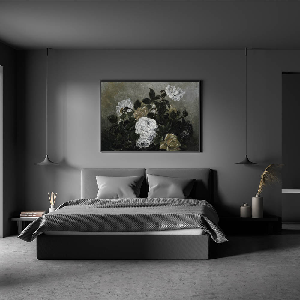 Elevate your interior with this exquisite piece of Dark Moody wall art, featuring a dramatic arrangement of white roses set against a background of lush, dark green foliage. The subtle play of light and shadow brings a timeless elegance to this print, making it an ideal addition for those seeking moody art for their home decor. Whether placed in a living room, bedroom, or study, this piece adds a refined, atmospheric touch.