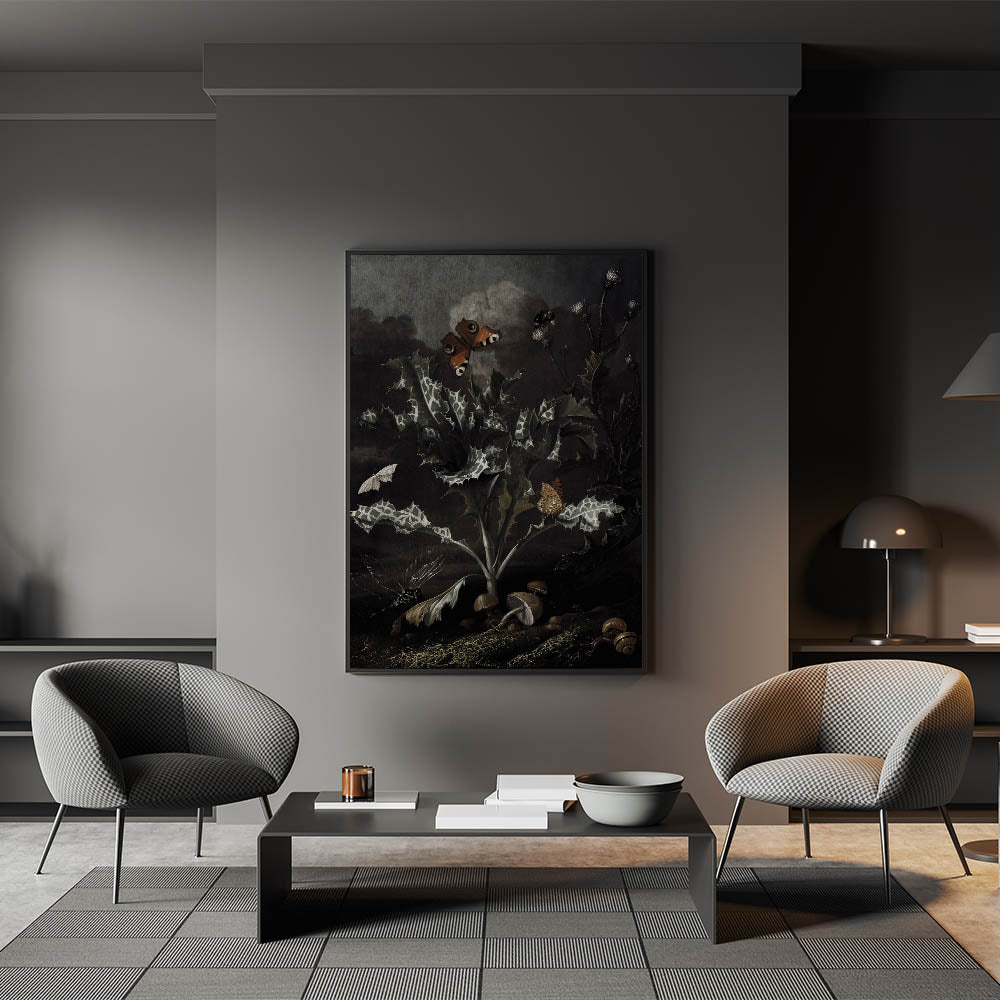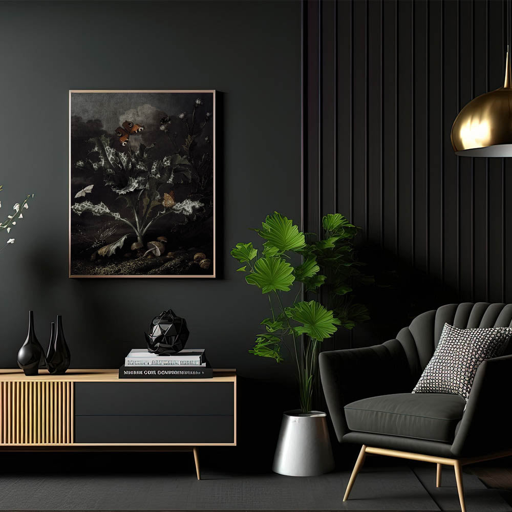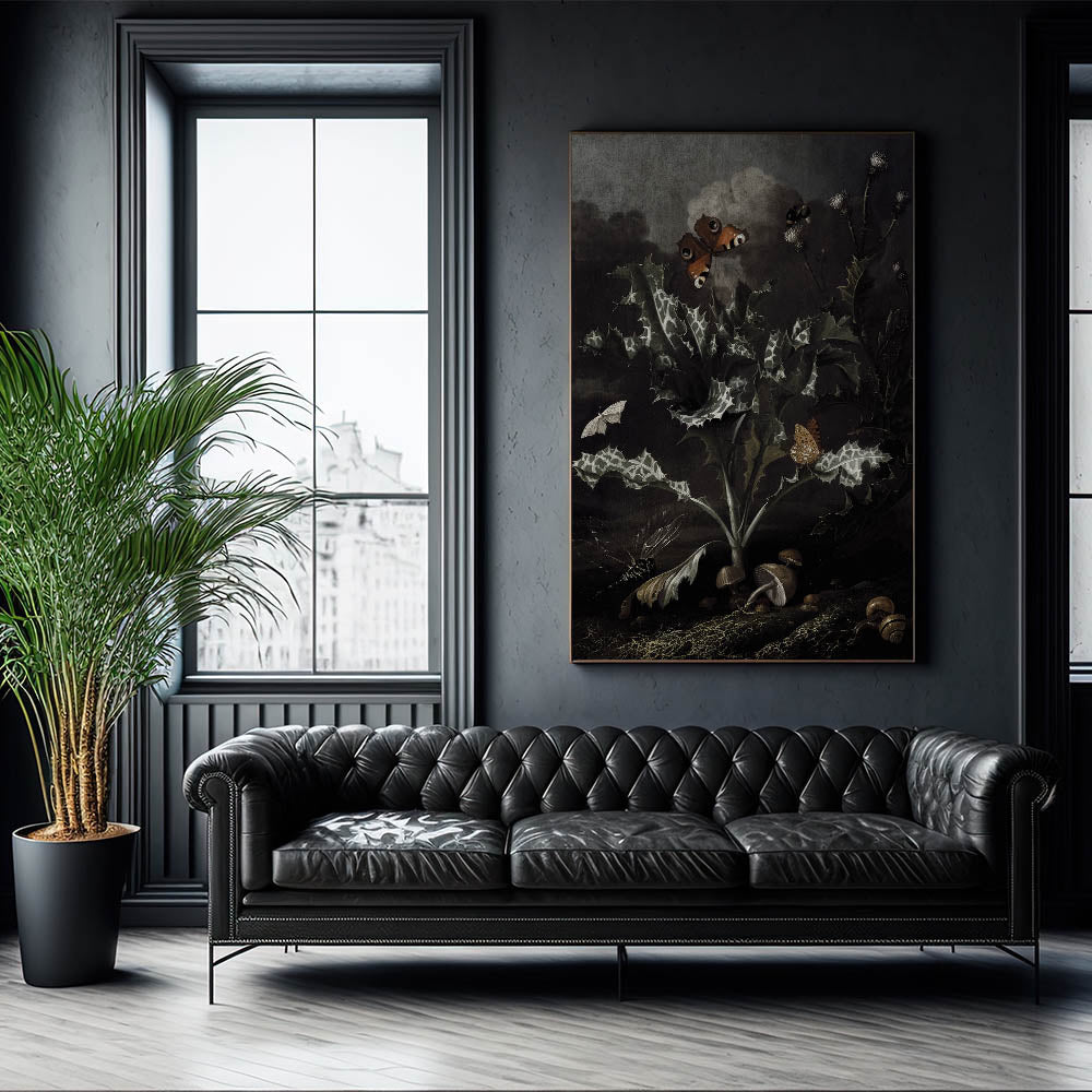 Explore the allure of nature’s dark beauty with this Moody Art Print, featuring a stunning depiction of thistles, butterflies, and forest elements. The intricate details of the leaves and insects create an atmospheric piece that embodies dark moody wall art. This artwork captures the essence of dark art decor, with its shadowy tones and botanical richness, making it a perfect choice for transforming your space into an elegant and mysterious haven.