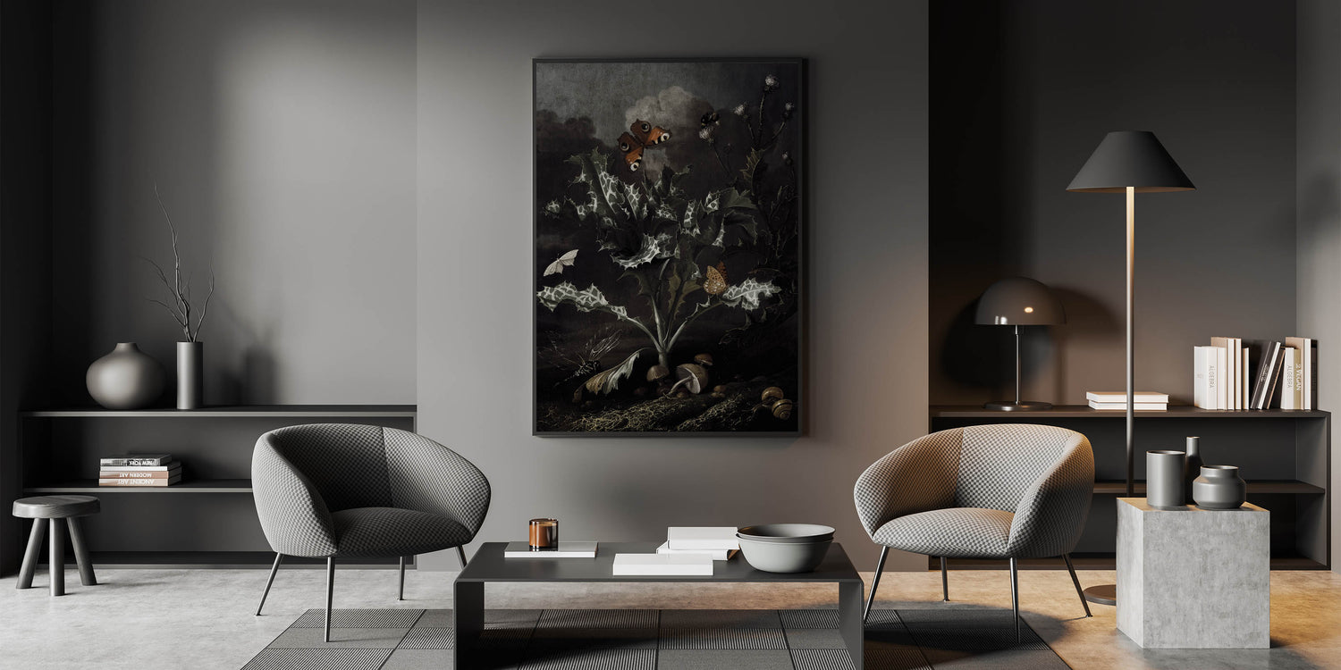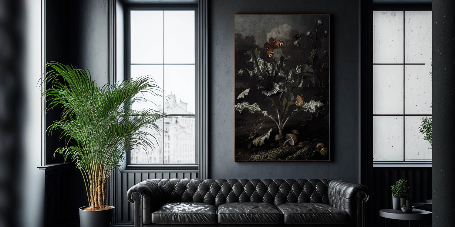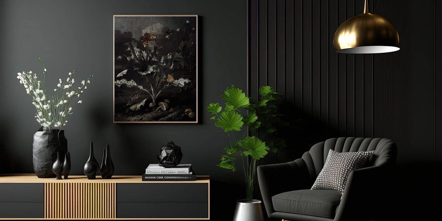 Explore the allure of nature’s dark beauty with this Moody Art Print, featuring a stunning depiction of thistles, butterflies, and forest elements. The intricate details of the leaves and insects create an atmospheric piece that embodies dark moody wall art. This artwork captures the essence of dark art decor, with its shadowy tones and botanical richness, making it a perfect choice for transforming your space into an elegant and mysterious haven.
