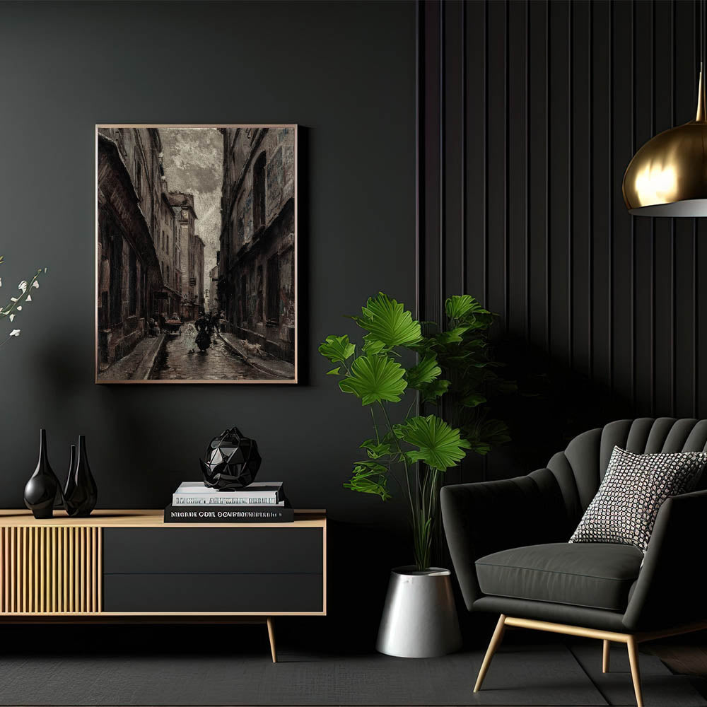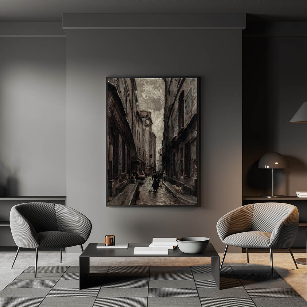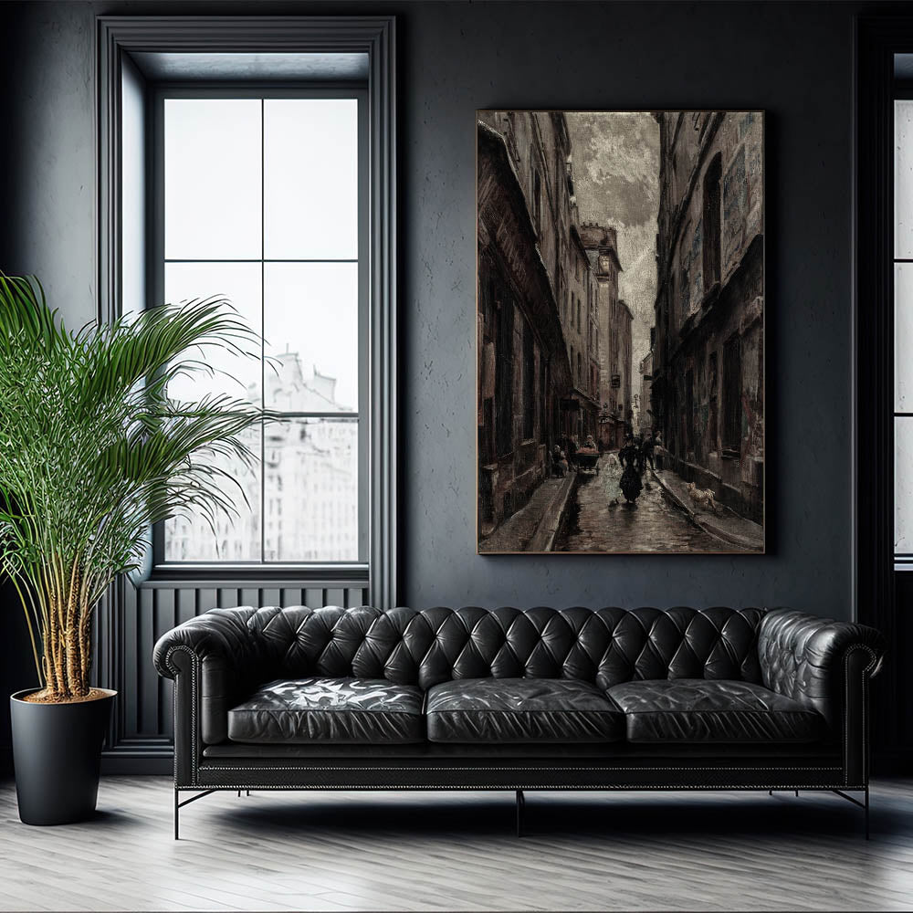 Bring the atmosphere of a vintage cityscape into your home with this Moody Art Print, showcasing a shadowy street scene that captures the essence of dark art decor. The narrow alley, framed by towering buildings, and the subtle details of pedestrians evoke a sense of timeless elegance. Perfect for those who appreciate dark moody wall art, this piece is designed to transform your space into a realm of dramatic and artistic expression.