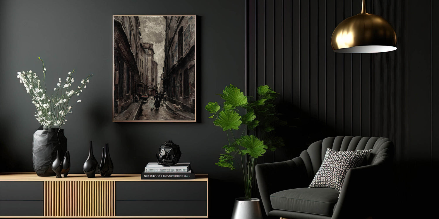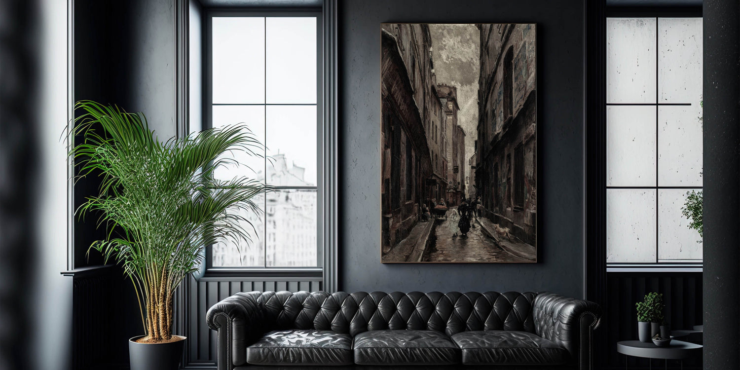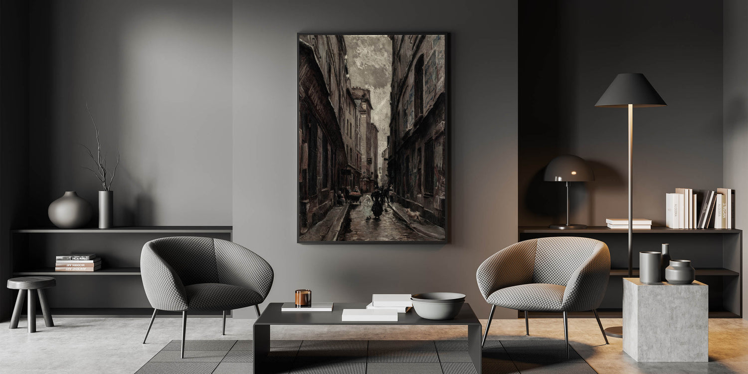 Bring the atmosphere of a vintage cityscape into your home with this Moody Art Print, showcasing a shadowy street scene that captures the essence of dark art decor. The narrow alley, framed by towering buildings, and the subtle details of pedestrians evoke a sense of timeless elegance. Perfect for those who appreciate dark moody wall art, this piece is designed to transform your space into a realm of dramatic and artistic expression.