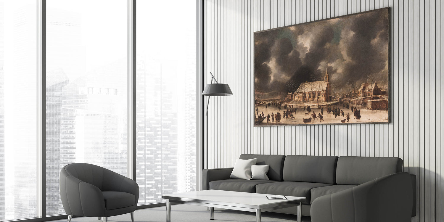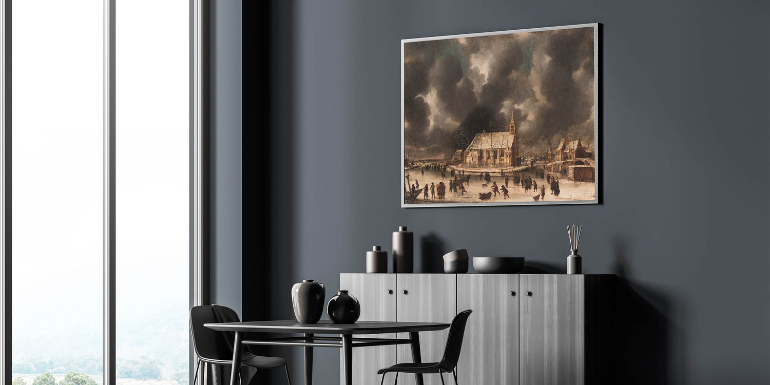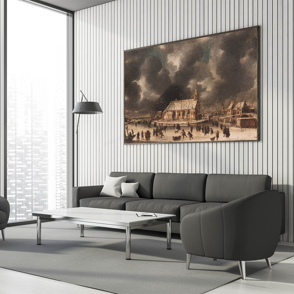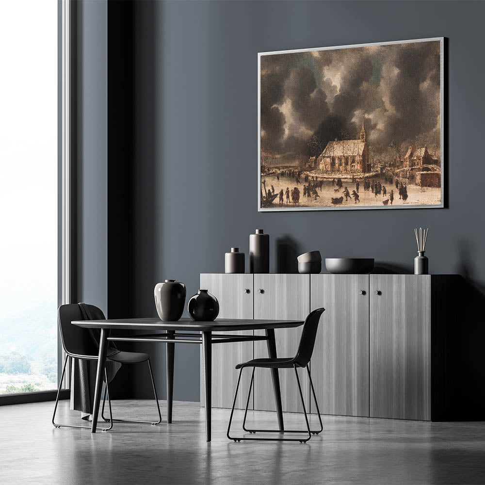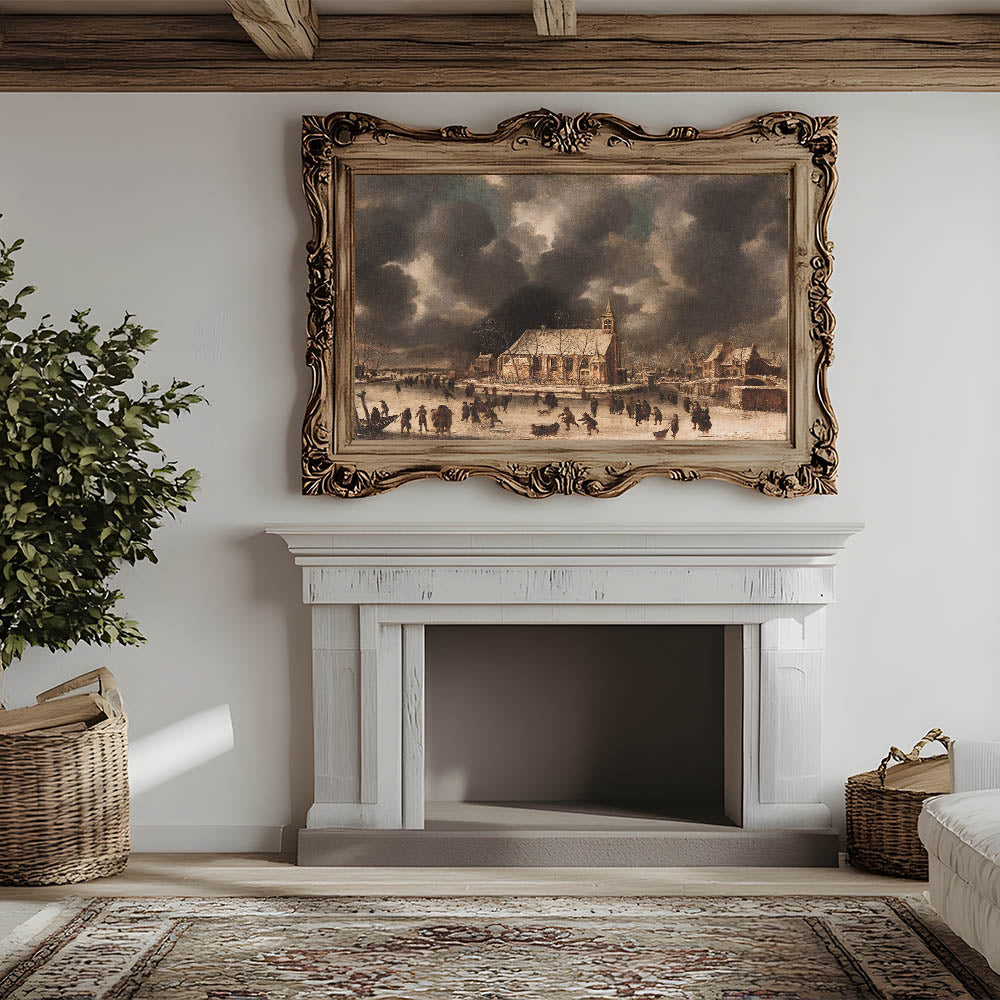 Step into the nostalgic charm of a winter village with this Dark Moody wall art, featuring townspeople gathered on a frozen river beneath a dramatic, cloud-filled sky. The artwork captures the essence of a historic village, with snow-covered buildings, a church, and people engaging in lively winter activities. The rich, muted colors and intricate details make this piece ideal for adding depth and character to any interior space. Perfect for living rooms, studies, or entryways, it brings a sense of warmth and old-world charm to your home decor.