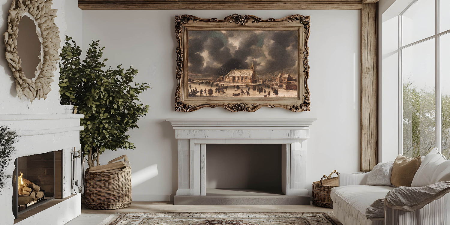 This atmospheric art print is designed for those who appreciate the beauty of historic scenes and moody interiors. Transform your space with this timeless piece, perfect for evoking a sense of winter wonder and charm.