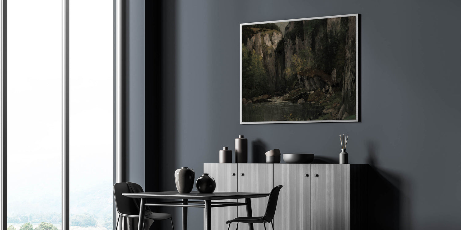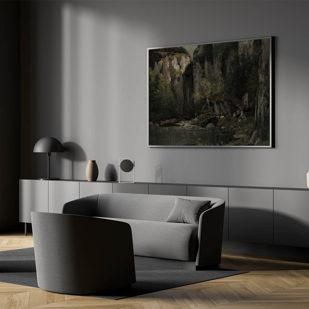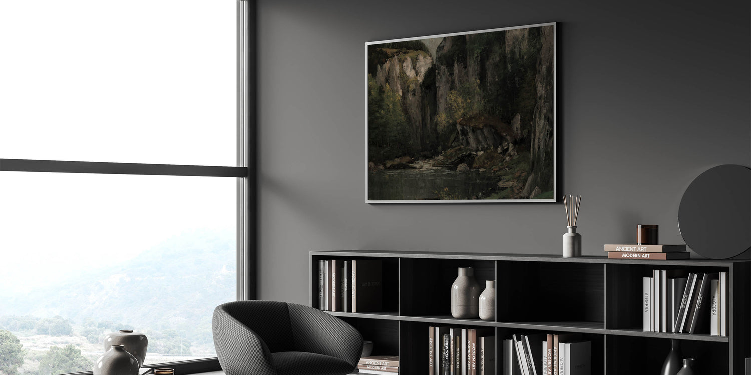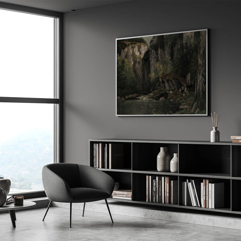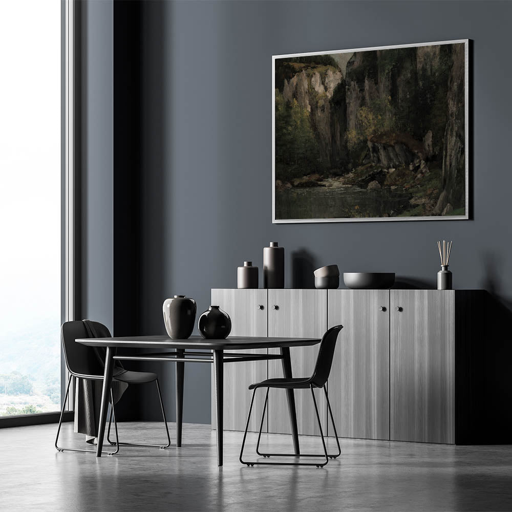 Immerse yourself in the tranquil beauty of nature with this Dark Moody wall art, showcasing a serene cliffside landscape enveloped in deep, muted forest tones. The painting captures the rugged cliffs and dense tree foliage, reflecting on the still waters below. This atmospheric piece is perfect for those seeking to bring a touch of moody elegance and natural beauty into their space. Ideal for living rooms, studies, or bedrooms, it adds a sense of calm and sophistication to any interior.