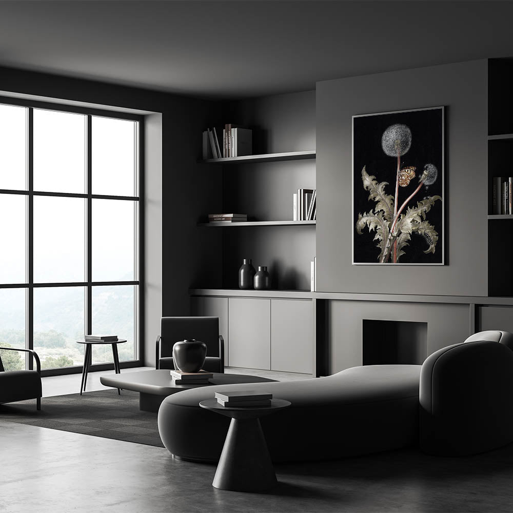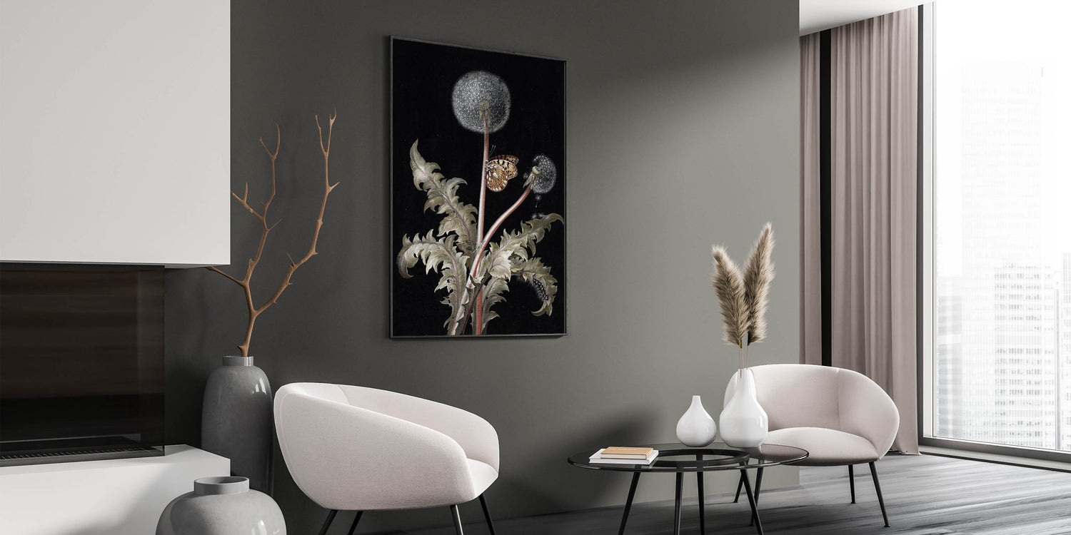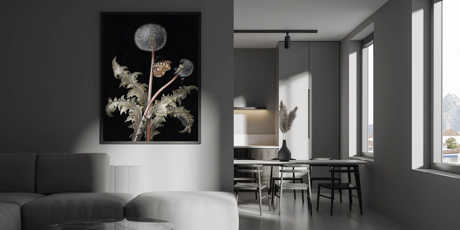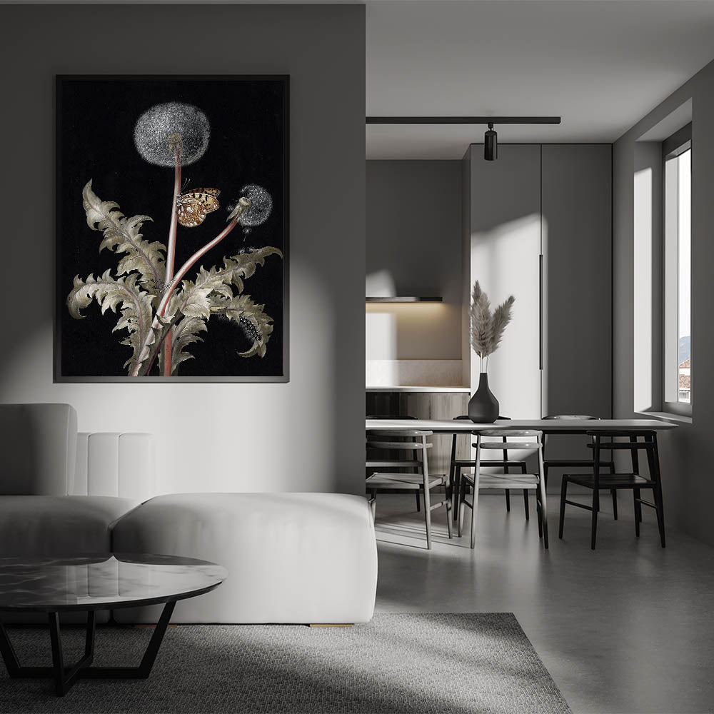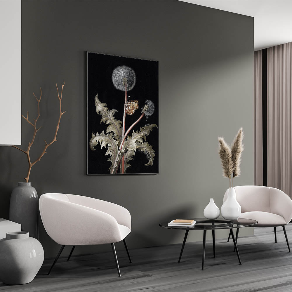 This beautiful Dark Moody wall art captures the delicate intricacies of nature, featuring a butterfly perched on a dandelion against a deep, dark background. The soft tones of the dandelion fluff and the fine details of the butterfly’s wings create a striking contrast, emphasizing the quiet elegance of the natural world. Perfect for lovers of both floral and wildlife art, this piece adds a touch of serenity and sophistication to any space. The rich, dark tones make it ideal for moody interiors, blending effortlessly with both modern and vintage decor.