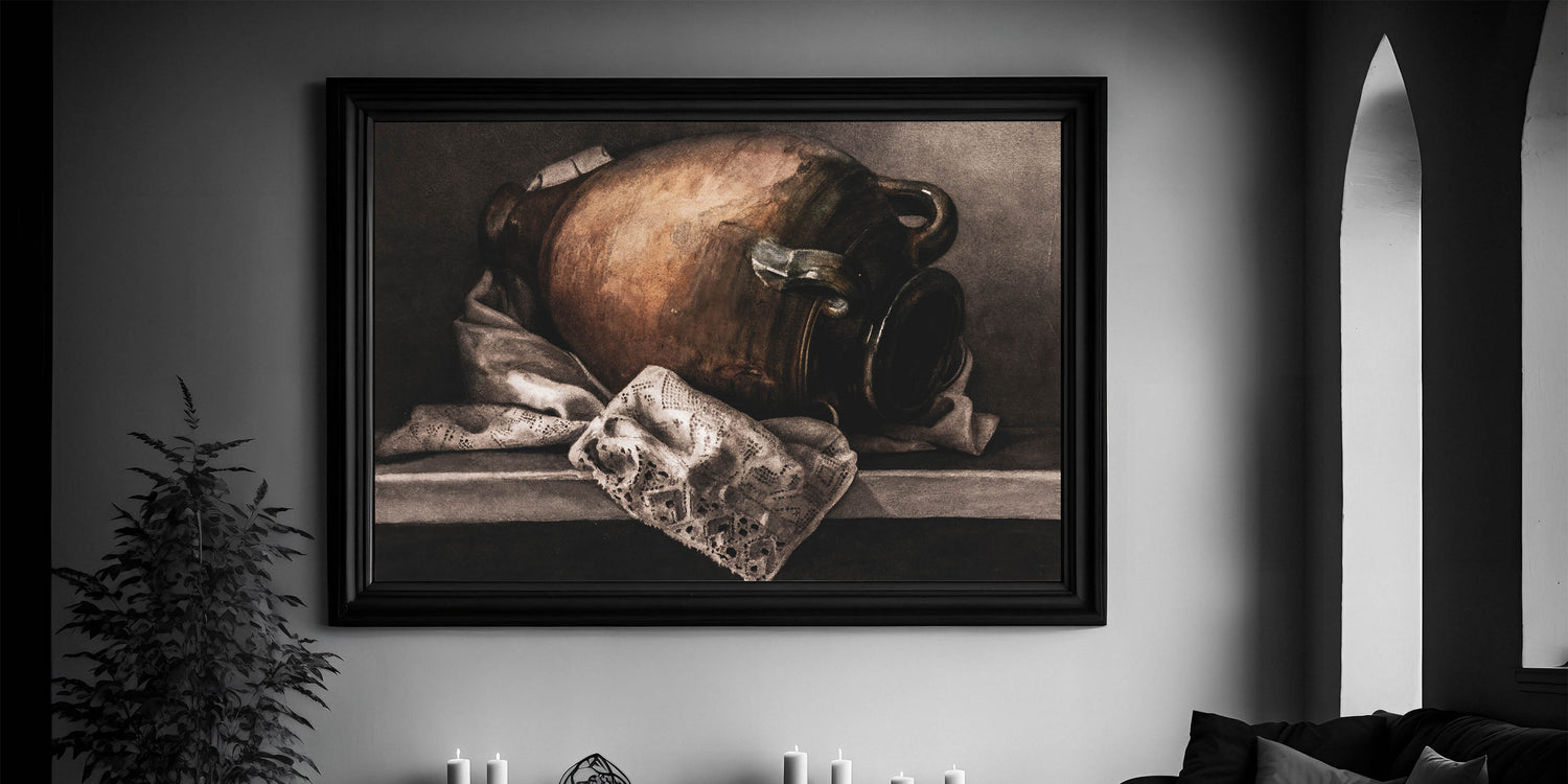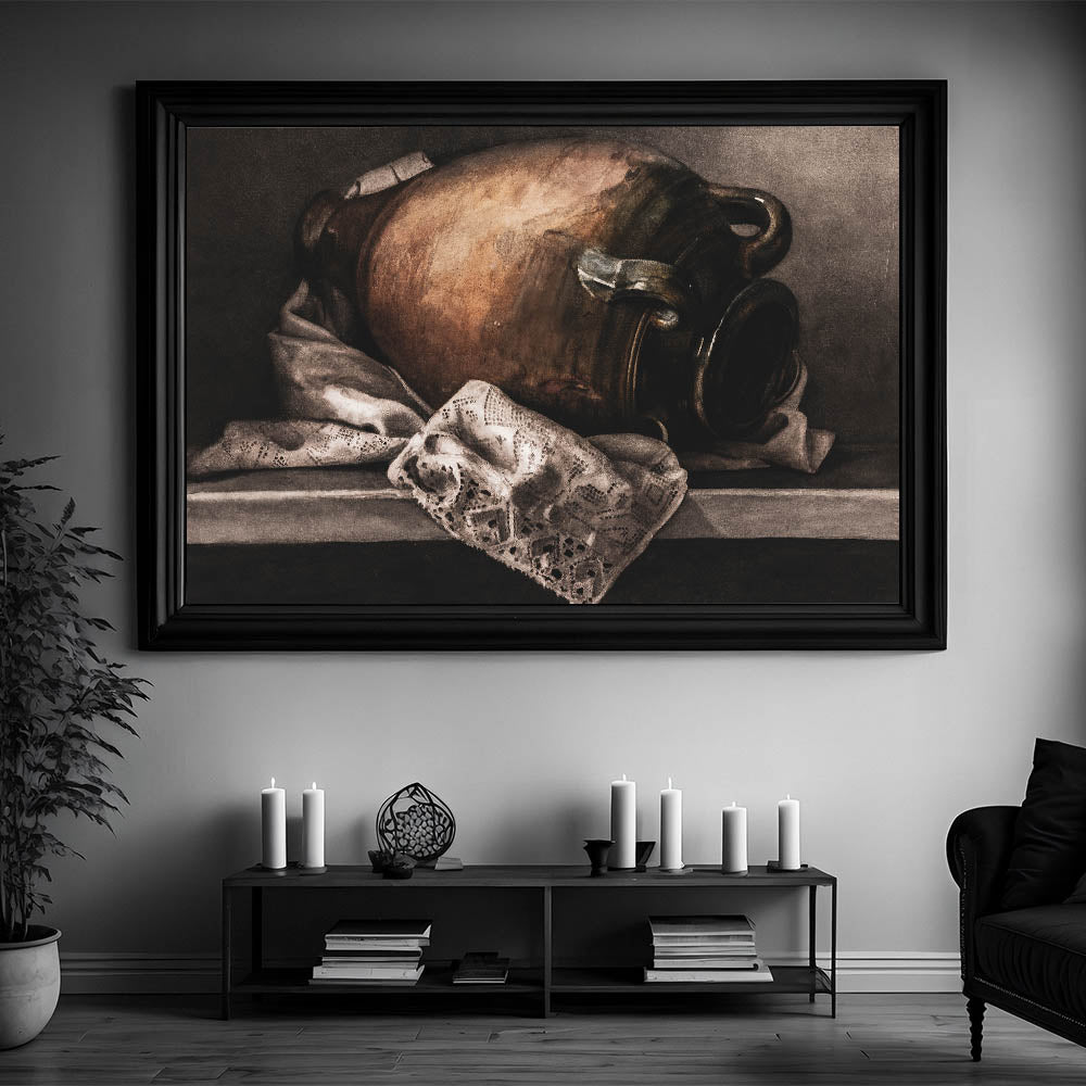 Bring a sense of classic elegance to your space with this Moody Still Life Vase Art. This piece captures a rustic vase resting on a delicate lace cloth, enveloped in shadowy tones that emphasize its antique charm. The detailed textures and rich, dark colors create a dramatic focal point that is perfect for anyone looking to enhance their interior with moody and timeless decor. Ideal for living rooms, dining areas, or studies, this wall art brings a sense of sophistication and vintage charm.