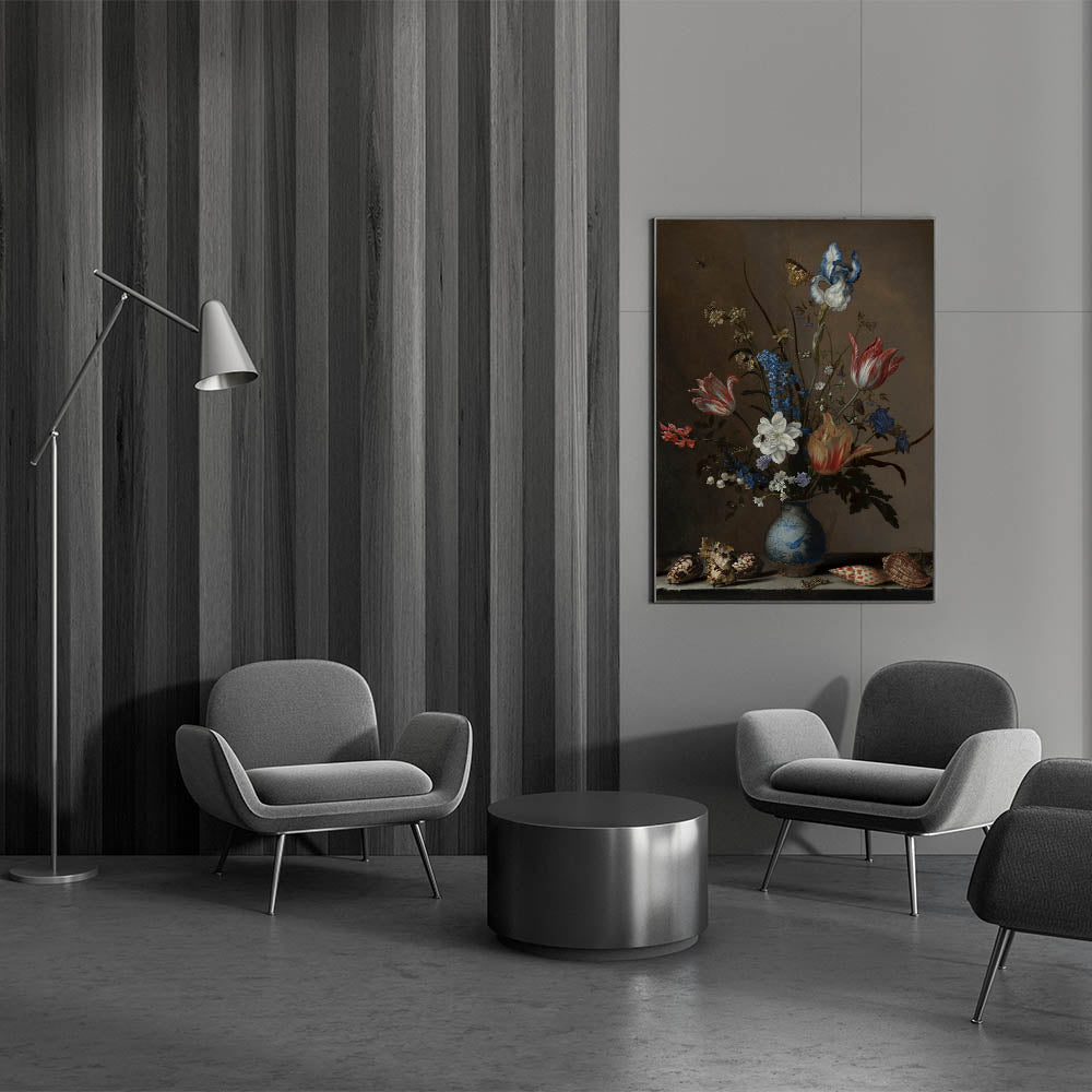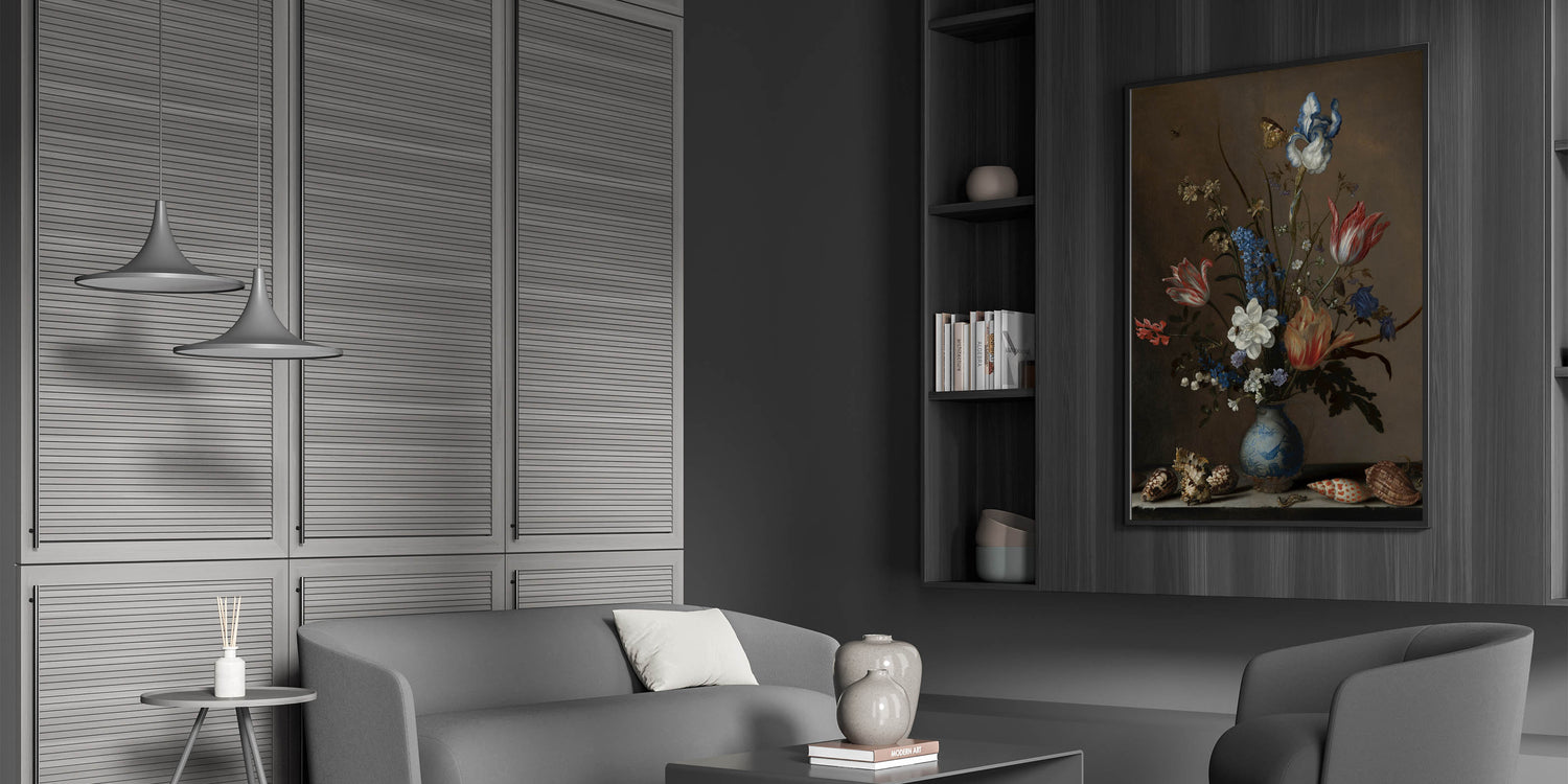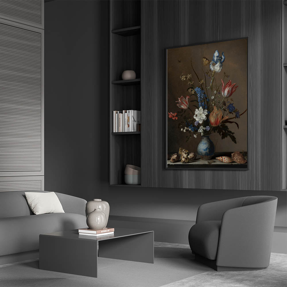 Transform your space with the timeless elegance of this Dark Moody Wall Art piece, showcasing a beautifully detailed floral still life. Featuring an array of vibrant flowers in a delicate blue vase, this artwork captures the essence of dark art decor with its rich hues and meticulous details. The composition includes tulips, irises, and other blossoms, creating a visual feast that embodies the classic beauty of moody art prints.