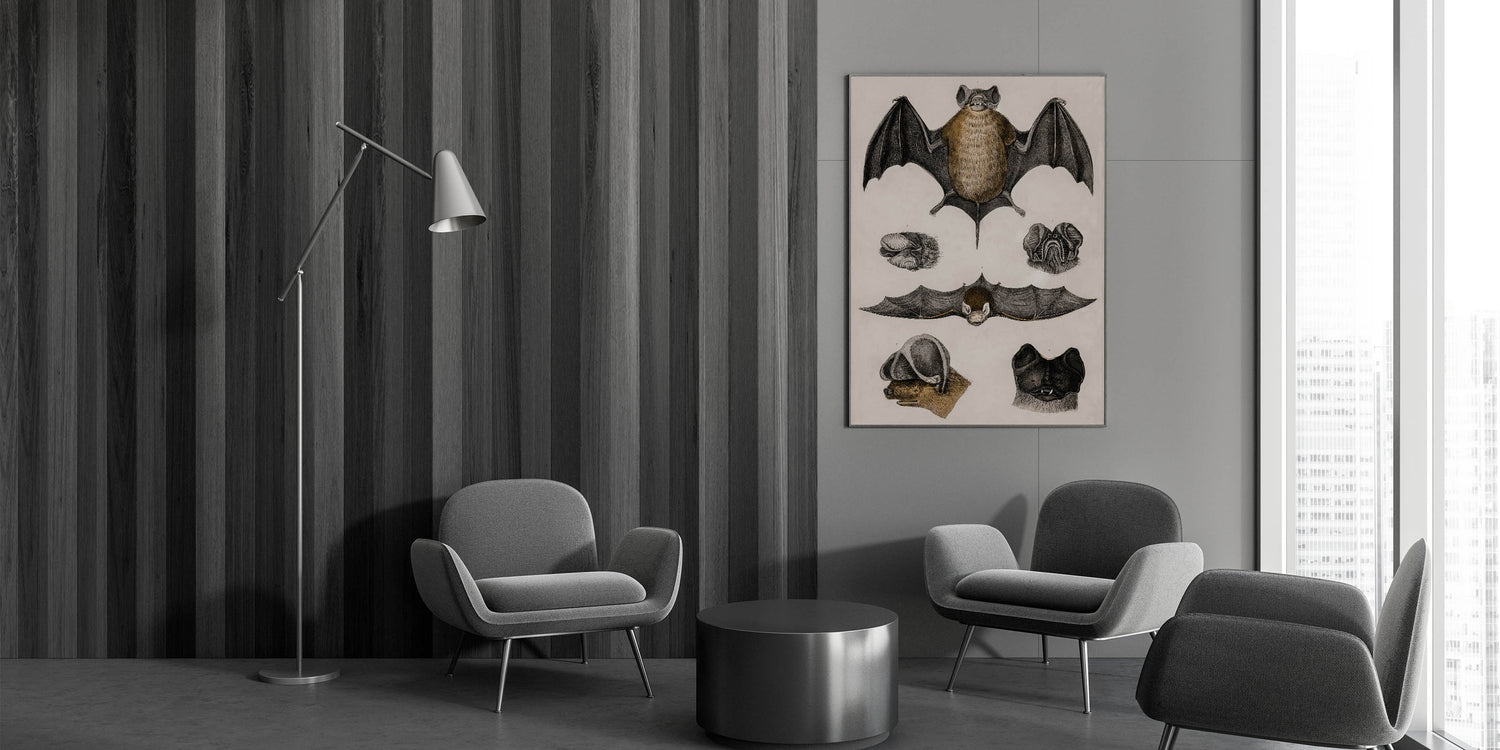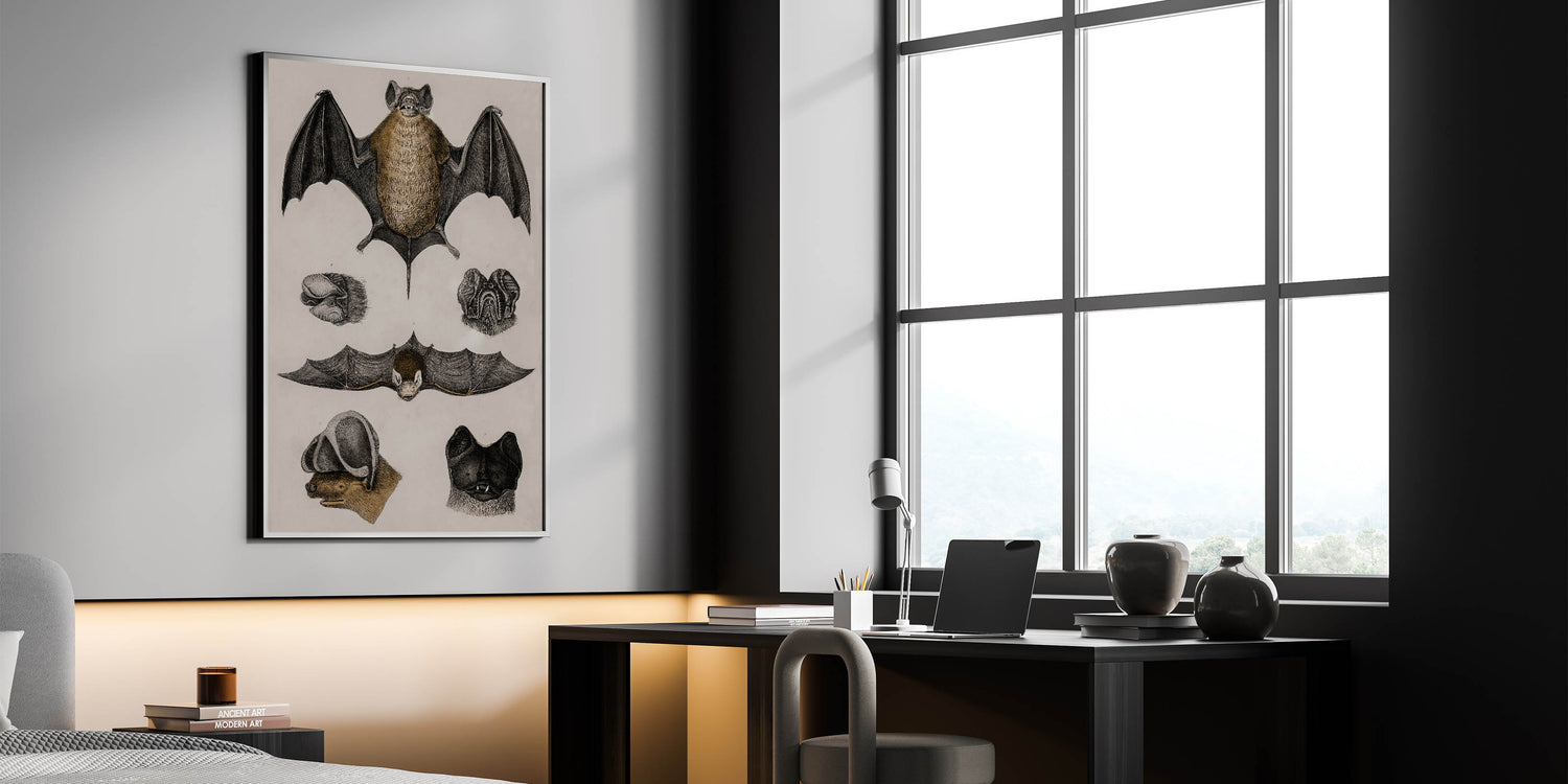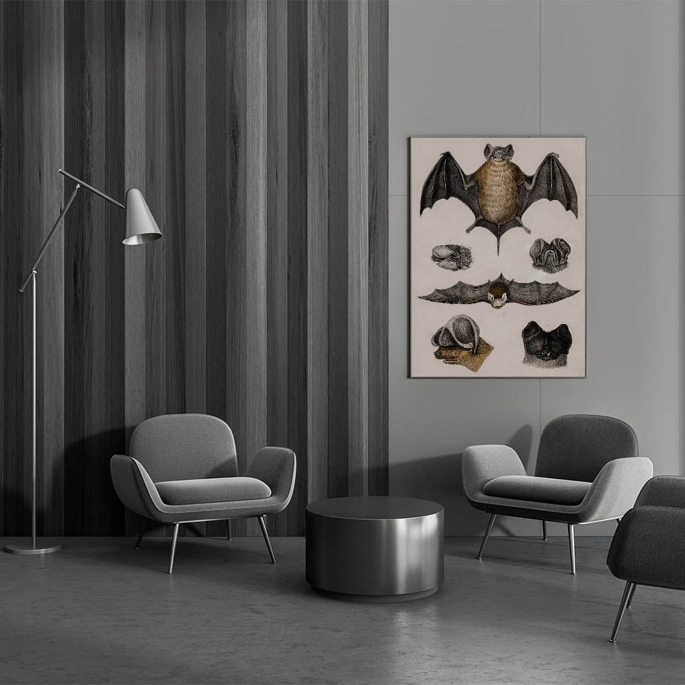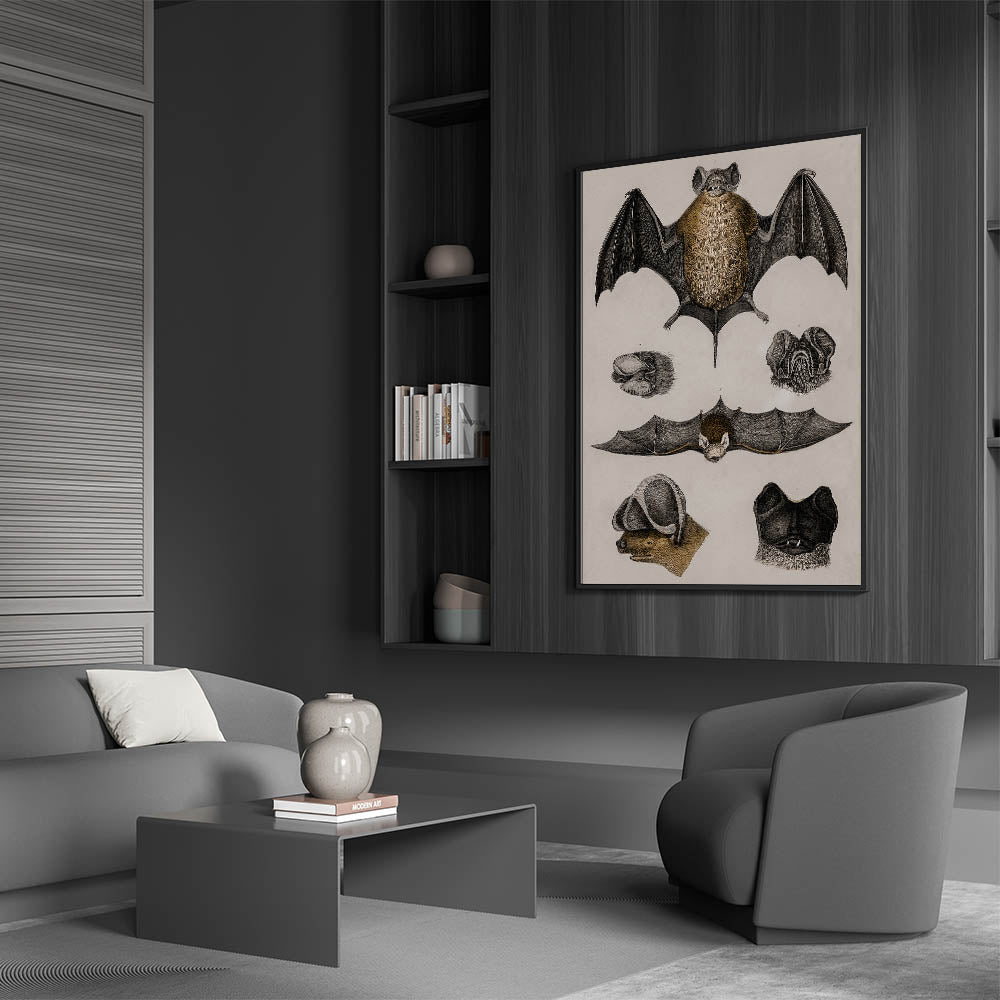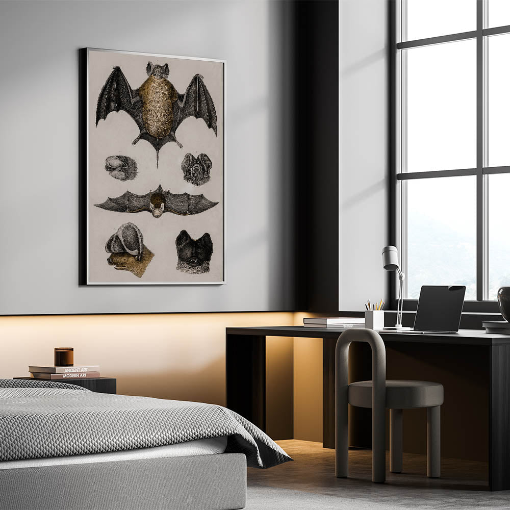 Dive into the depths of grunge-inspired wall decor with this striking vintage bat illustration. This piece showcases a collection of bats intricately detailed in a dark, distressed style, perfect for those seeking an industrial-style grunge canvas for their home. The use of muted browns, black, and gray tones enhances the piece’s edgy, raw look, making it an eye-catching addition to any modern or vintage-inspired space. Whether displayed in a living room, home office, or bedroom, this grunge aesthetic art piece brings a unique, atmospheric vibe to your surroundings.
