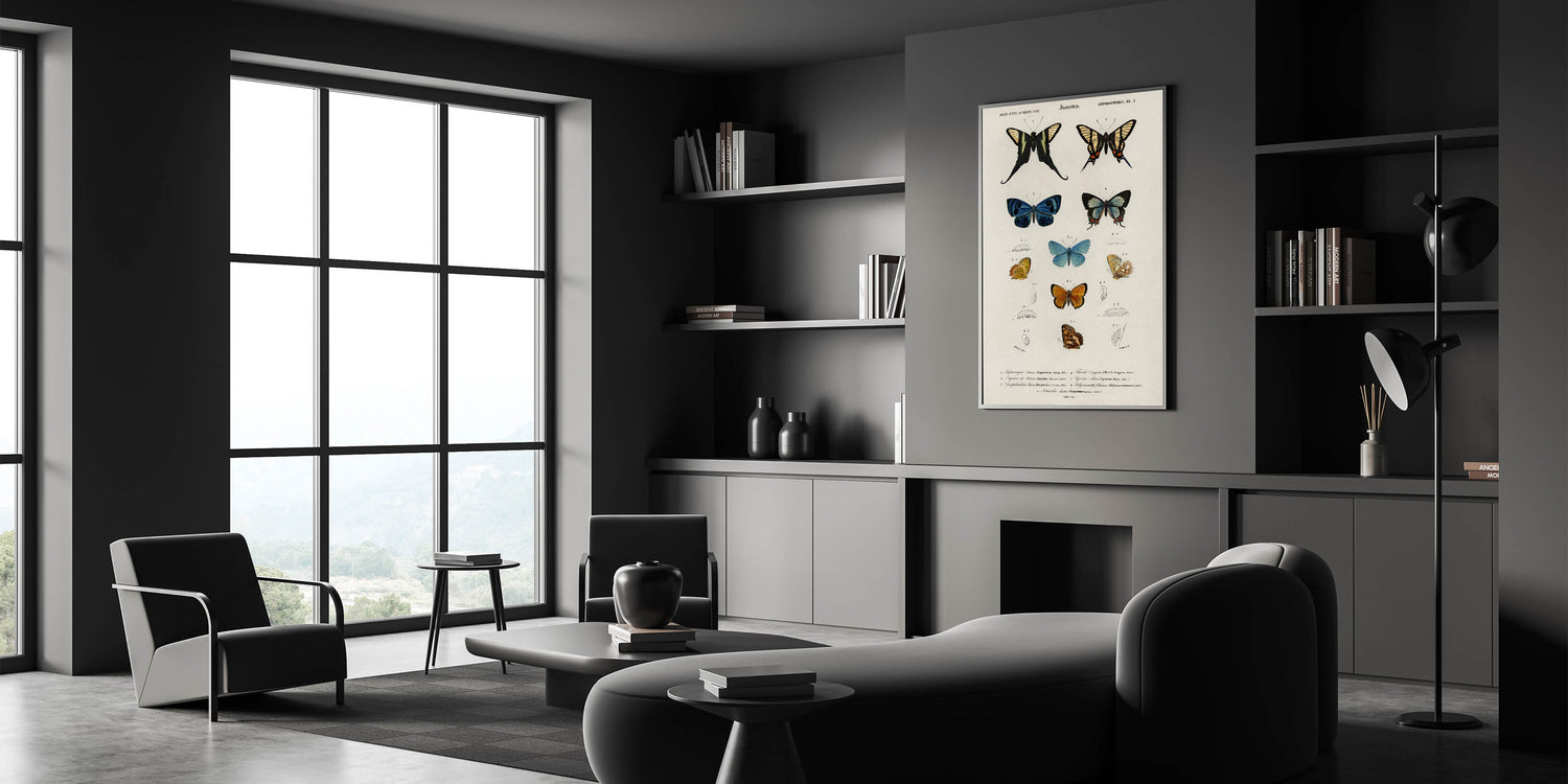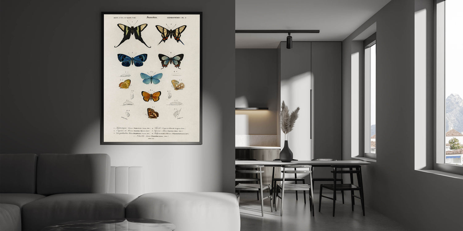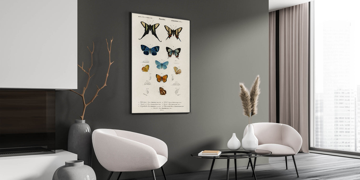 Add a touch of vintage academia to your space with this grunge-inspired wall decor, featuring a detailed chart of butterflies and their developmental stages. The distressed, aged look paired with vibrant butterfly illustrations offers a nostalgic, educational appeal that suits both modern and vintage-inspired interiors. This piece is perfect for lovers of vintage grunge artwork, combining scientific aesthetics with a touch of urban grunge art.