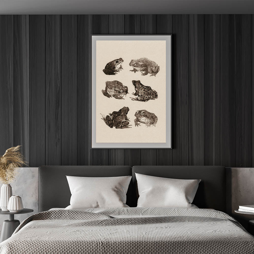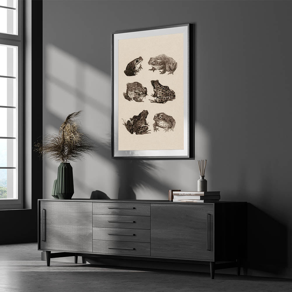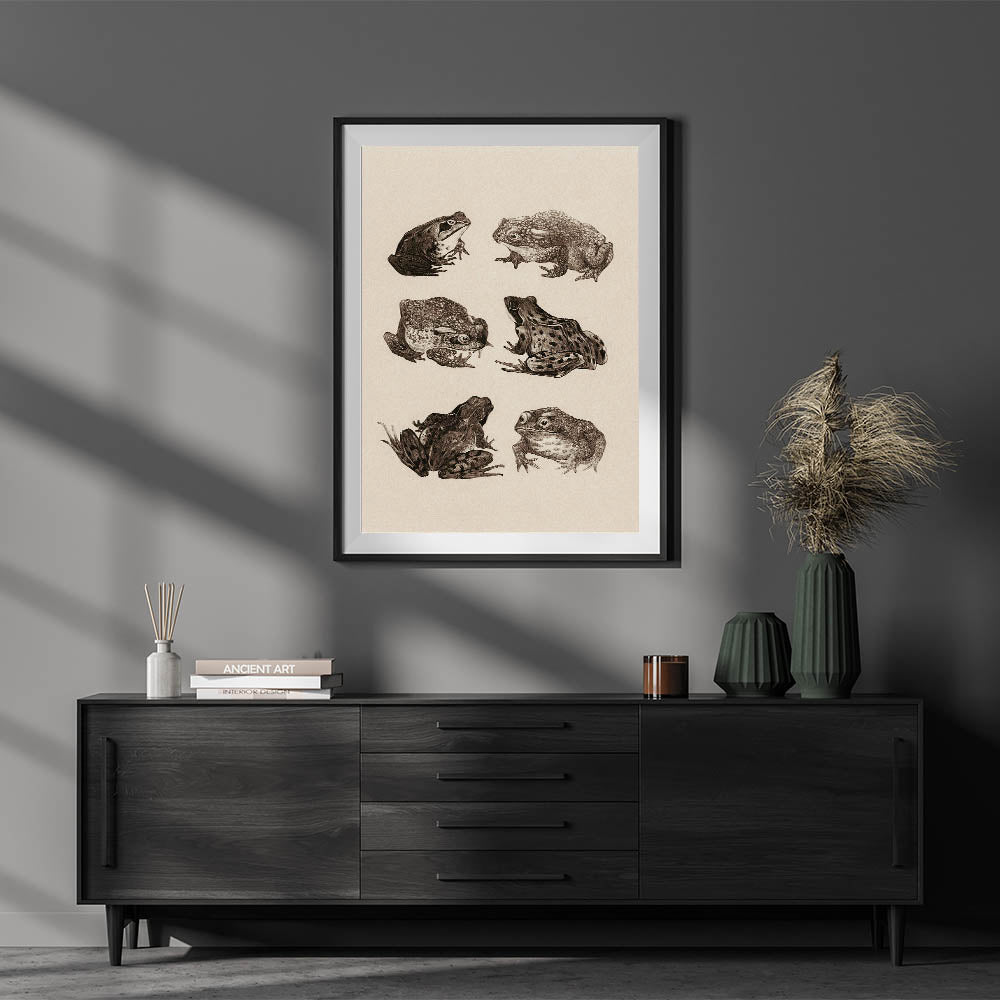 Add an element of rustic charm to your space with our Vintage Grunge Frog Illustration. This art print features a detailed sketch of various frog species, capturing their unique textures and forms in a monochromatic, distressed style. The vintage-inspired look, combined with a grunge aesthetic, makes this piece ideal for those seeking retro and vintage grunge artwork with a naturalistic twist.
