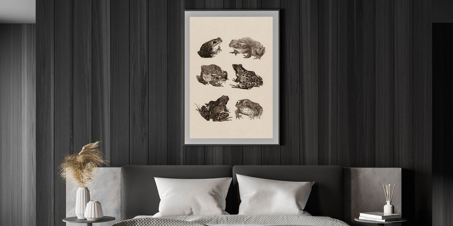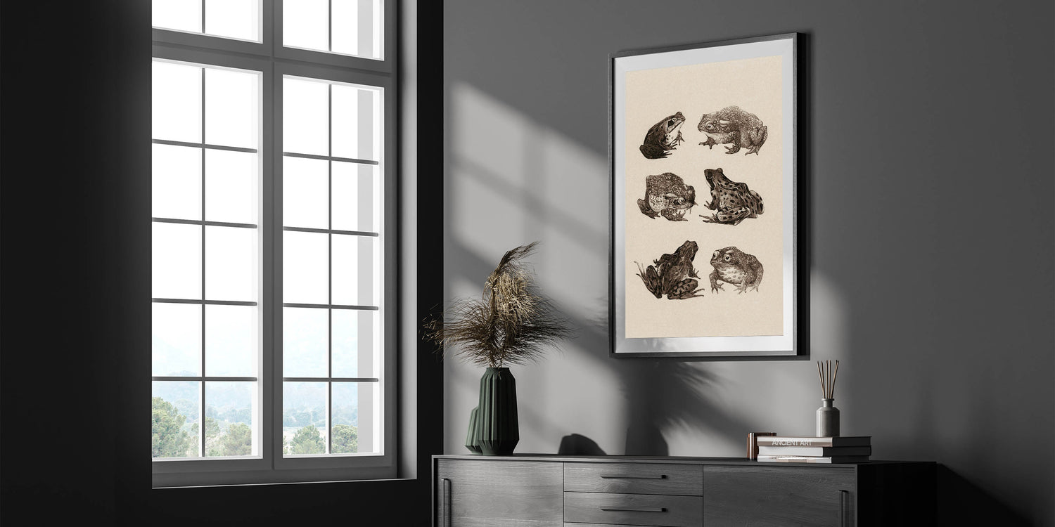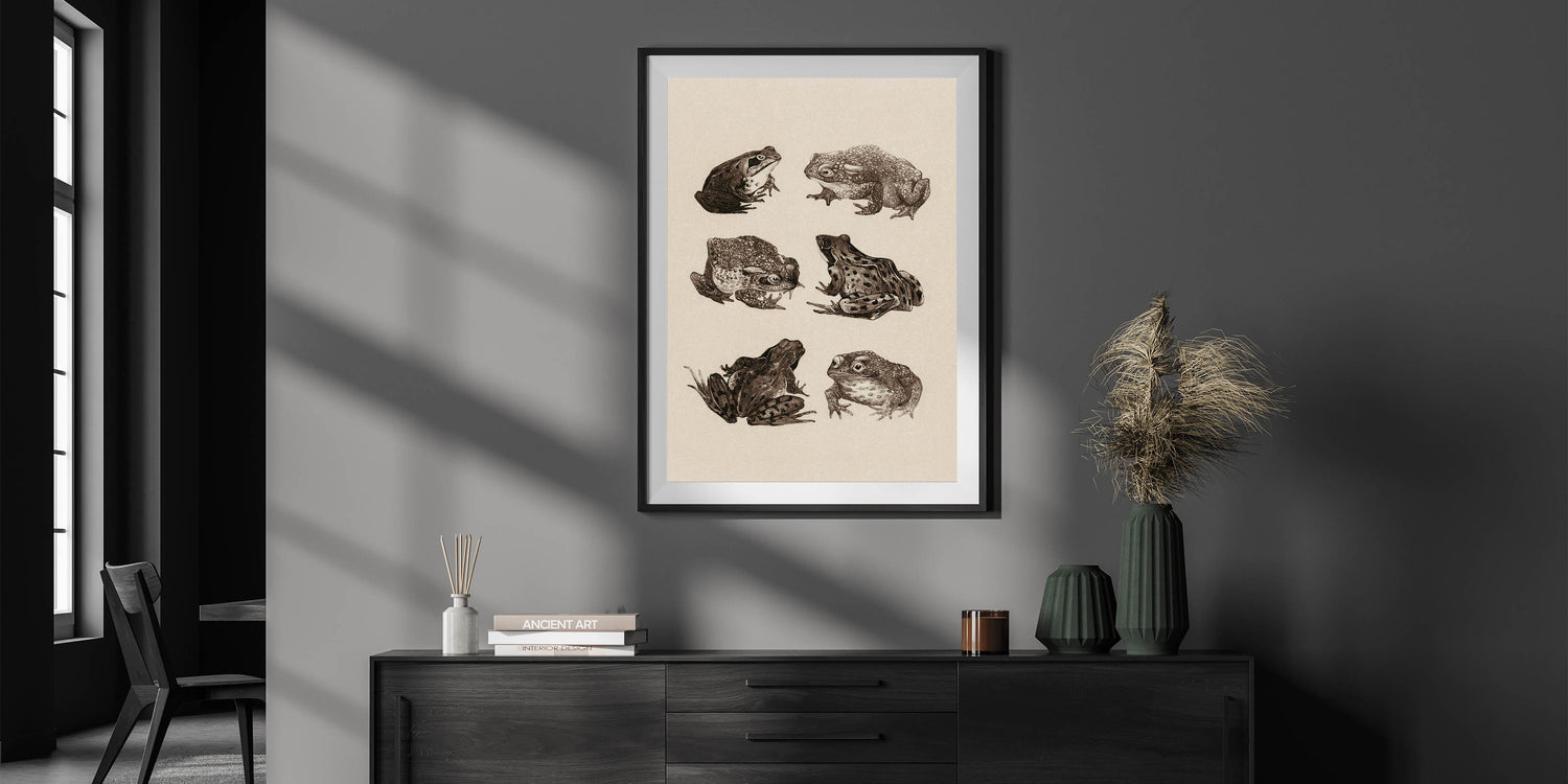 Add an element of rustic charm to your space with our Vintage Grunge Frog Illustration. This art print features a detailed sketch of various frog species, capturing their unique textures and forms in a monochromatic, distressed style. The vintage-inspired look, combined with a grunge aesthetic, makes this piece ideal for those seeking retro and vintage grunge artwork with a naturalistic twist.