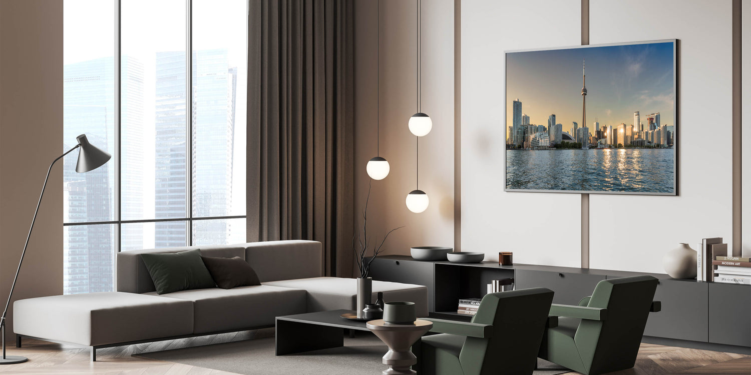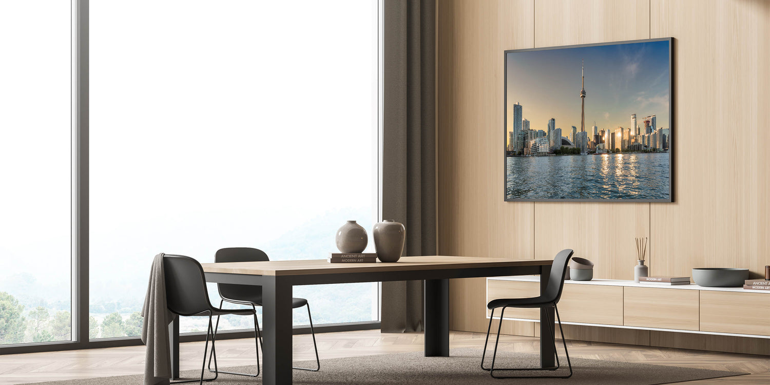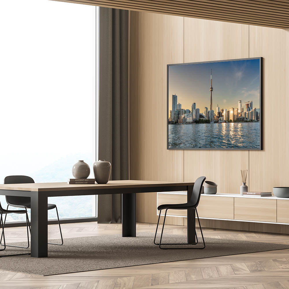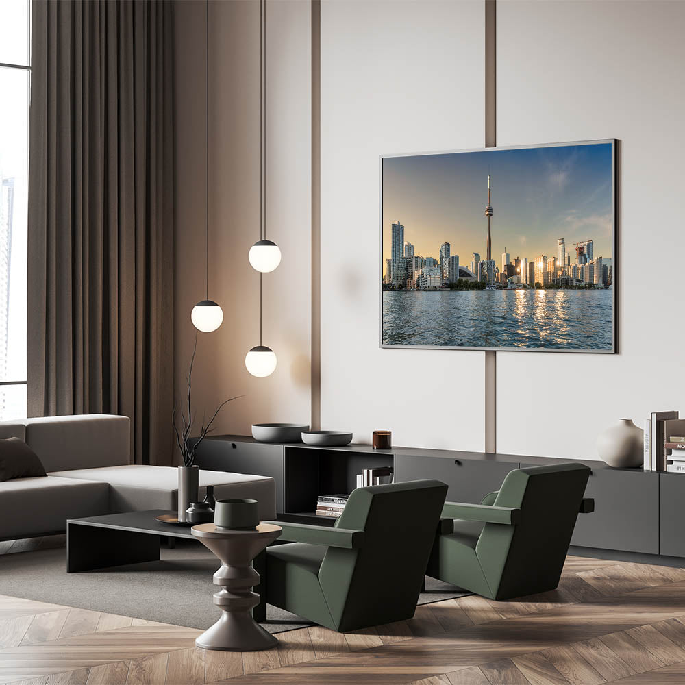 Capture the warm glow of the golden hour with this stunning Toronto skyline art. This piece beautifully portrays the city bathed in the soft, golden light of the setting sun, with the iconic CN Tower standing majestically among the skyscrapers. The sunlight reflects off the buildings and the calm waters of Lake Ontario, creating a serene and radiant atmosphere. Perfect for modern and classic interiors alike, this artwork adds a touch of warmth and elegance to any room. Available in various formats, including stretched canvas, framed prints, and acrylic glass, this versatile piece can easily enhance your decor.