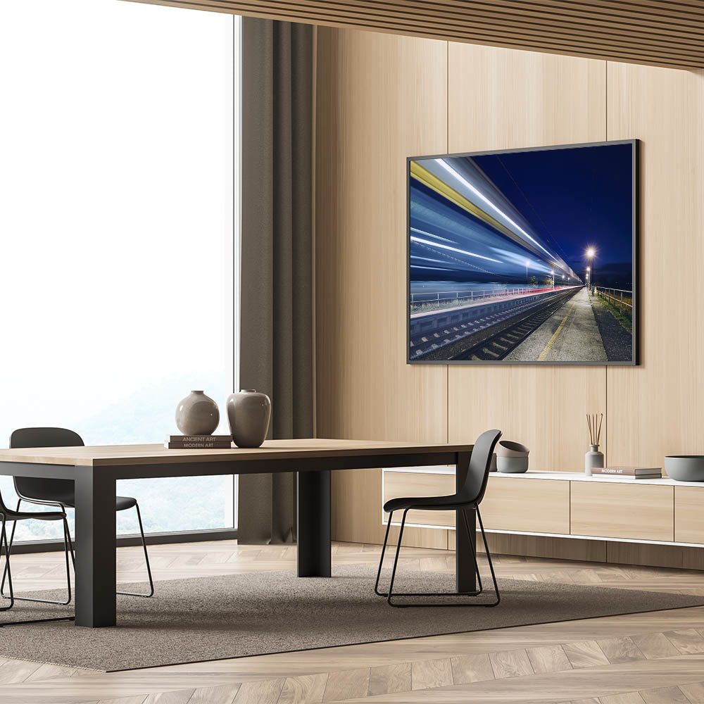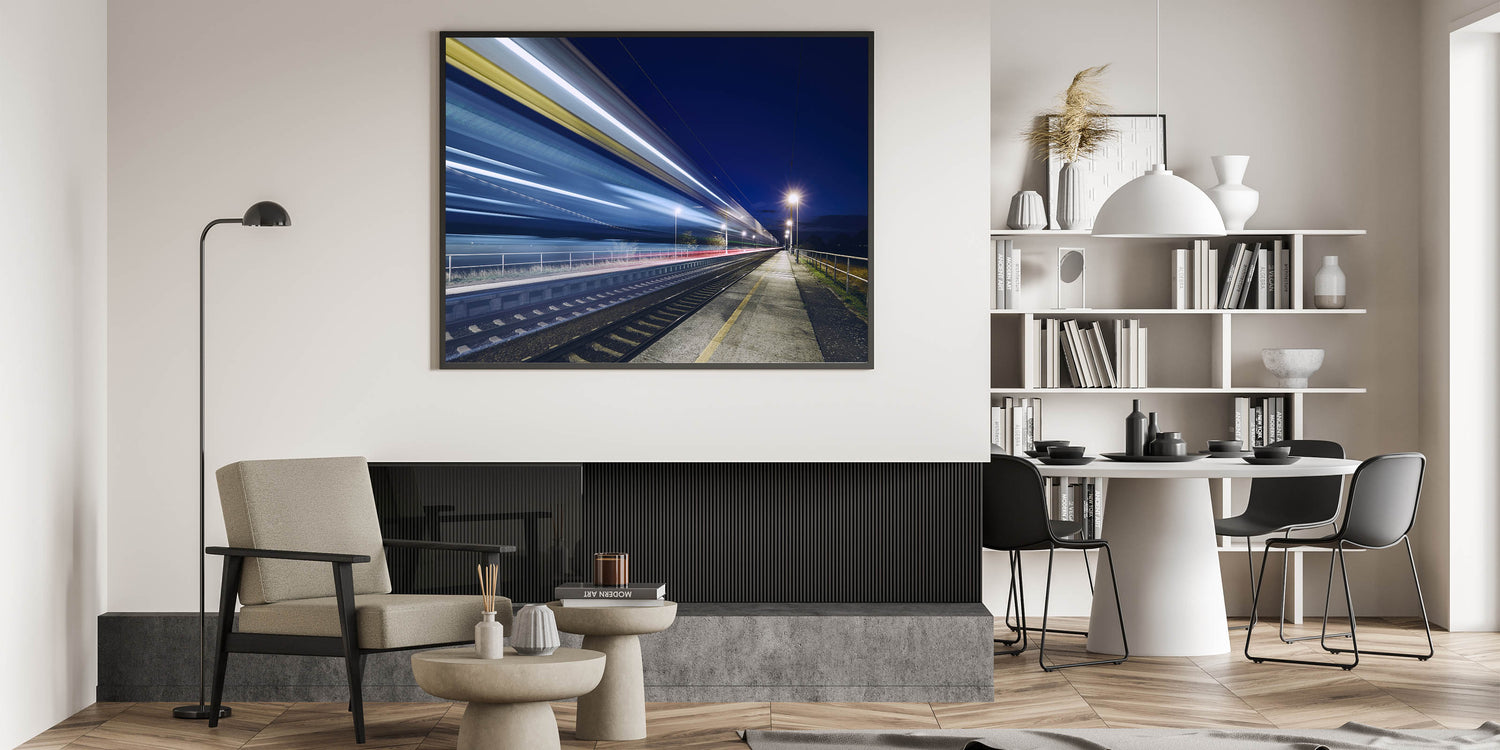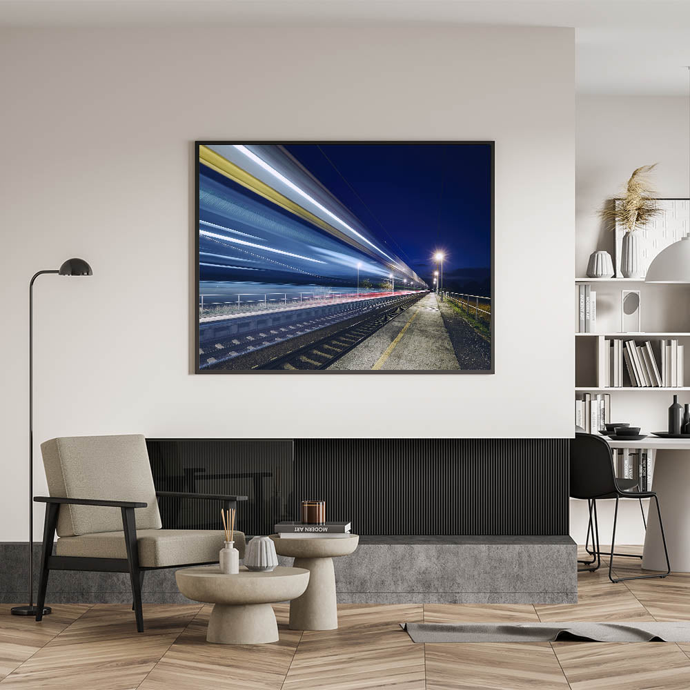 Capture the thrill of motion and the mystery of the night with this dynamic wall art featuring a long-exposure shot of a speeding train. This striking canvas print showcases the vibrant streaks of light left in the train's wake as it races through a quiet station, set against a deep, dark sky. Perfect for modern interiors, this piece adds a sense of energy and movement, making it an ideal choice for those who appreciate contemporary, urban-inspired decor.