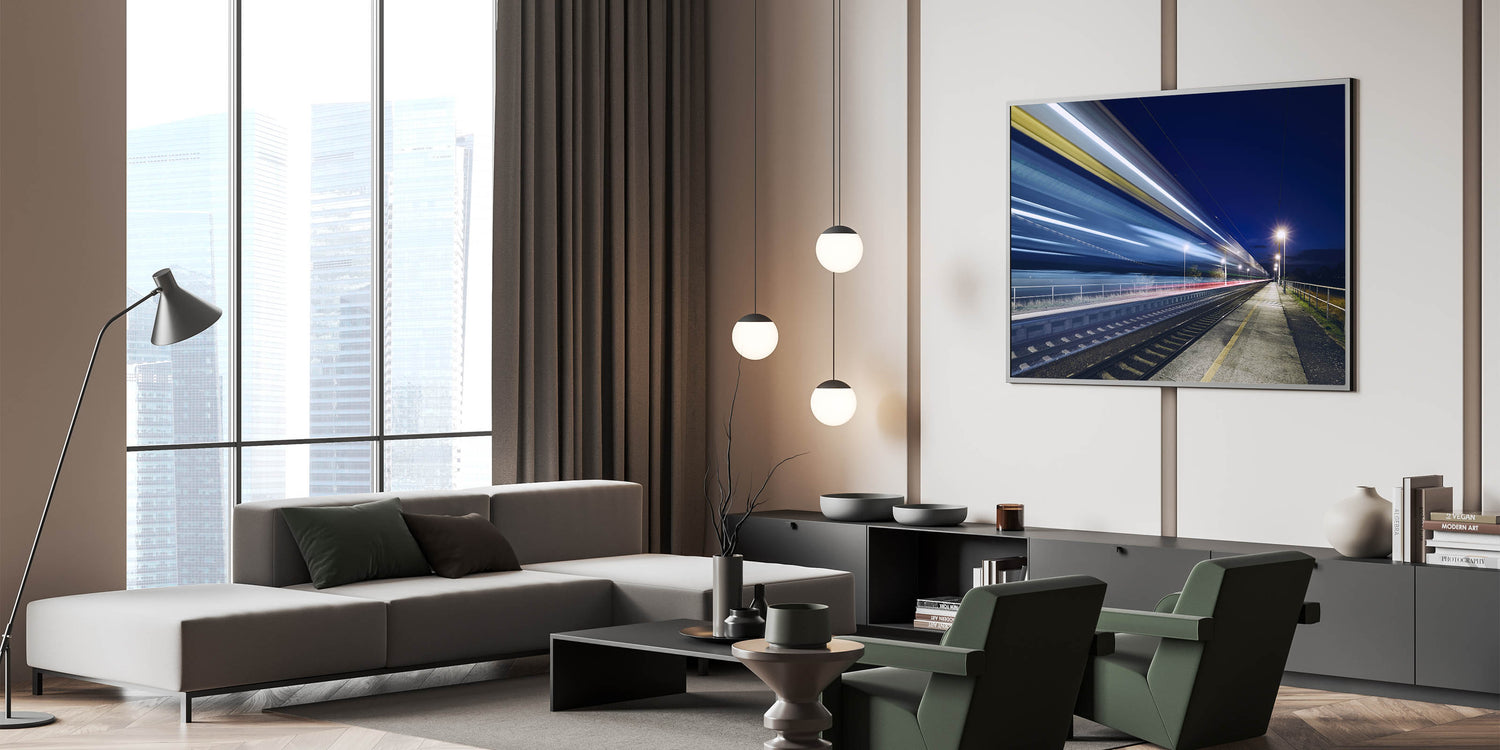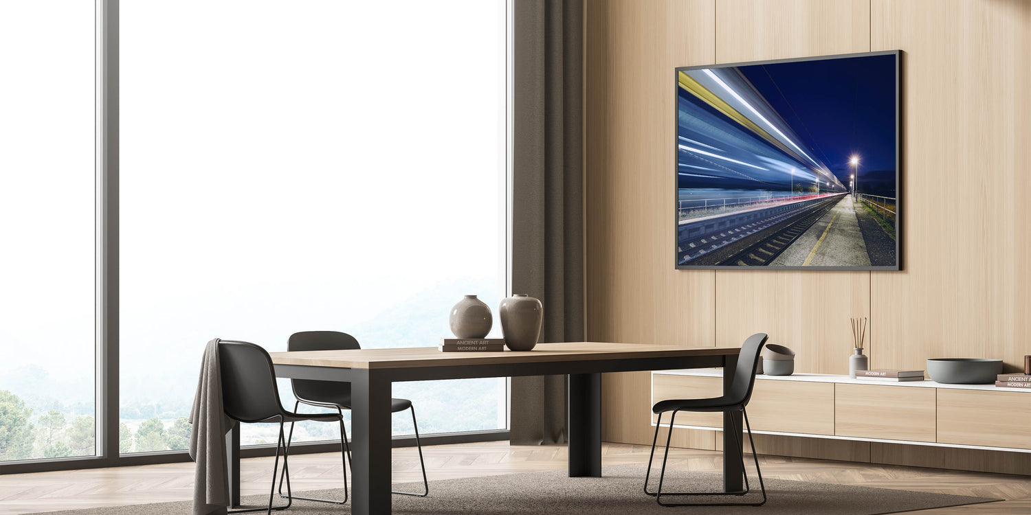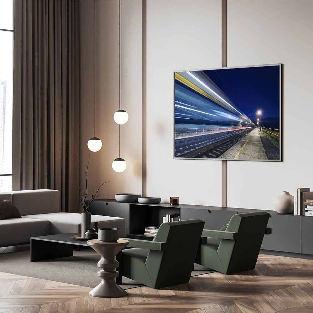 Capture the thrill of motion and the mystery of the night with this dynamic wall art featuring a long-exposure shot of a speeding train. This striking canvas print showcases the vibrant streaks of light left in the train's wake as it races through a quiet station, set against a deep, dark sky. Perfect for modern interiors, this piece adds a sense of energy and movement, making it an ideal choice for those who appreciate contemporary, urban-inspired decor.