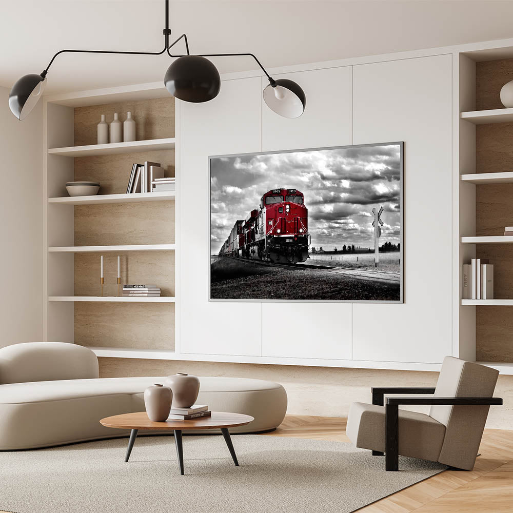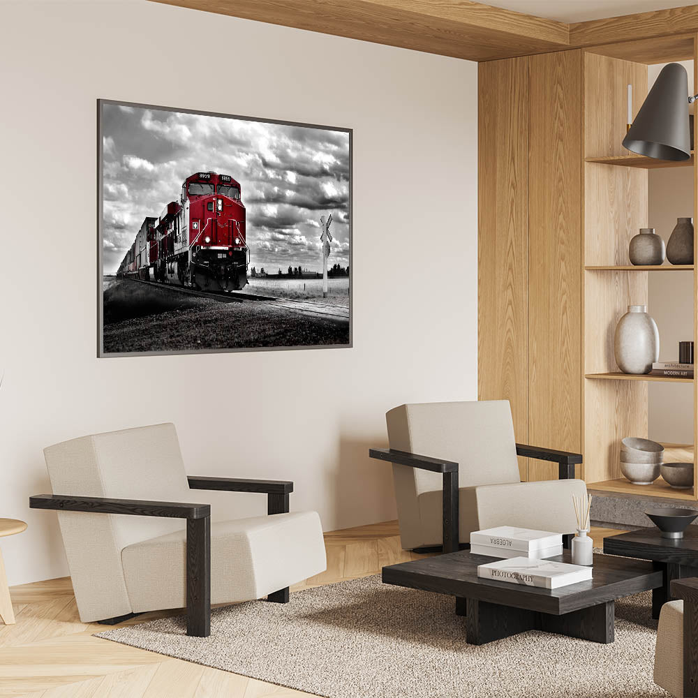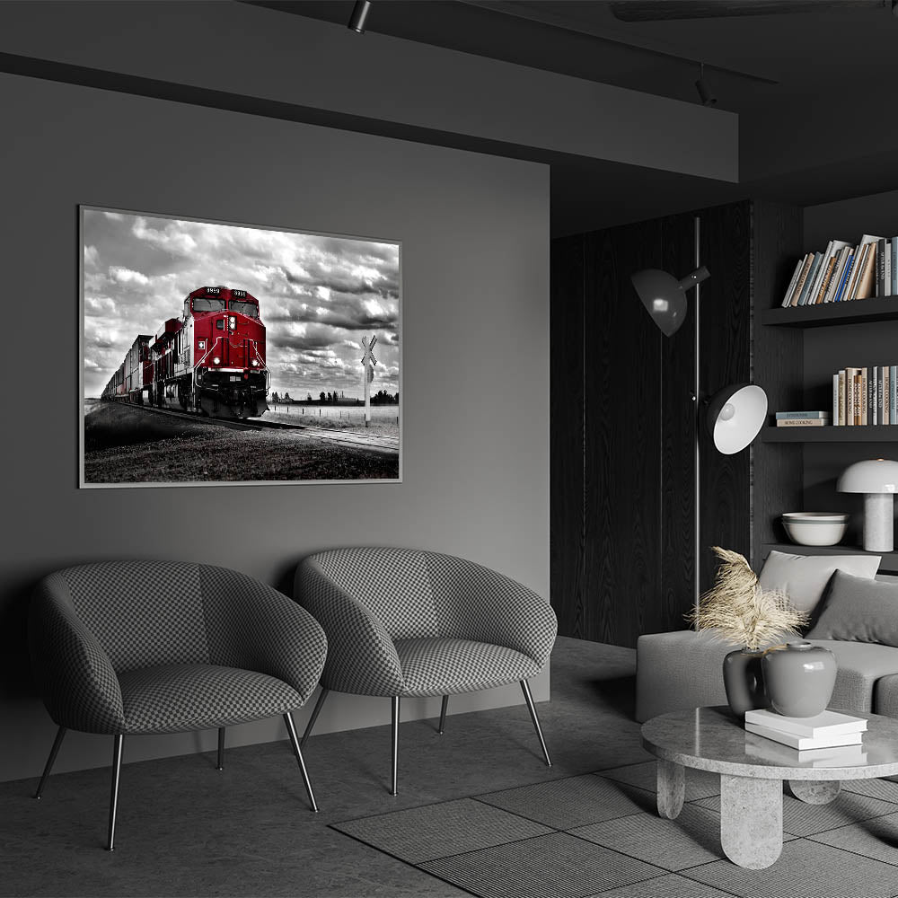 - Bold and Dramatic: The vivid red locomotive against the grayscale background makes for a striking focal point in living rooms, offices, or any area needing a visual impact.