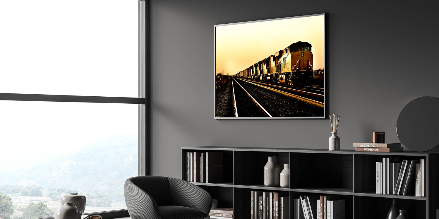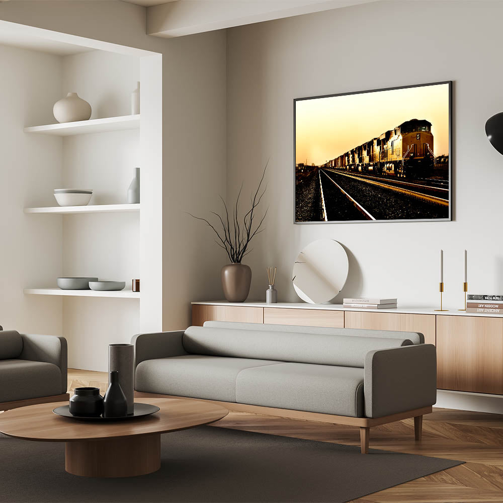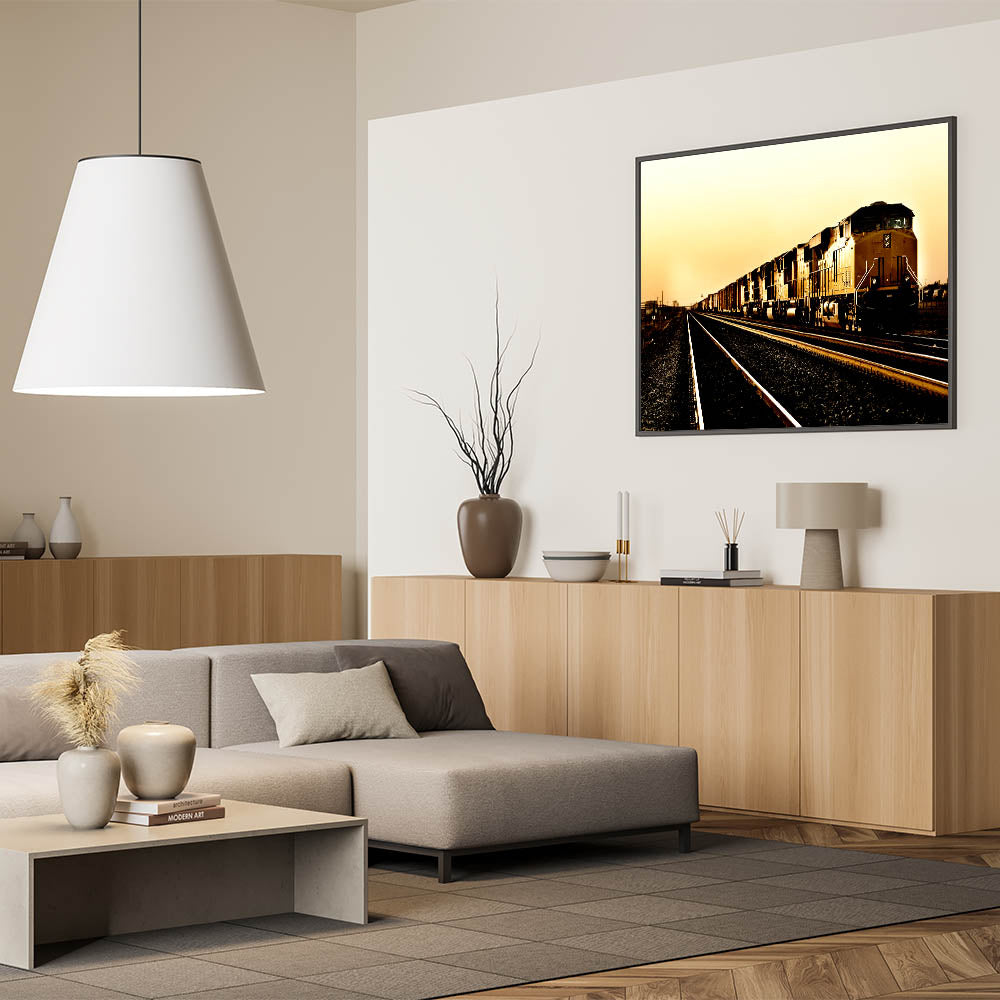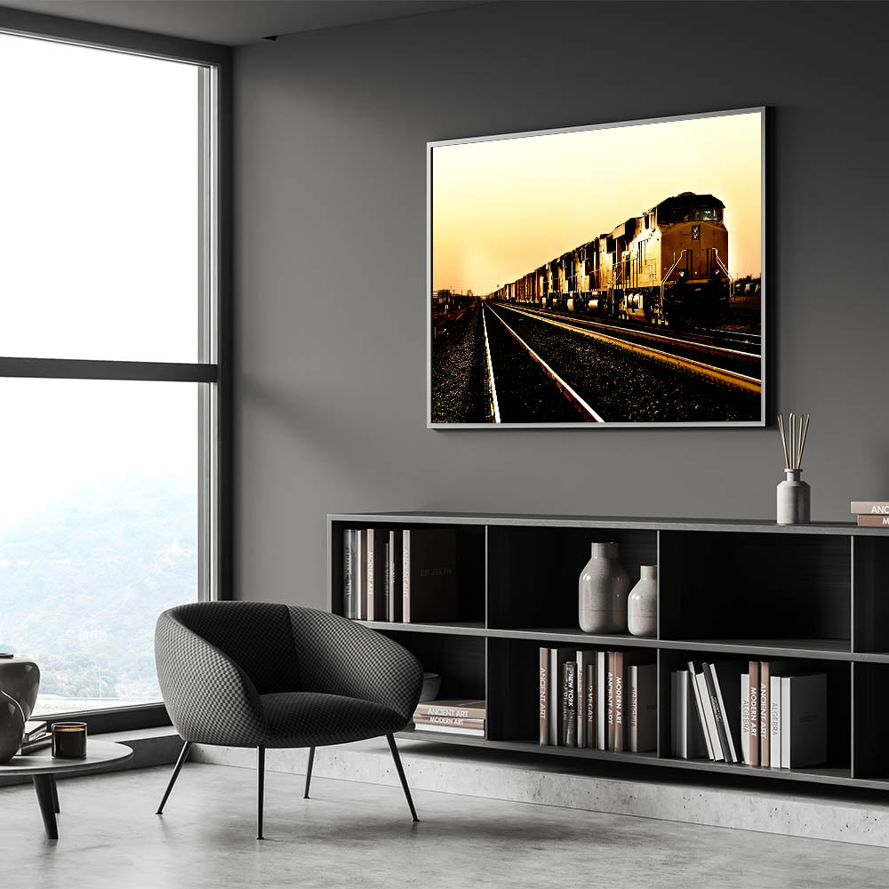 Transform your space with this striking sunset freight train wall art, a perfect blend of modern design and industrial charm. This captivating artwork features a long freight train stretching into the distance, bathed in the warm, golden hues of a setting sun. Ideal for those who appreciate the rugged beauty of trains and the serene beauty of twilight, this piece adds a touch of elegance and motion to any room.