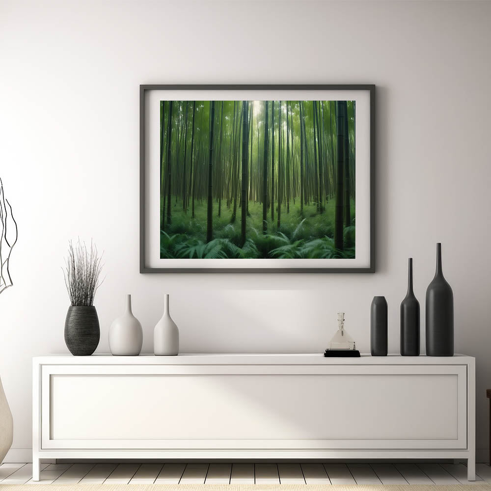 Step into the tranquil beauty of nature with this stunning bamboo forest wall art from our "Trees in Landscapes" collection. This piece captures the serene essence of a lush bamboo forest, with tall, verdant stalks reaching towards the sky, enveloped in soft light that filters through the canopy. Perfect for bringing a sense of peace and calm into your living space, this artwork invites you to escape into the soothing embrace of nature.