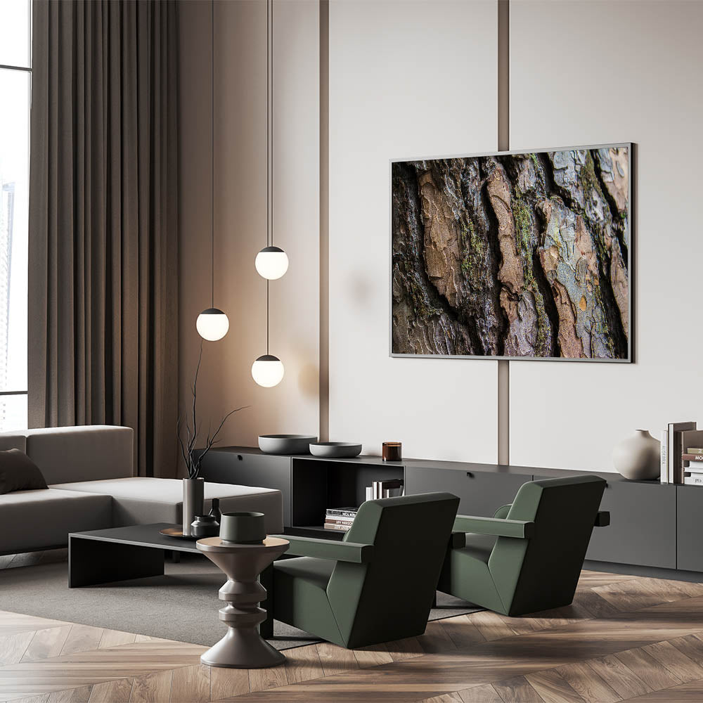 This tree bark close-up offers a striking visual experience, blending the beauty of nature with a contemporary design. Whether you’re looking to create a feature wall or add a subtle touch of nature to your home, this artwork will enhance the overall ambiance of any room with its earthy tones and textures.
