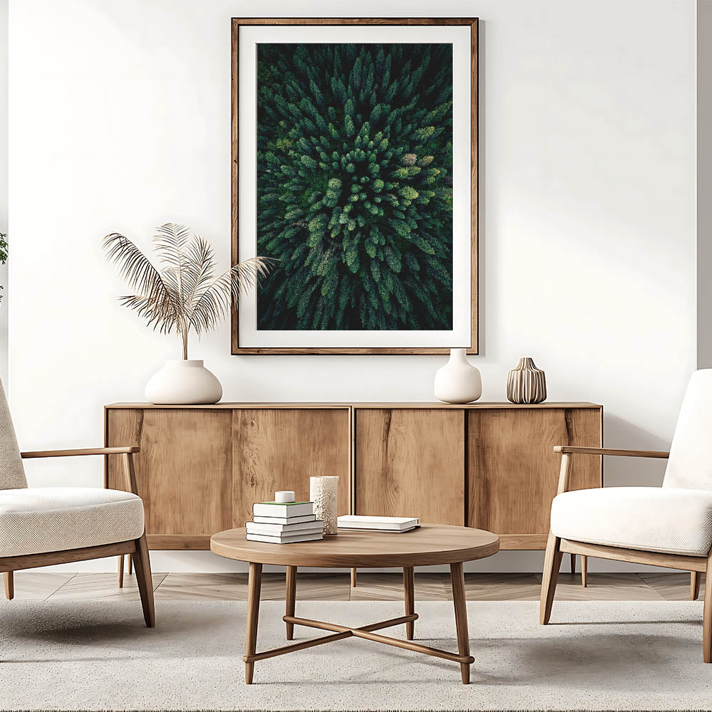 This artwork is ideal for those seeking decorative tree art with a modern twist. The deep greens and textured appearance of the trees are both calming and visually striking. Bring the beauty of the outdoors inside with this modern tree art print, perfect for creating a peaceful and natural ambiance in your space.