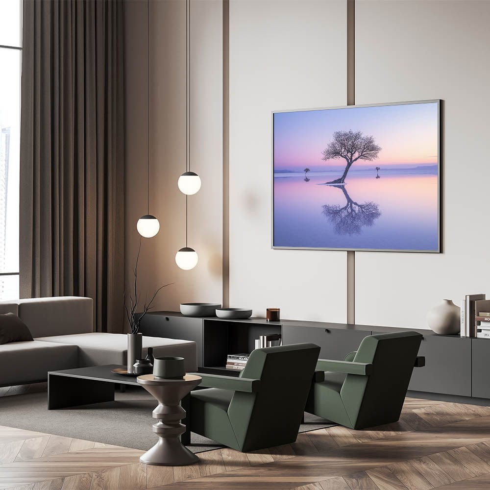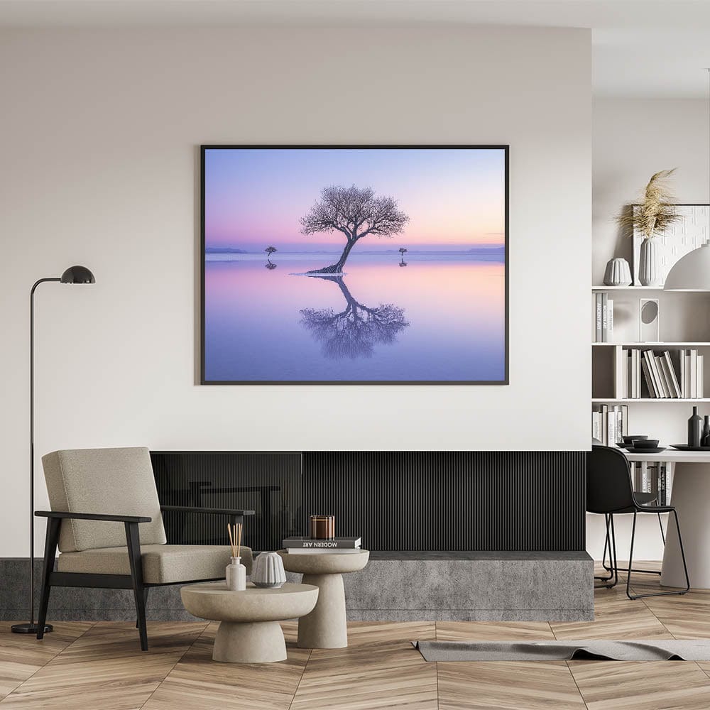 Bring a sense of tranquility into your space with this mesmerizing tree art print, featuring a breathtaking tree reflecting on calm waters. The soft hues of purple, pink, and light blue create a peaceful ambiance, making this landscape art print an exquisite addition to any home or office. This nature-inspired wall art is perfect for those who appreciate minimalistic beauty and the serenity of untouched landscapes.
