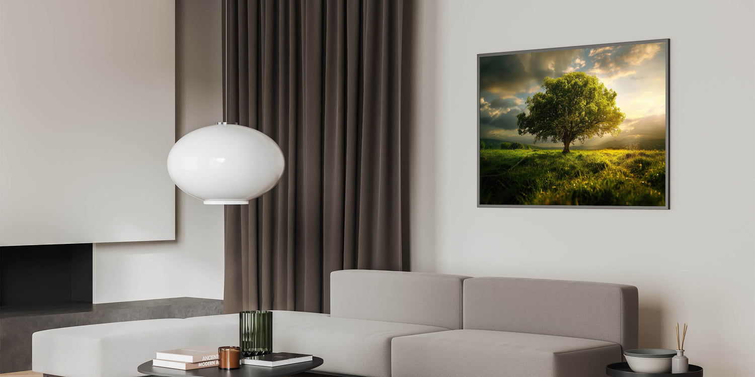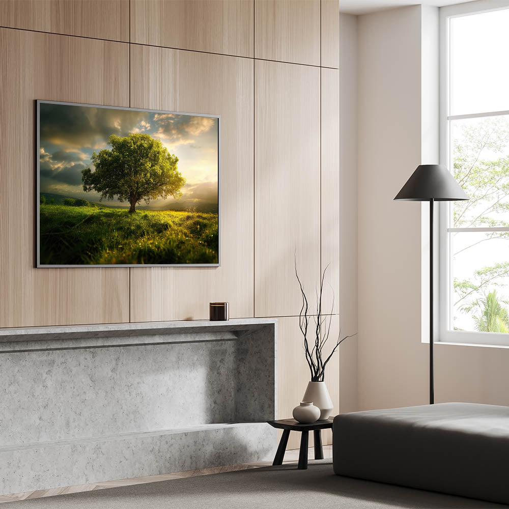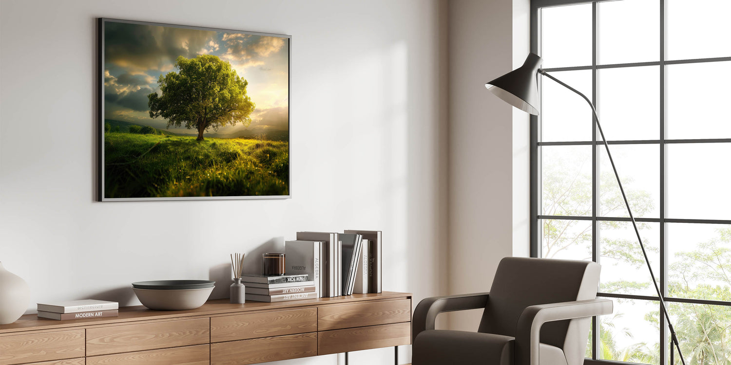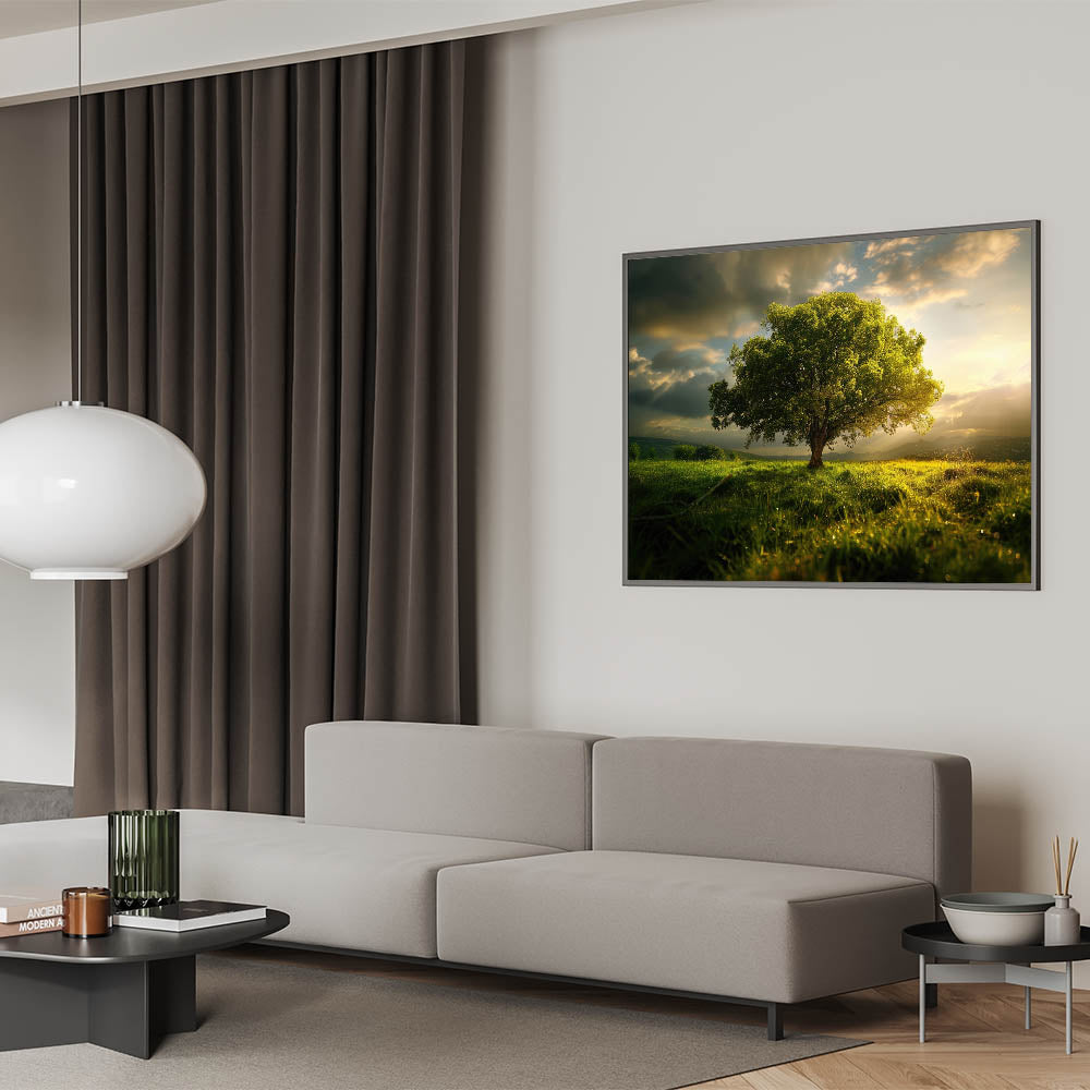 - Design: High-resolution print capturing the intricate details of the tree, the rich greens of the meadow, and the warm, golden light of the setting sun.