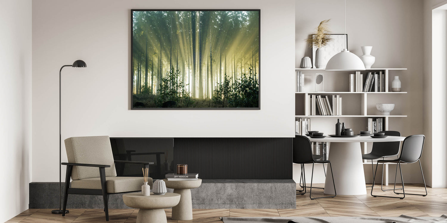 Sunbeams Through Forest Trees - Serene Nature Wall Art in Landscape Prints