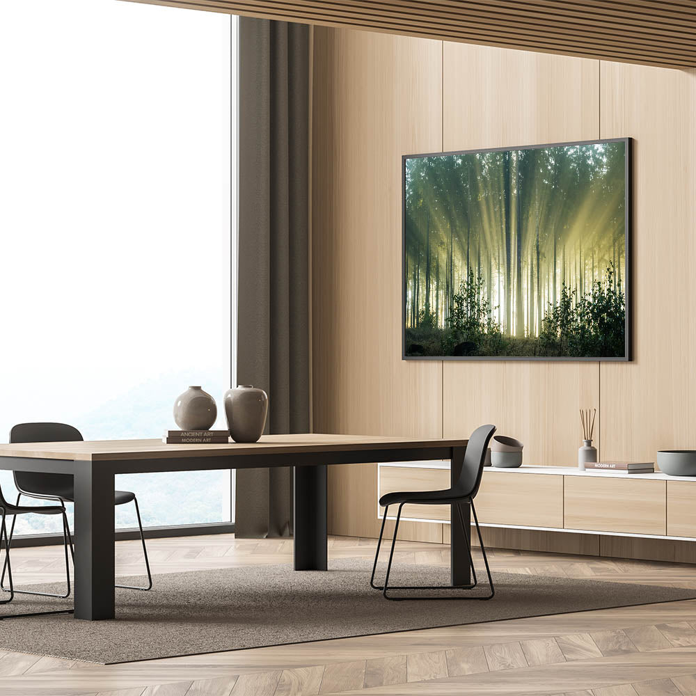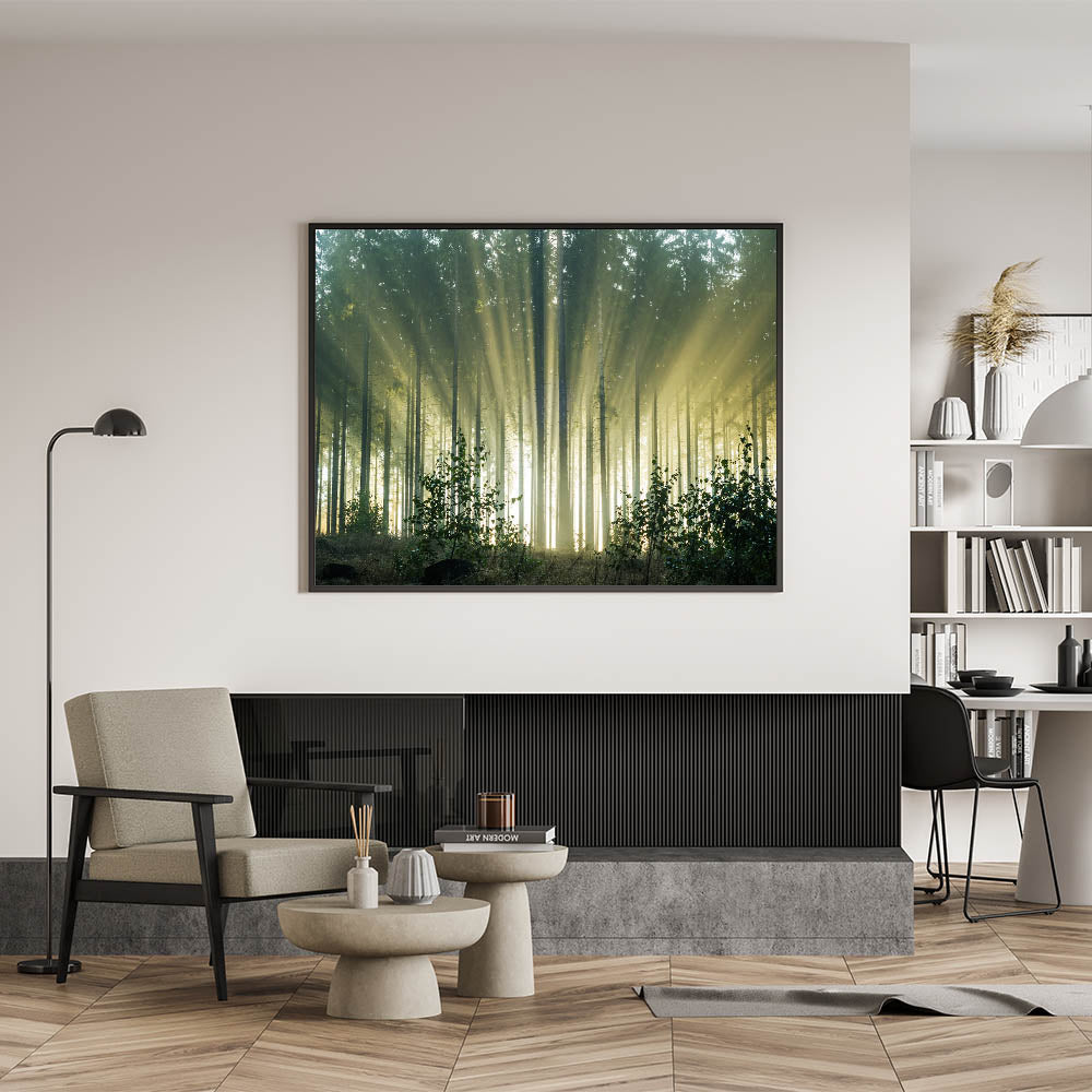 Experience the tranquil beauty of a sunlit forest with this stunning wall art that captures the soft morning sunbeams filtering through towering trees. The gentle rays of sunlight create a mesmerizing display of light and shadow, bringing a sense of peace and calm to any room. This artwork is perfect for nature lovers and those who seek to bring the serenity of the outdoors into their living space.