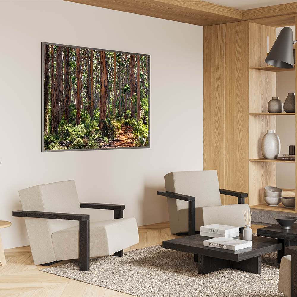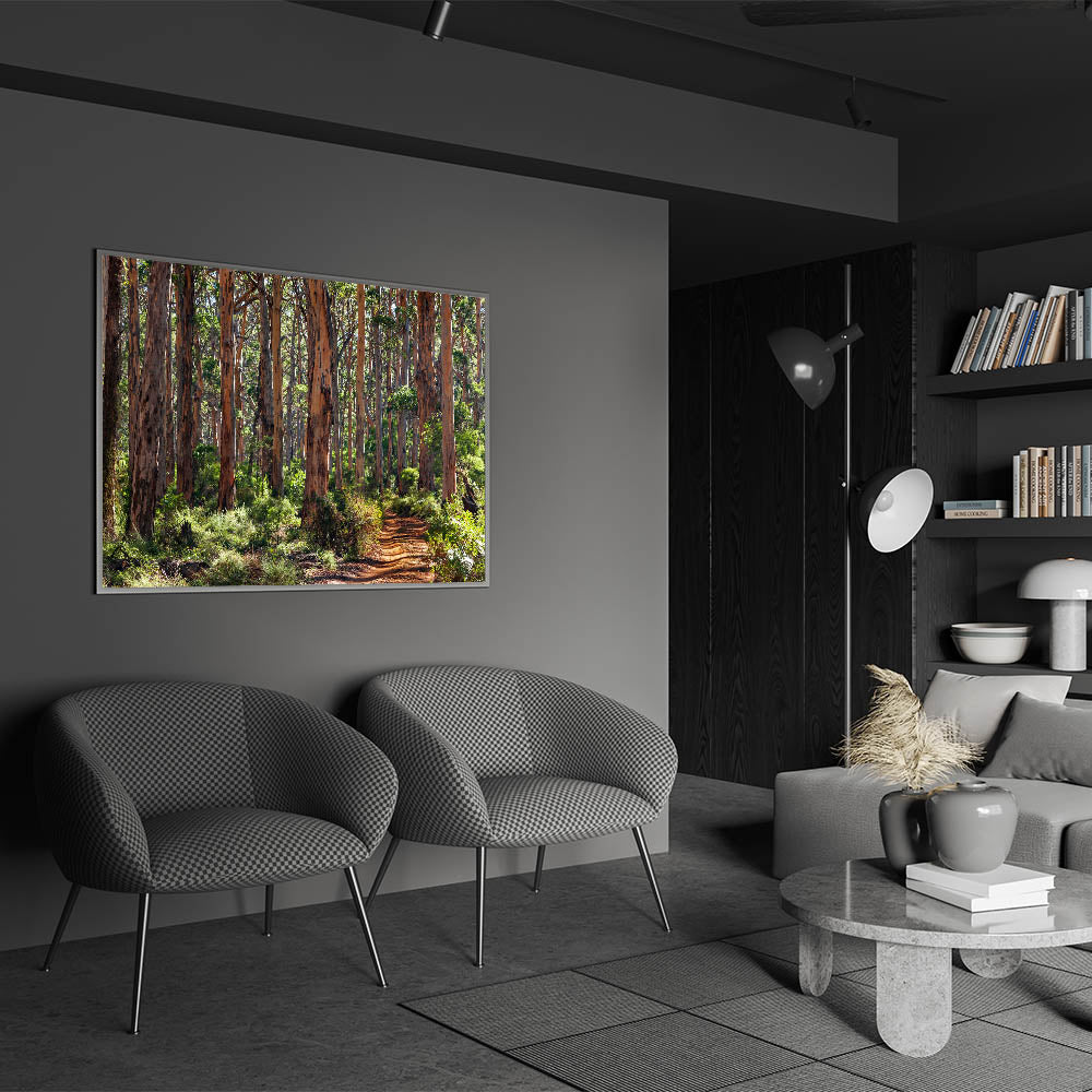 Capture the essence of a tranquil walk through the woods with this stunning piece of tree wall art. The artwork showcases a sunlit forest path winding through tall, majestic trees, creating an inviting and peaceful atmosphere in any room.